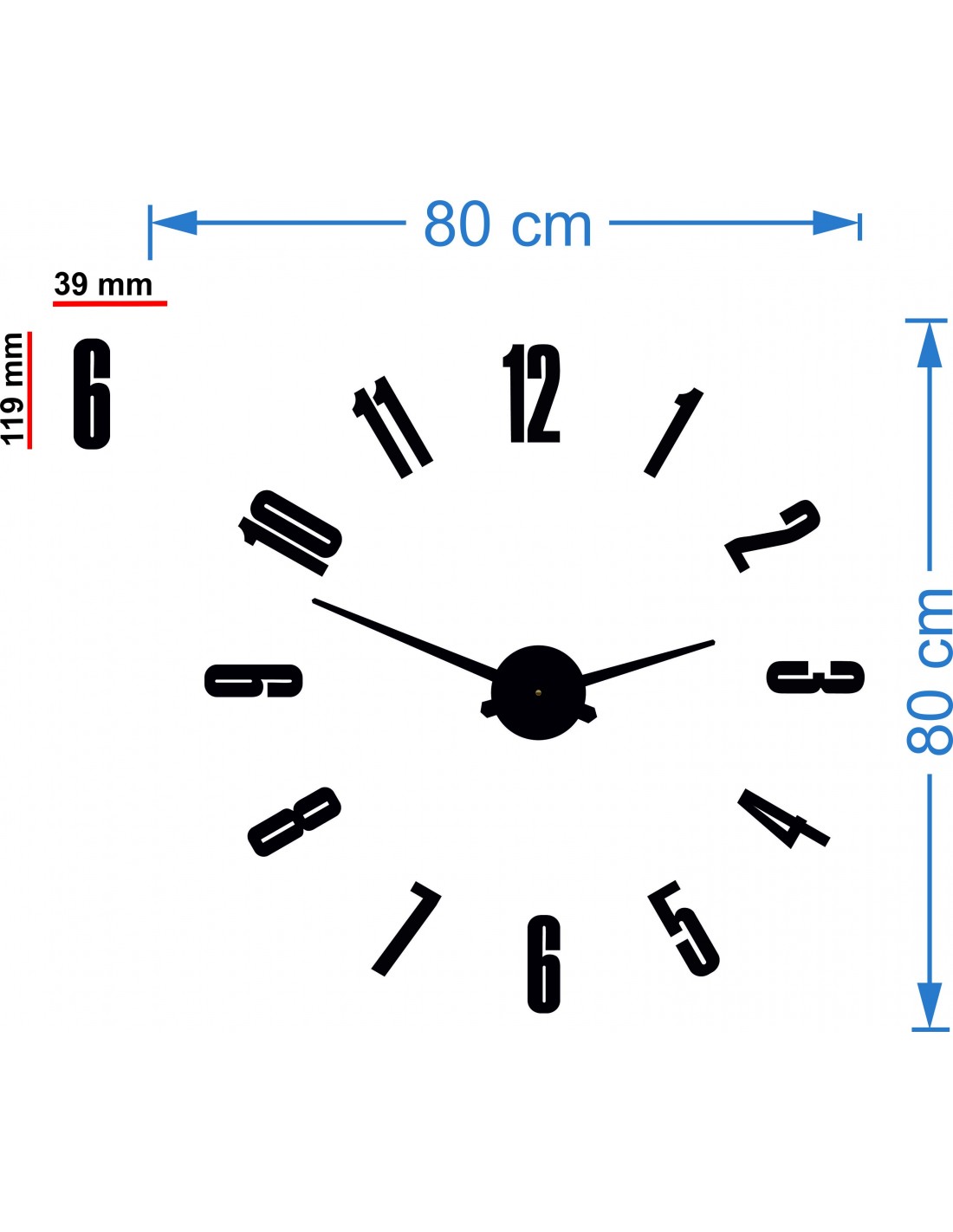 Aufklebermaße: 800 x 800 mm, vergrößerbar bis 1300 x 1300 mm. Uhrwerkmaße: 100 x 100 mm. Zeigerlänge: 30 - 40 cm.