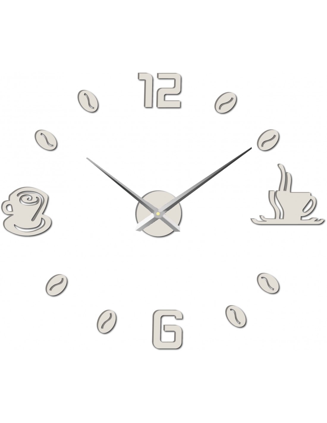 Mit einem überwiegend weißen Hintergrund und kräftigen Ziffern wirkt die Uhr klar und übersichtlich. Kaffeebohnen als Uhr der Marke sorgen für optische Wirkung, während Kaffeetassen-Symbole auf 3 und 9 Uhr das Kaffeethema zusätzlich betonen.