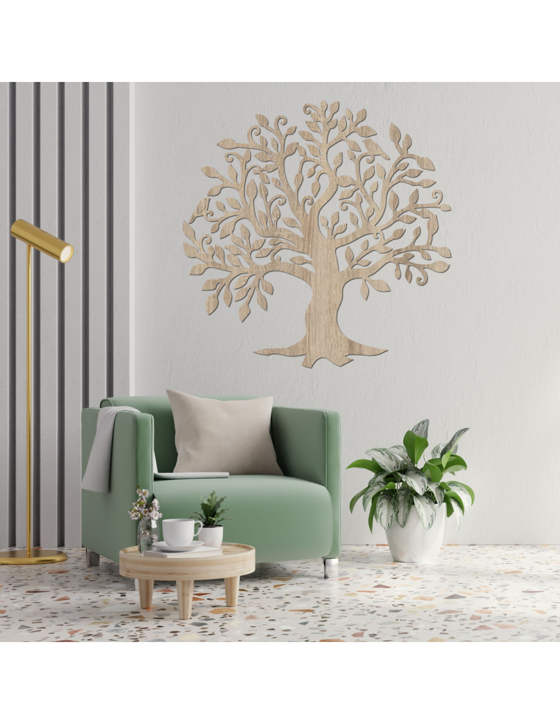 Hölzerner Lebensbaum – ein einzigartiges Bild, das Harmonie und natürliche Schönheit in den Innenraum bringt.