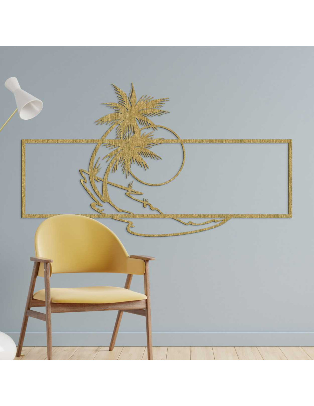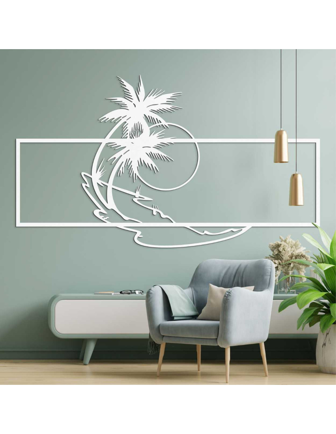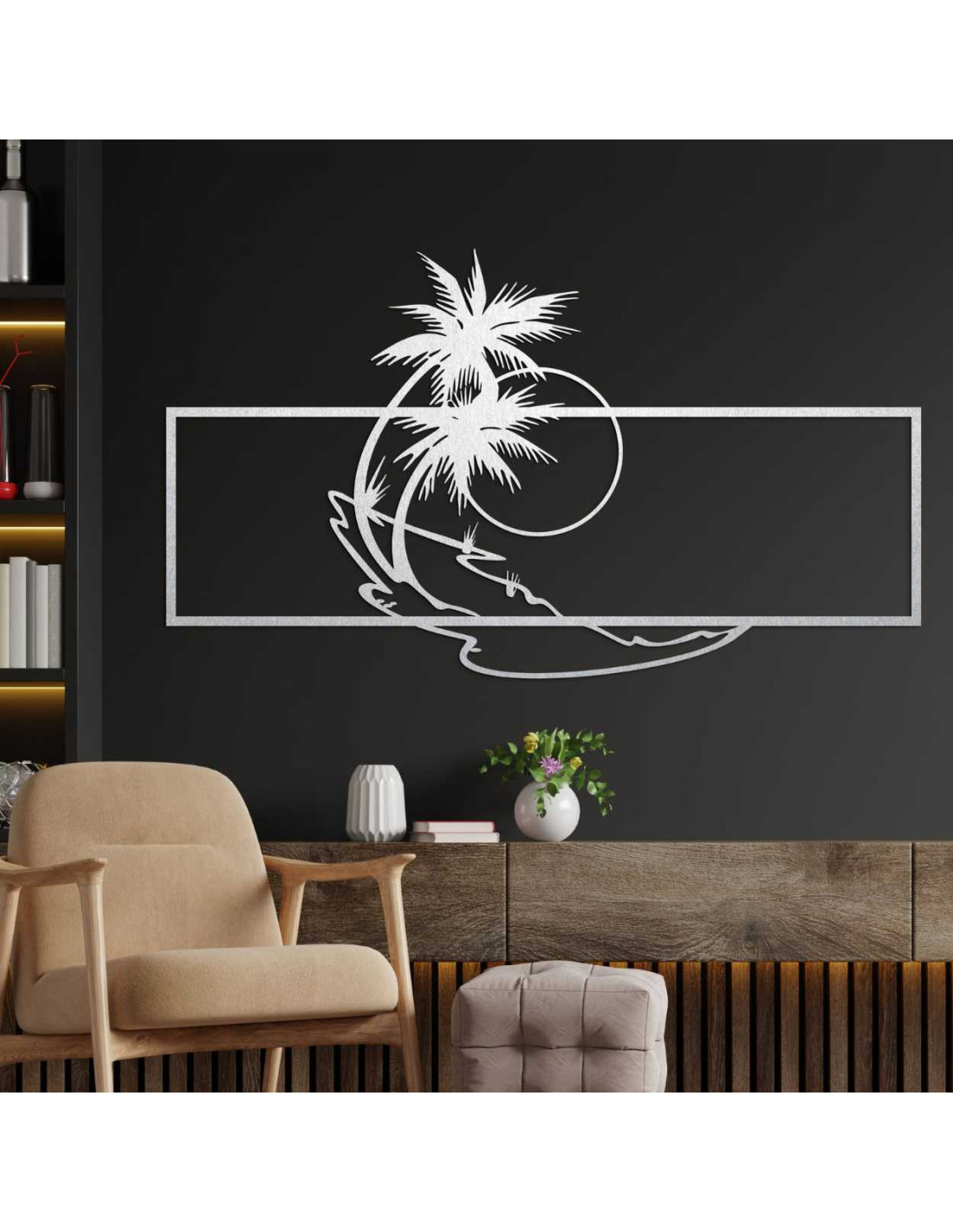 Die Metalldekoration mit Palmen- und Strandmotiv wirkt minimalistisch, bringt aber gleichzeitig einen Hauch Exotik ins Interieur.