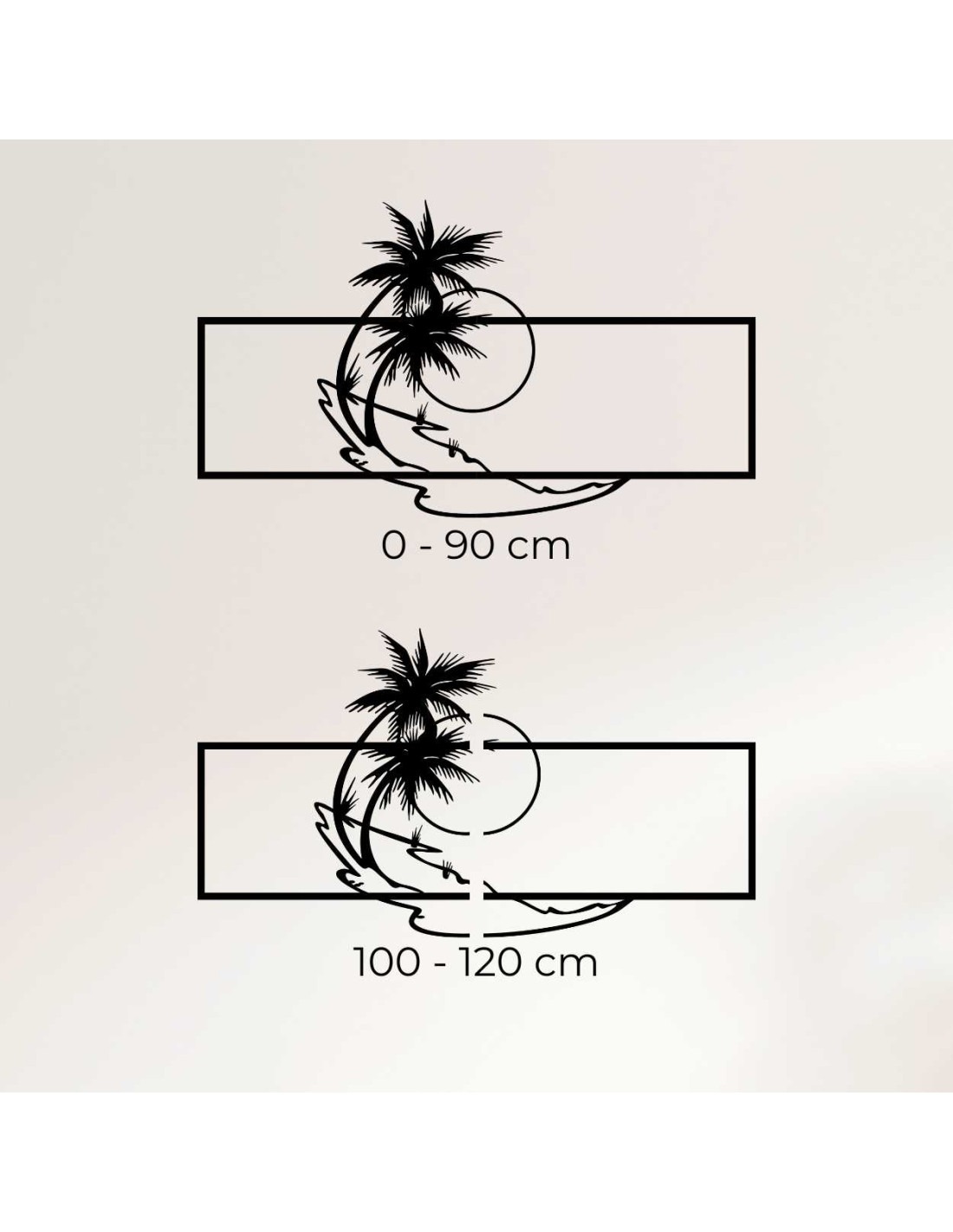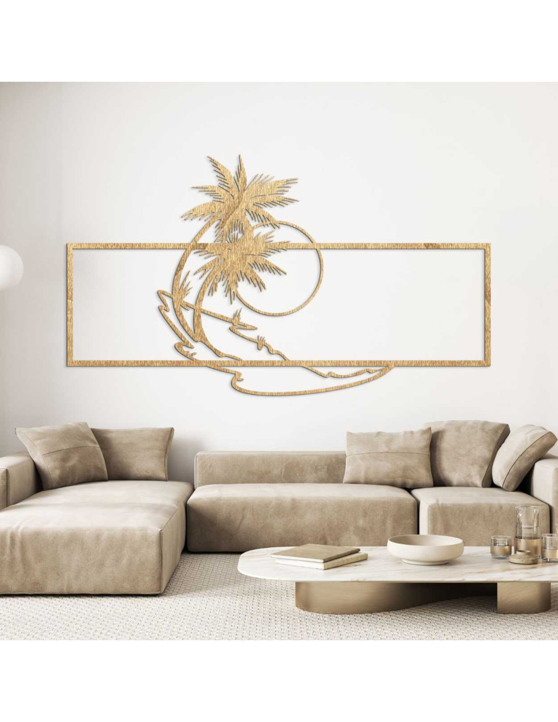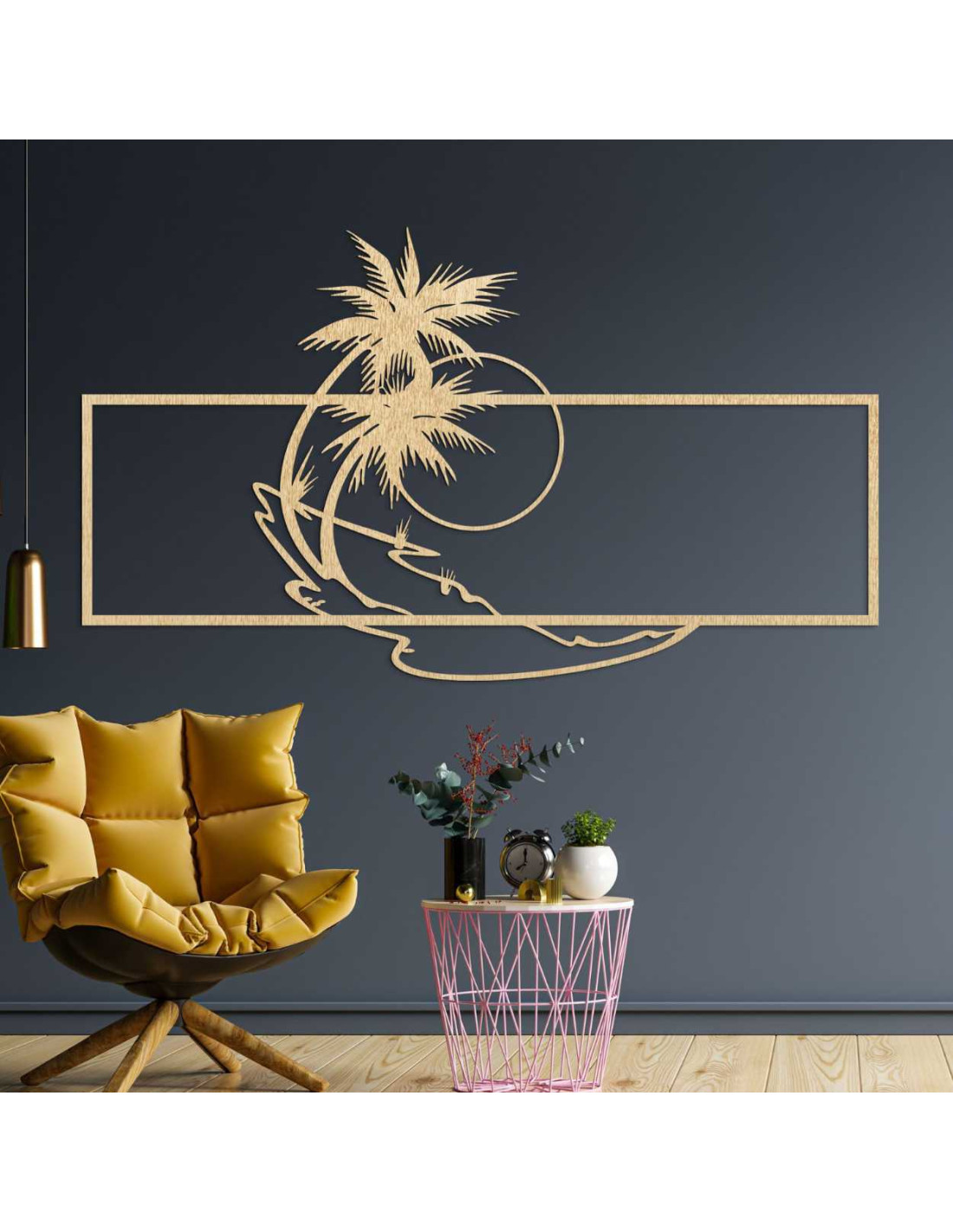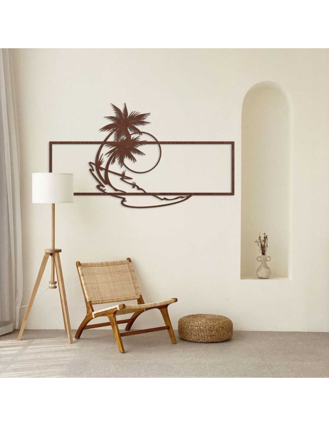 Die Metalldekoration mit Palmen- und Strandmotiv wirkt minimalistisch, bringt aber gleichzeitig einen Hauch Exotik ins Interieur.