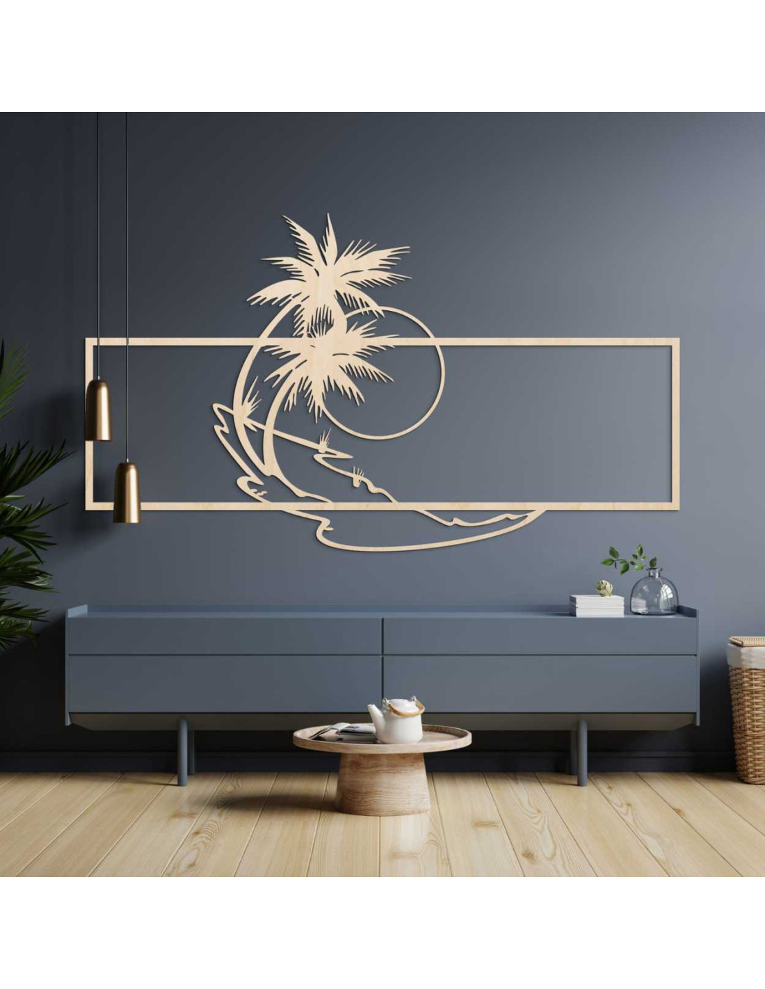 Natürliche Wanddekoration aus Holz mit Palmen- und Strandmotiv