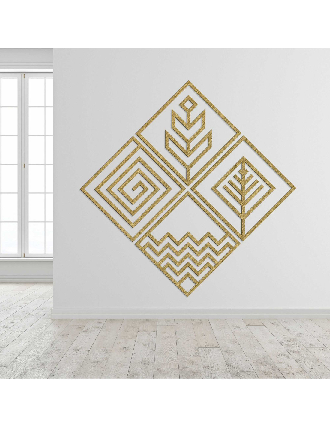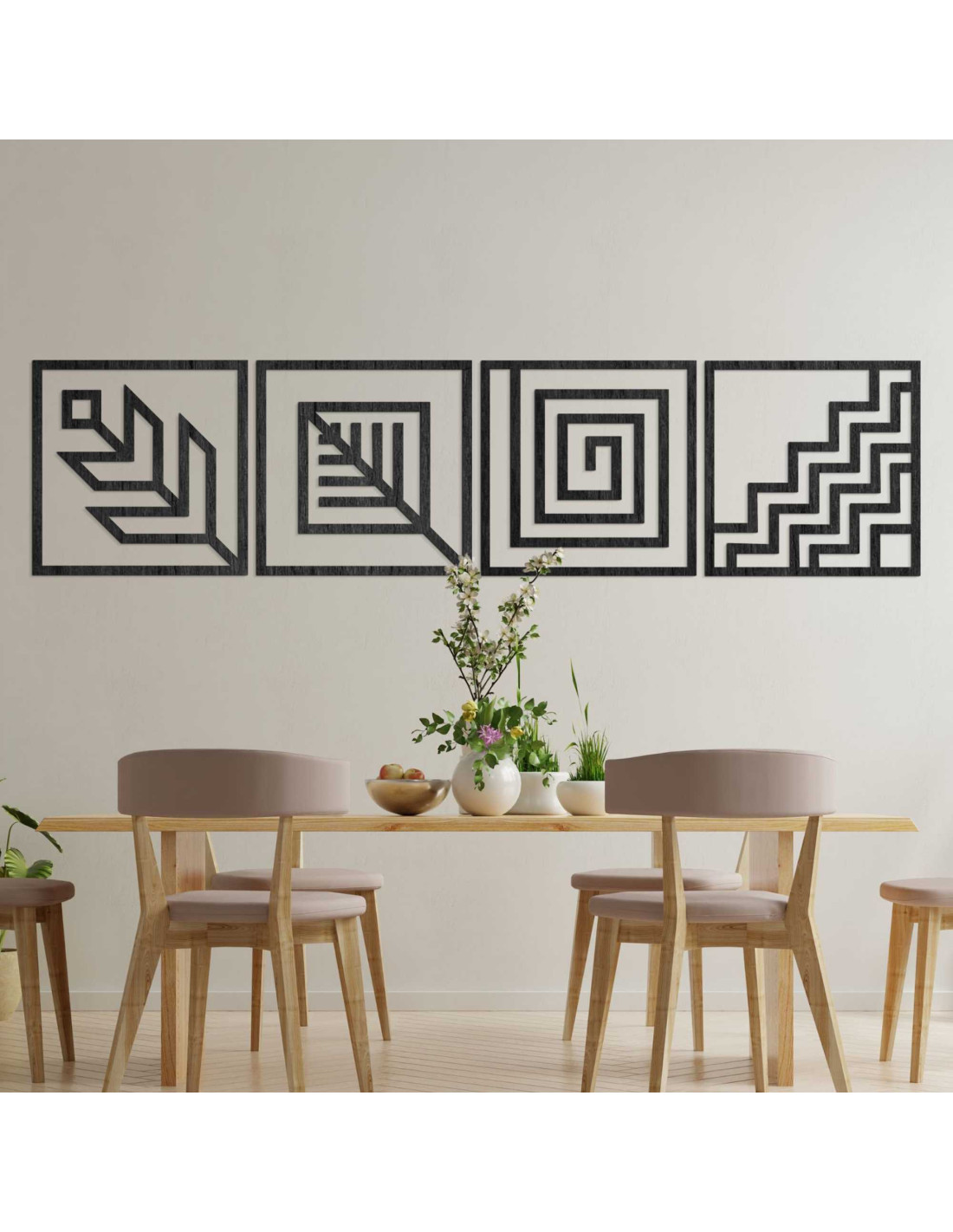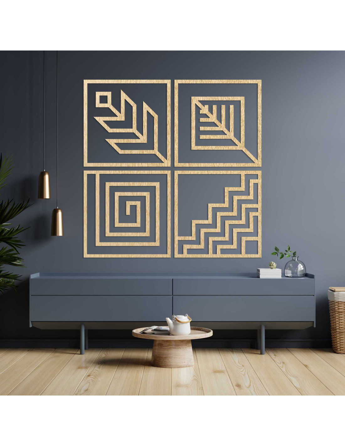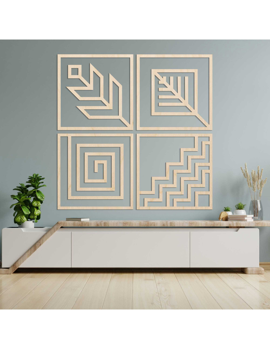 Die Holzlinien bilden vier abstrakte Motive mit jeweils eigener Struktur . Zwei davon sind von natürlichen, blattähnlichen Formen inspiriert, während die anderen beiden geometrische Formen in den Vordergrund stellen. Die Oberfläche wirkt dank der dezenten Holzmaserung organisch und unterstreicht den natürlichen Charakter des Materials. Das Set besticht durch seine klare Linienführung und verleiht dem Raum Ordnung .