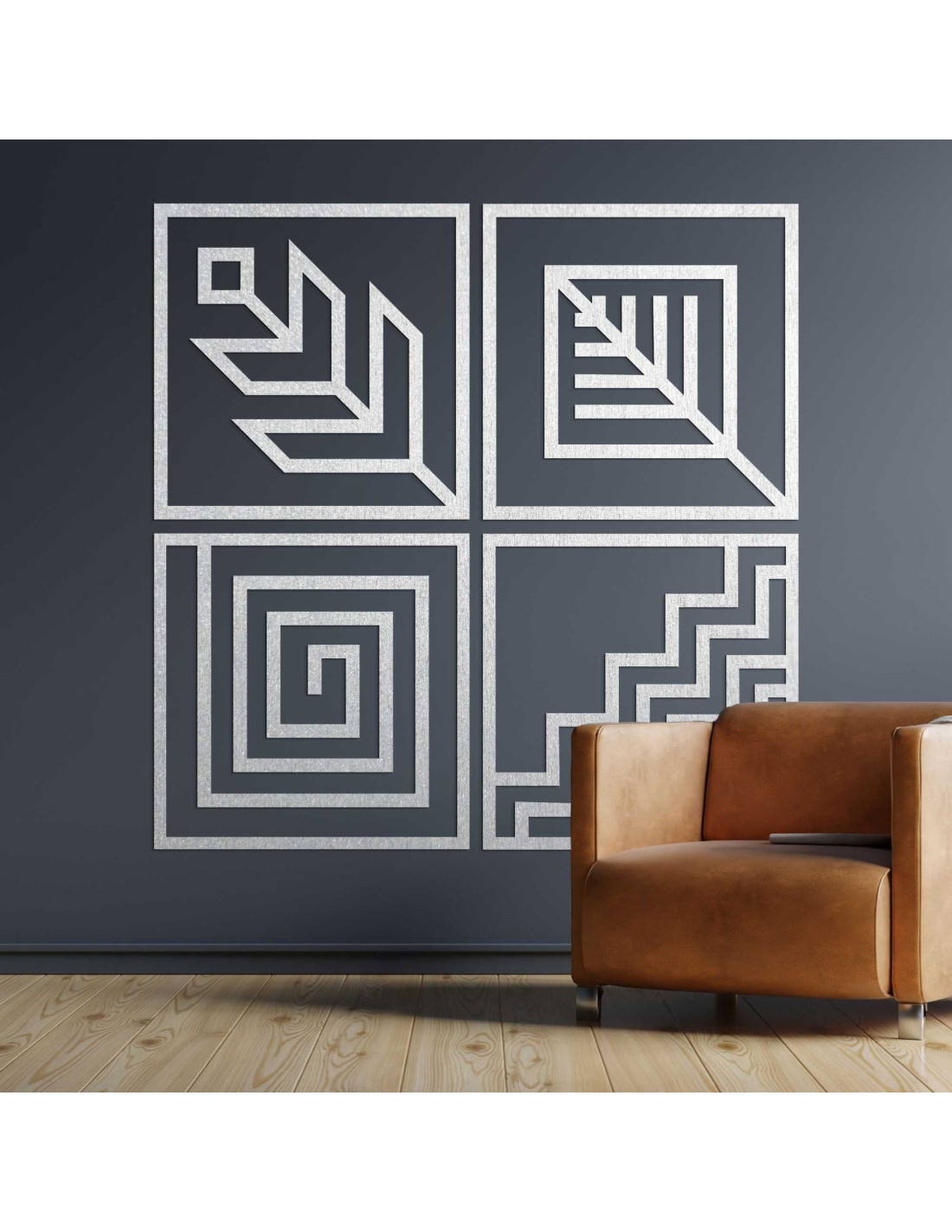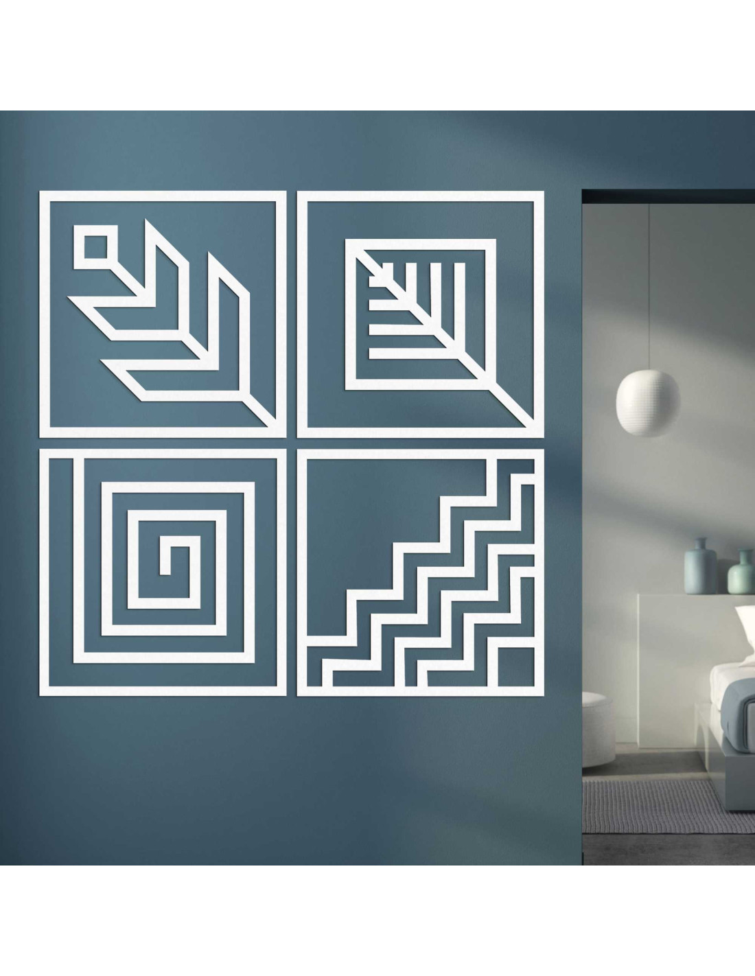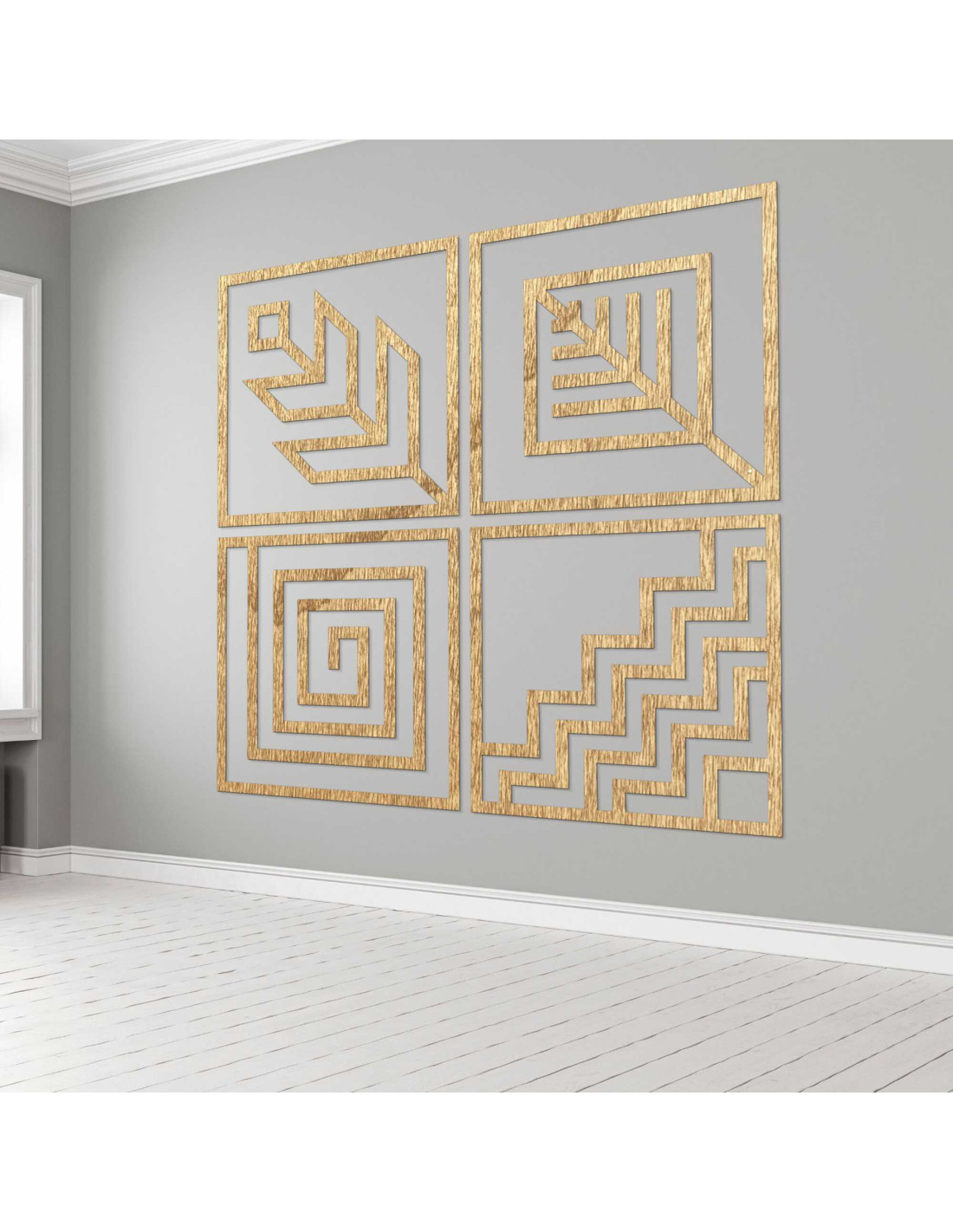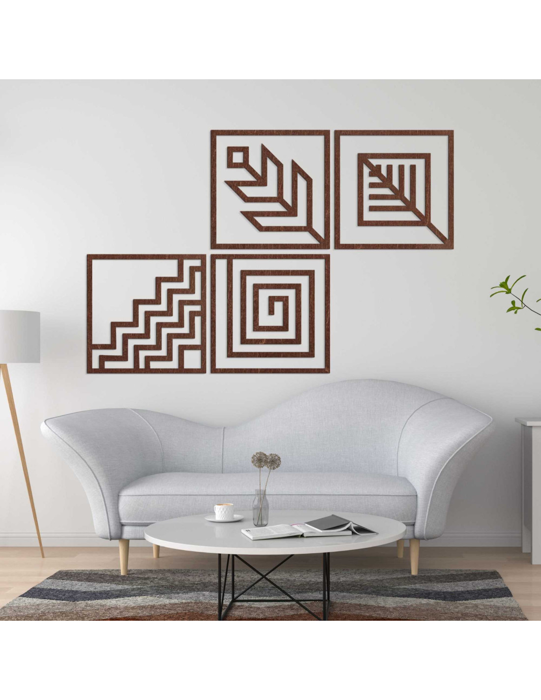 Die Holzlinien bilden vier abstrakte Motive mit jeweils eigener Struktur . Zwei davon sind von natürlichen, blattähnlichen Formen inspiriert, während die anderen beiden geometrische Formen in den Vordergrund stellen. Die Oberfläche wirkt dank der dezenten Holzmaserung organisch und unterstreicht den natürlichen Charakter des Materials. Das Set besticht durch seine klare Linienführung und verleiht dem Raum Ordnung .