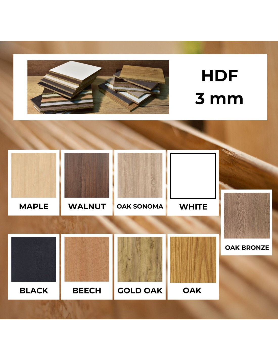 • Sperrholz hat eine Dicke von 5 mm / HDF hat eine Dicke von 3 mm.