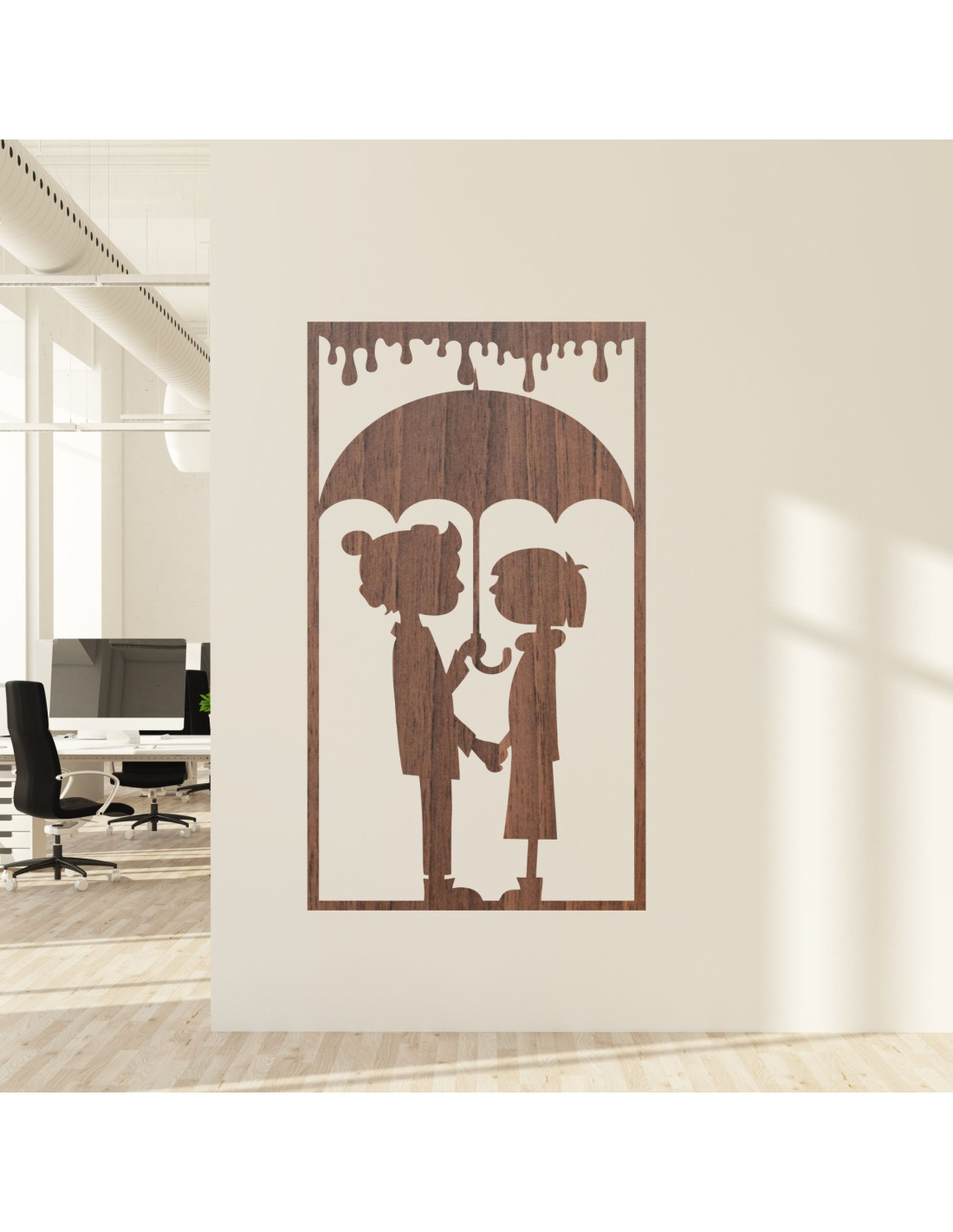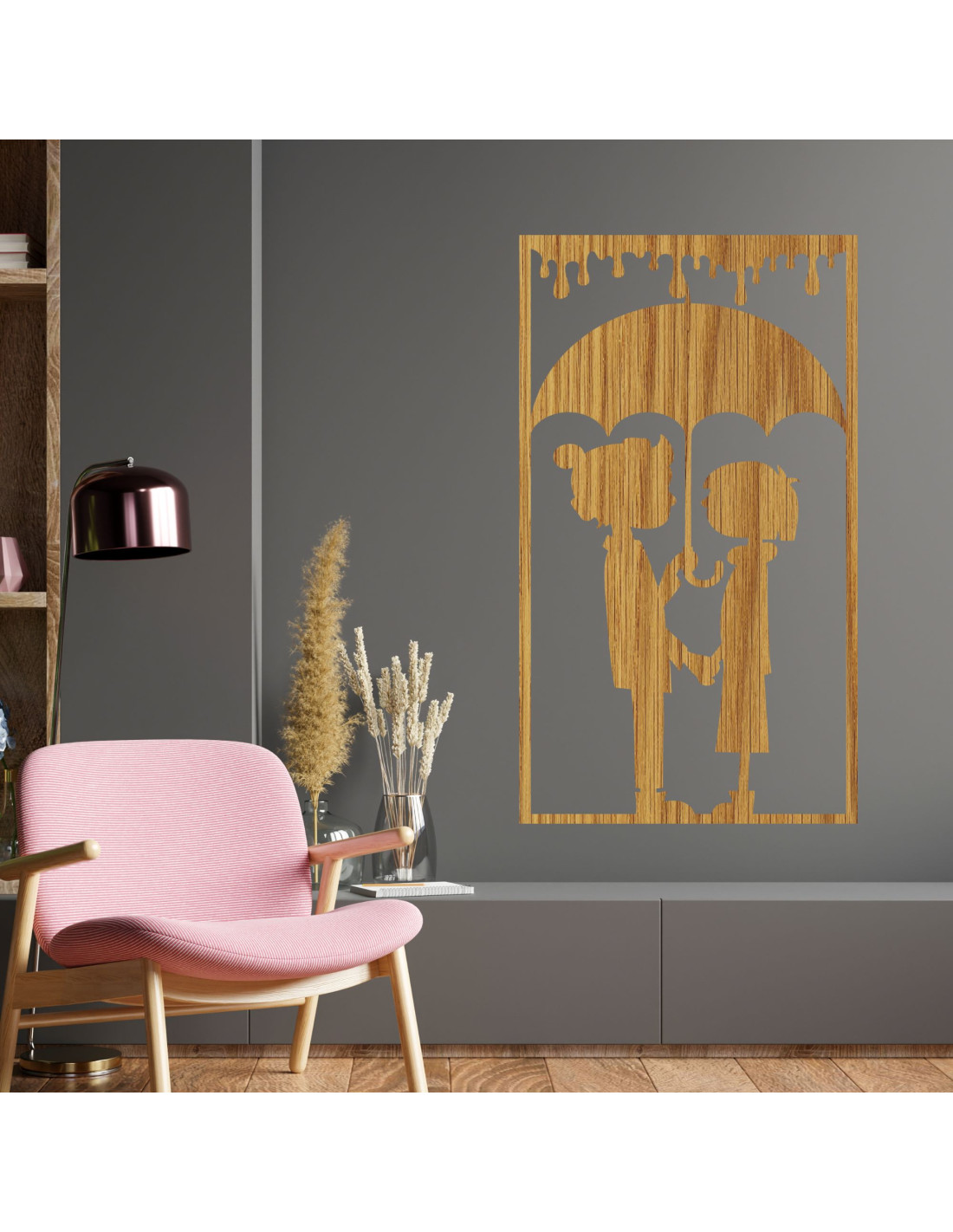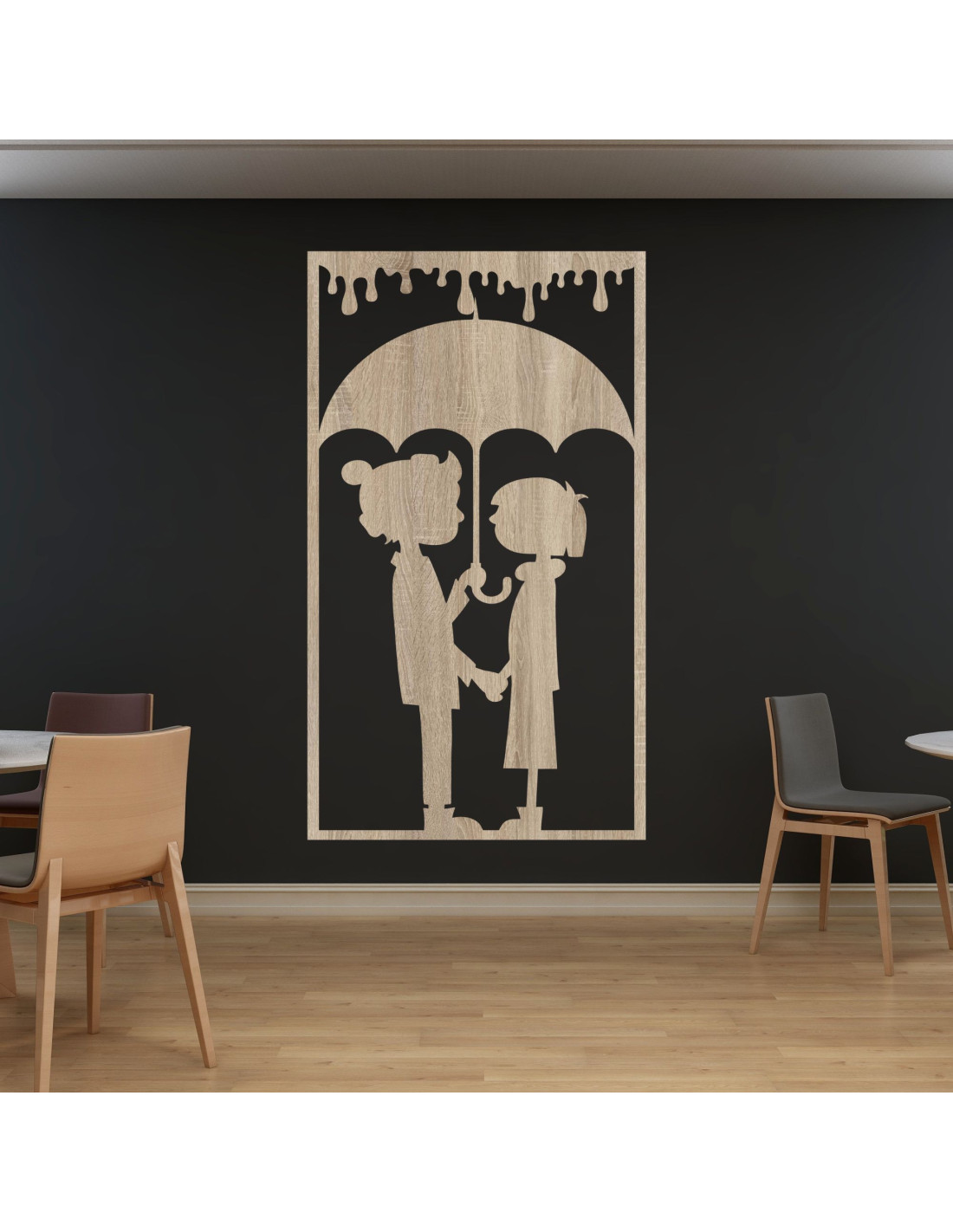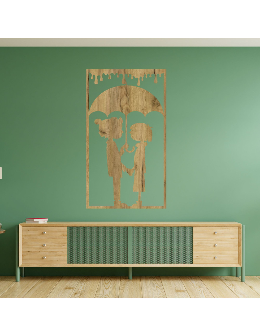 Die elegante Holzdekoration mit dem Motiv von Figuren unter einem Regenschirm verbindet Schlichtheit mit einer starken emotionalen Botschaft. Diese Wanddekoration ist geeignet, um Gefühle wie Liebe, Unterstützung oder Zusammengehörigkeit auszudrücken. Außerdem bringt das natürliche Material ein Gefühl von Wärme und Authentizität in den Raum. Sie eignet sich sowohl für moderne als auch für rustikale Innenräume, wo sie eine harmonische Atmosphäre schafft.
