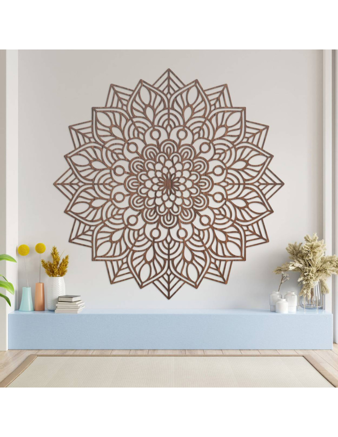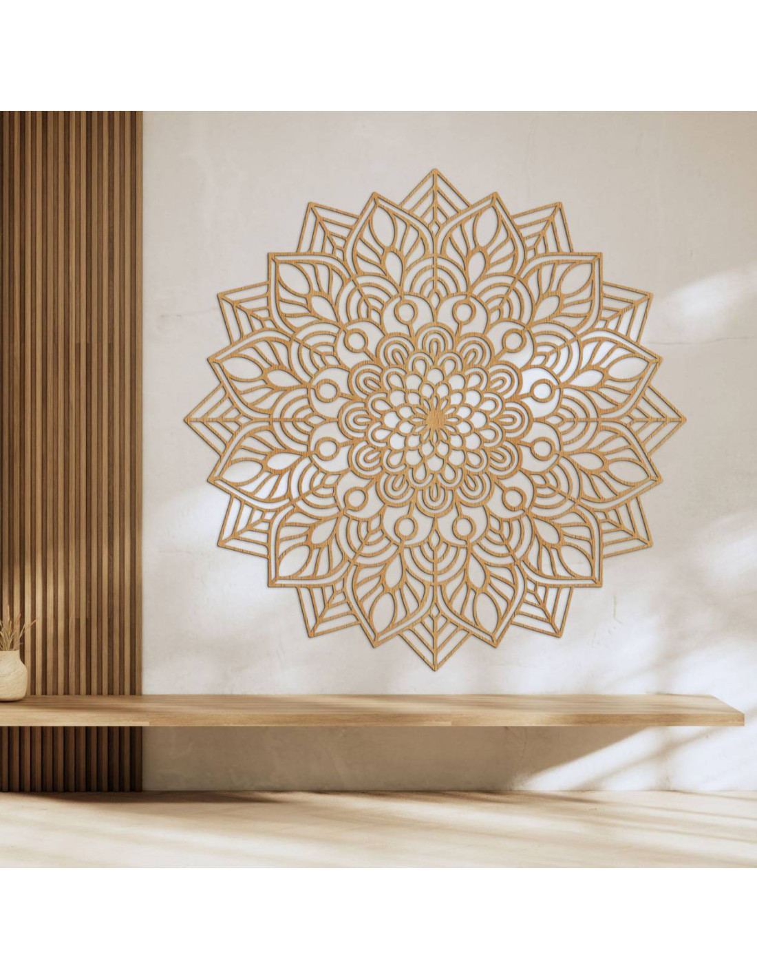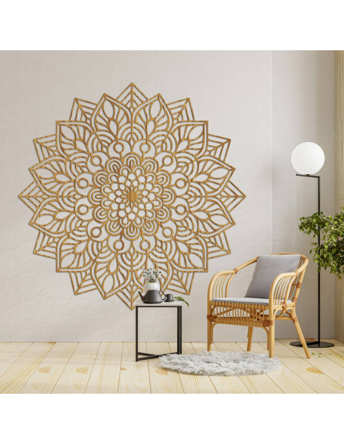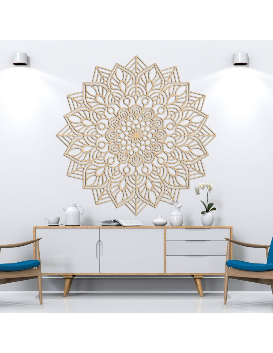 Ein hölzernes Mandala an der Wand bringt Eleganz, Präzision und Harmonie in den Innenraum.