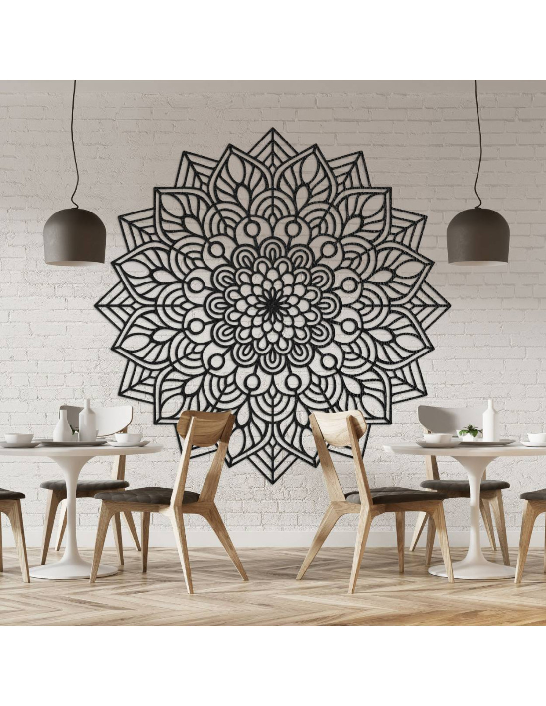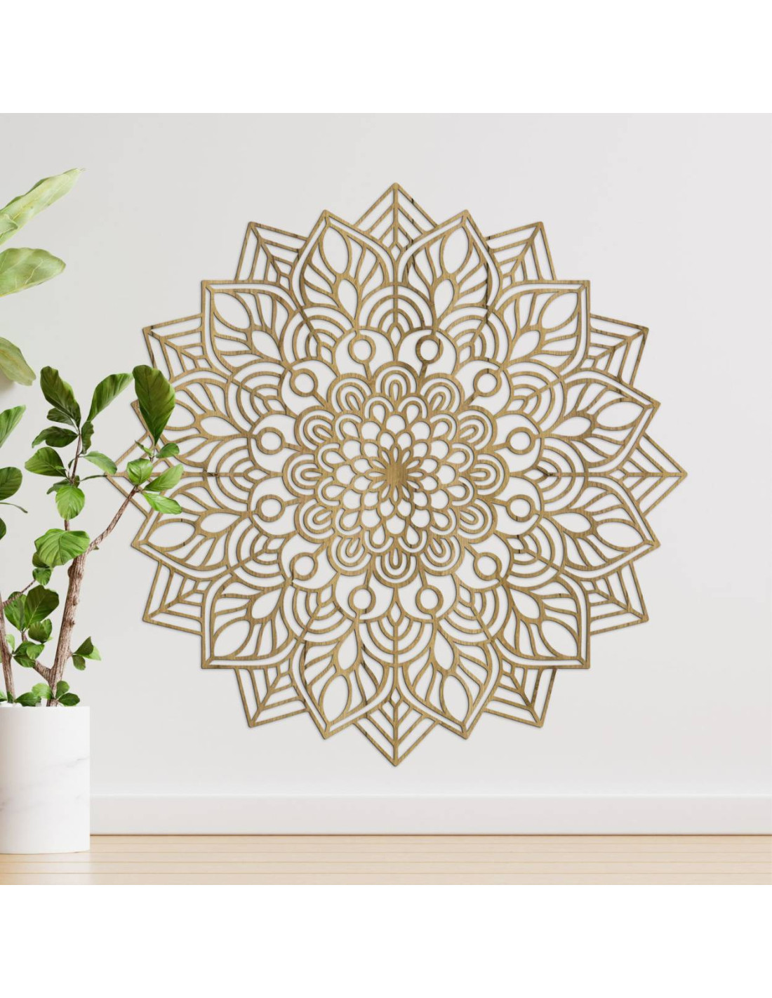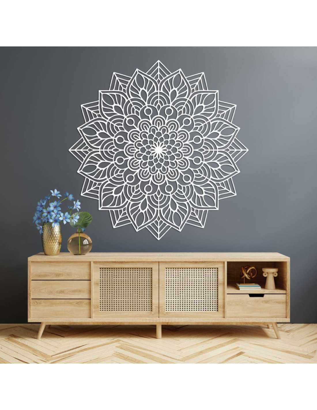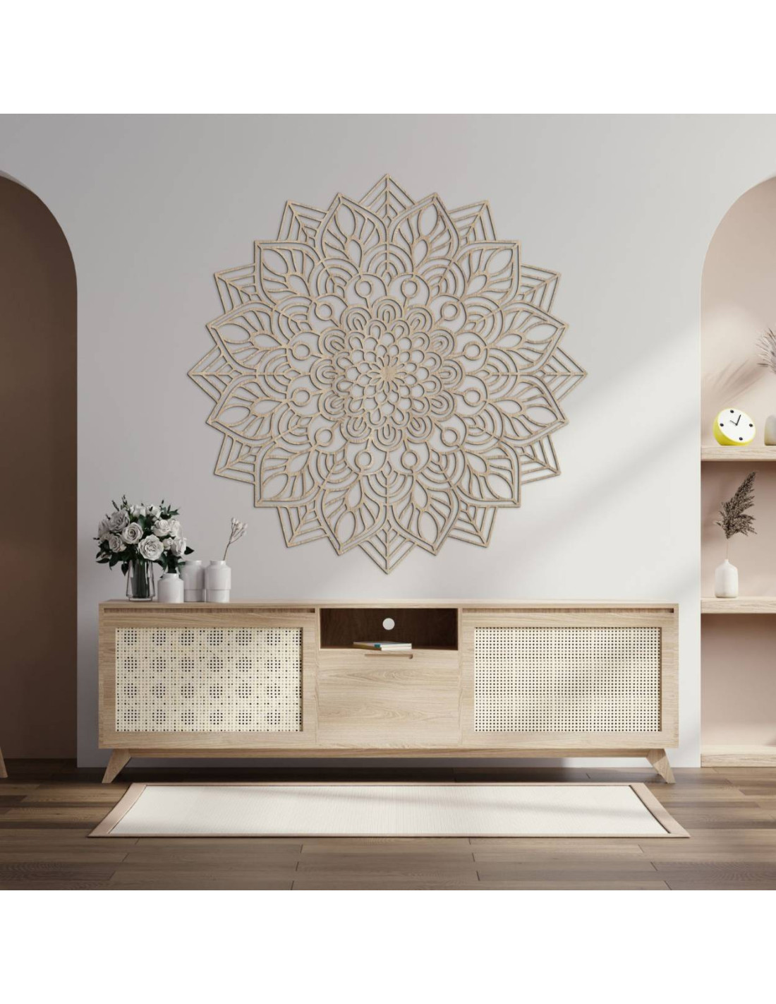 Ein hölzernes Mandala an der Wand bringt Eleganz, Präzision und Harmonie in den Innenraum.