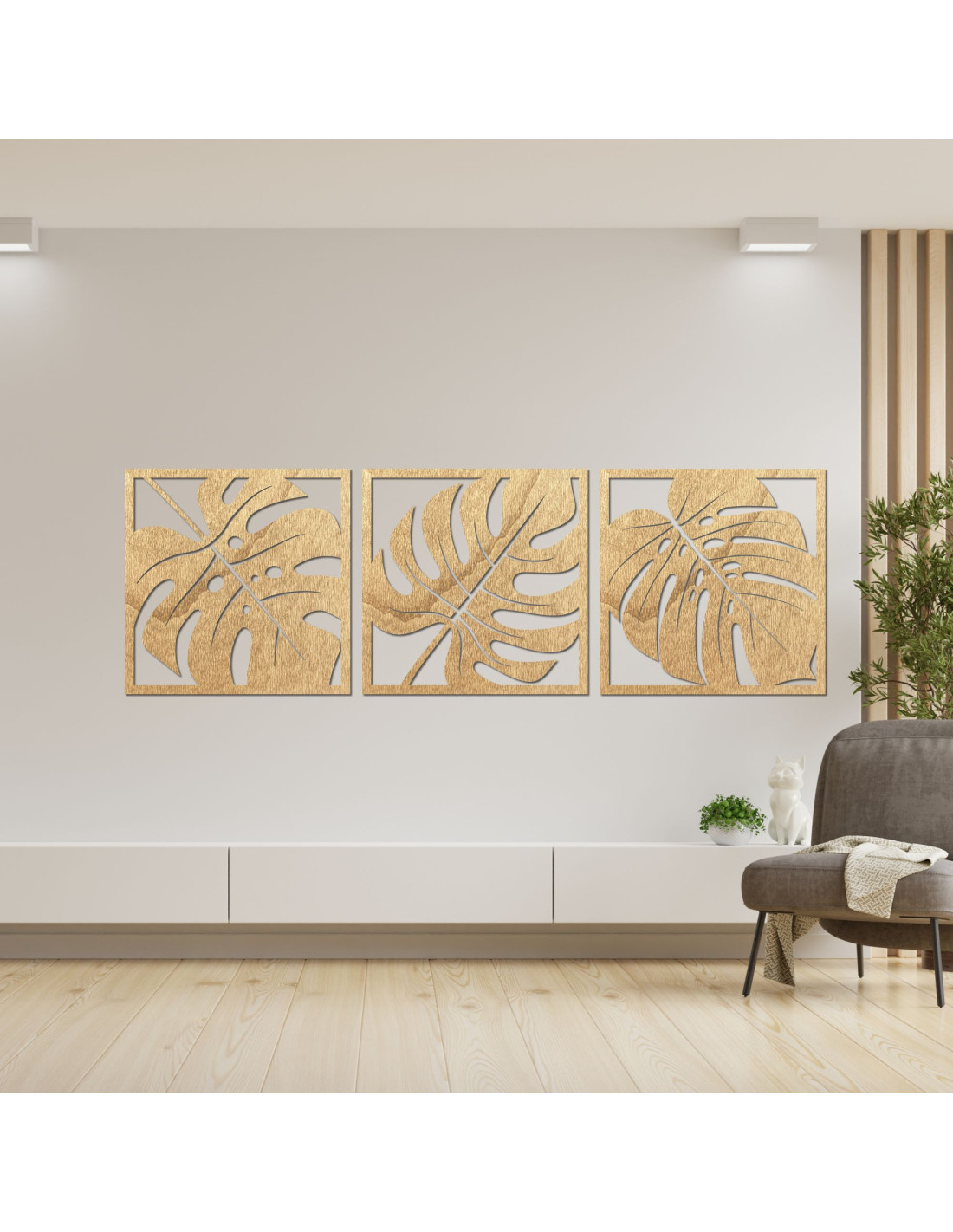 Edles Monstera -Bild aus Holz - moderne 3-teilige Dekoration für Wohnzimmer , Schlafzimmer oder Arbeitszimmer .