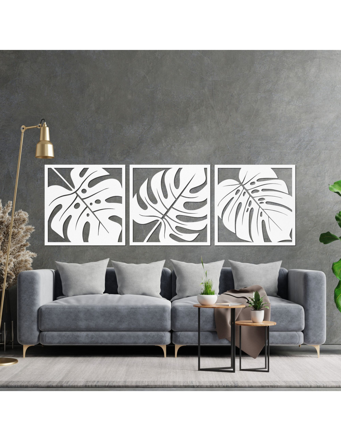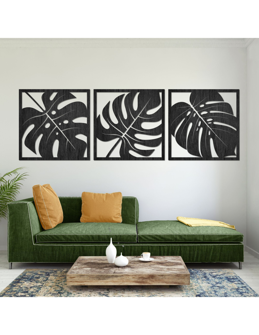 Dieses originelle 3-Panel-Design mit tropischem Blattmotiv schafft eine harmonische Atmosphäre und verleiht dem Raum ein exotisches Aussehen .