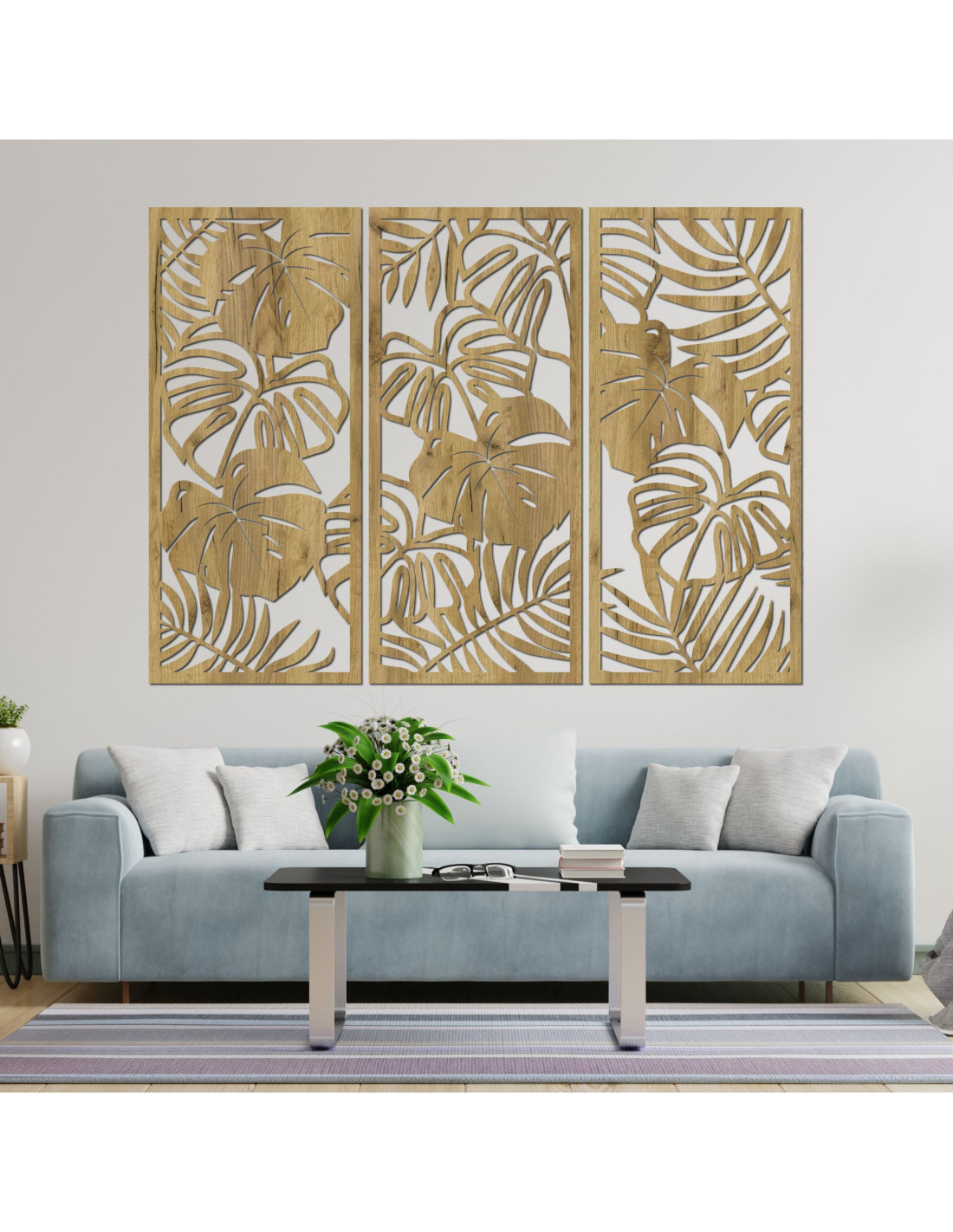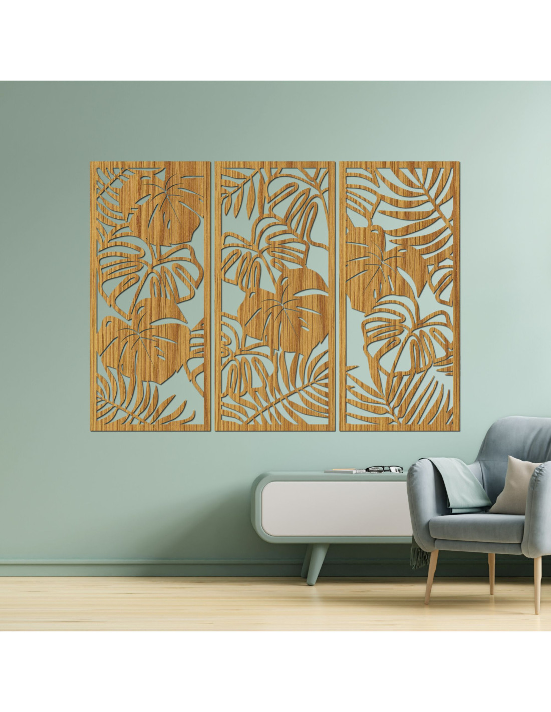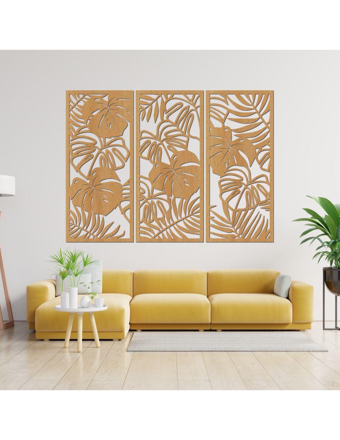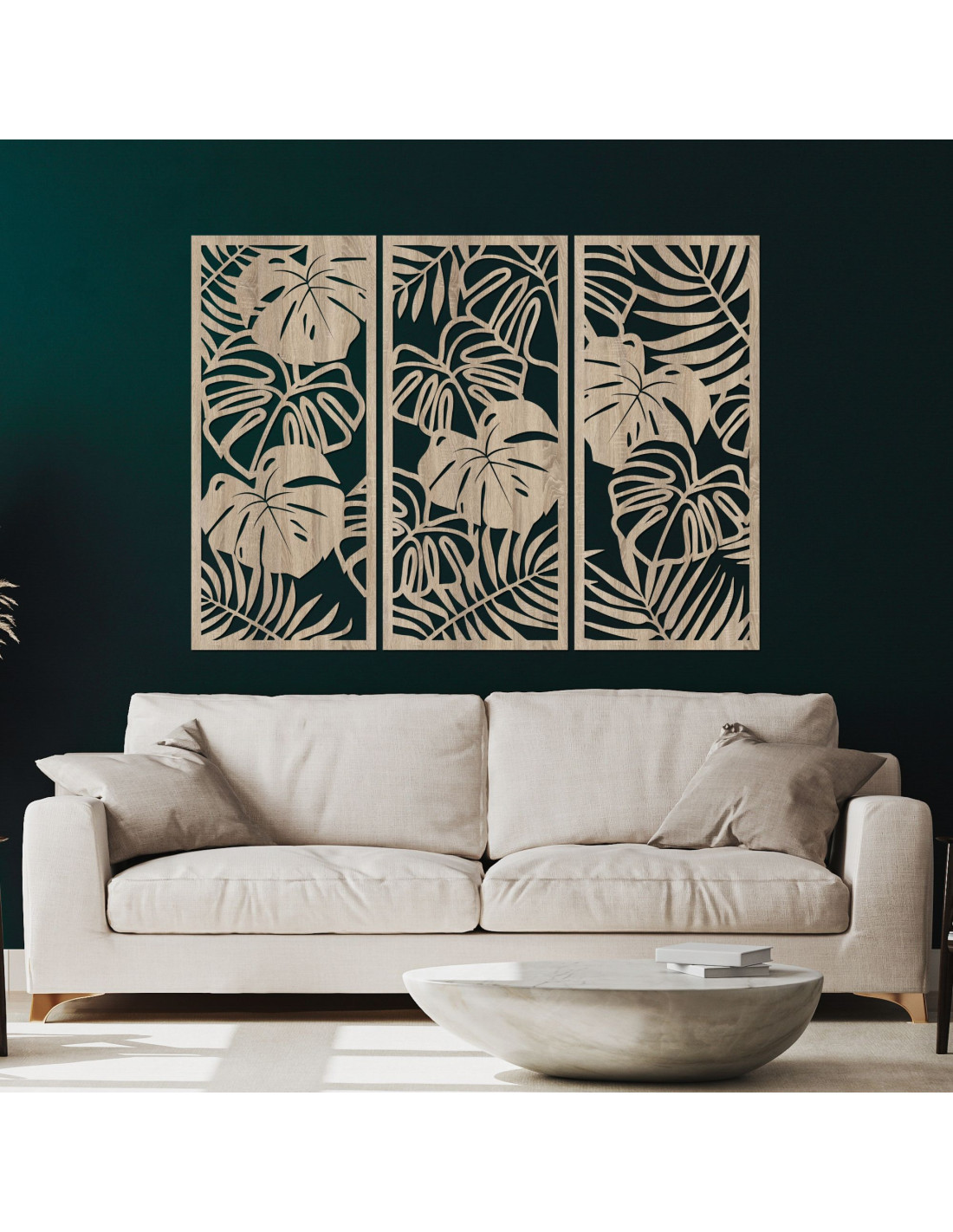 Dieses wunderschöne Holzbild ist die perfekte Kombination aus Kunst und Natur. Das Motiv aus großen Monstera-Blättern und Farnen erzeugt einen schönen visuellen Effekt, der Ihr Interieur beleben und ihm einen modernen Charakter verleihen wird. Dank der dreiteiligen Gestaltung wirkt das Bild luftig und harmonisch.