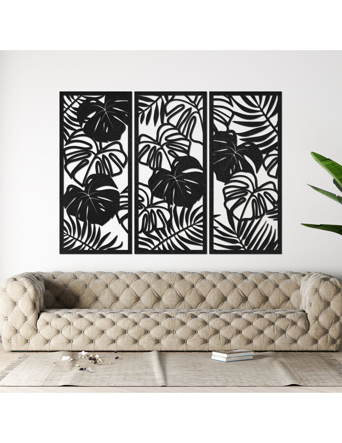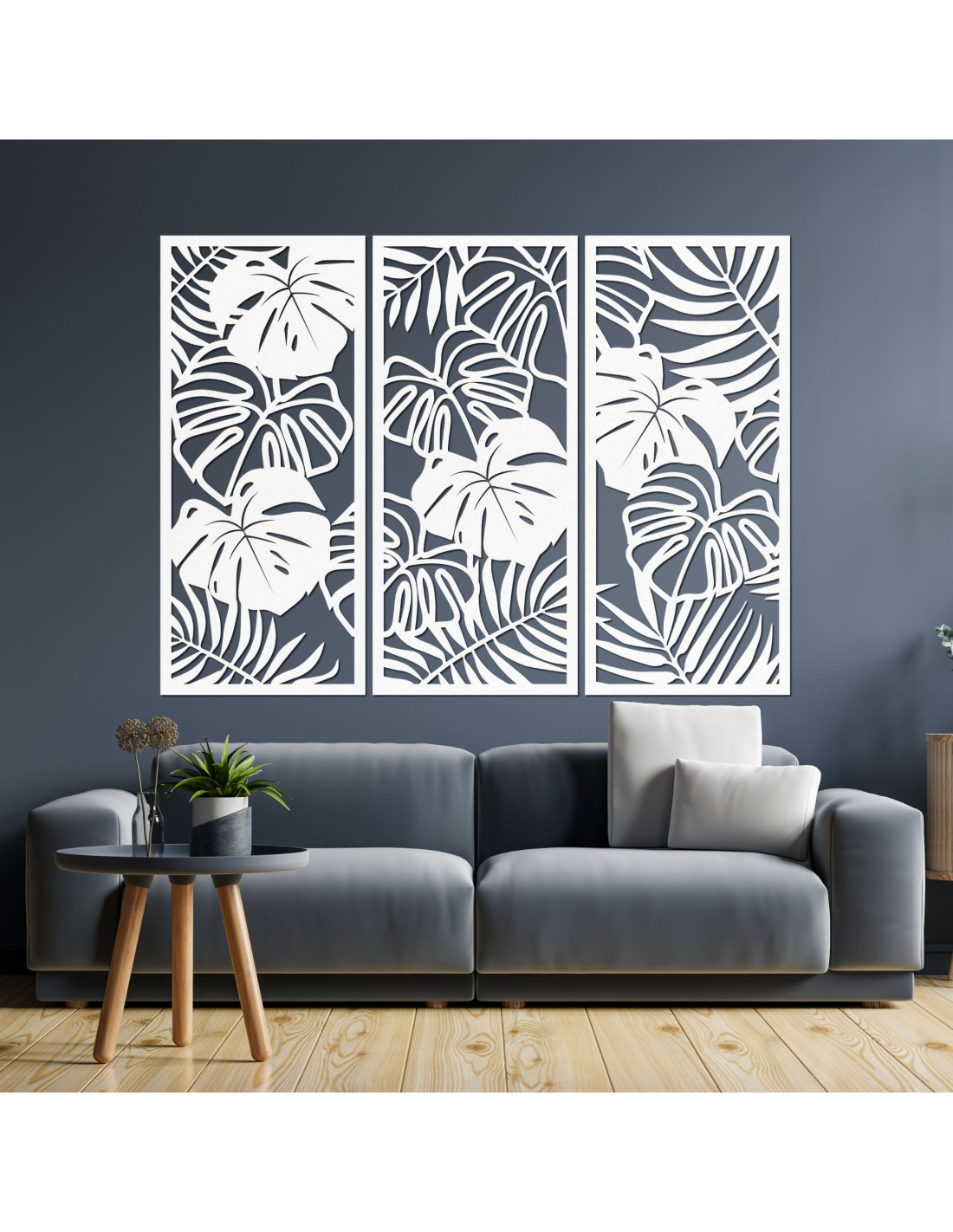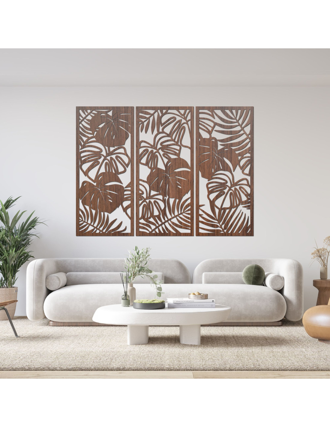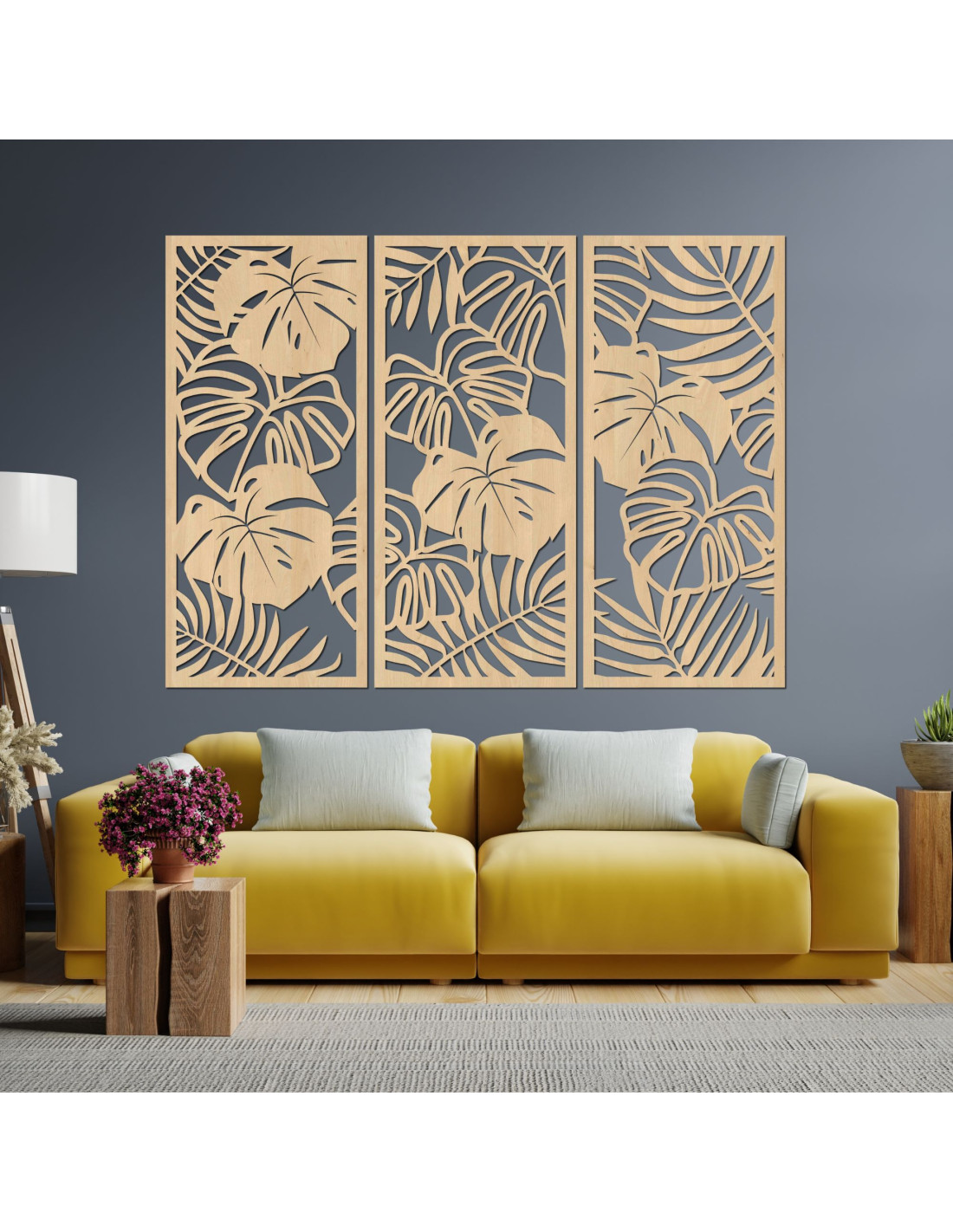Dieses wunderschöne Holzbild ist die perfekte Kombination aus Kunst und Natur. Das Motiv aus großen Monstera-Blättern und Farnen erzeugt einen schönen visuellen Effekt, der Ihr Interieur beleben und ihm einen modernen Charakter verleihen wird. Dank der dreiteiligen Gestaltung wirkt das Bild luftig und harmonisch.
