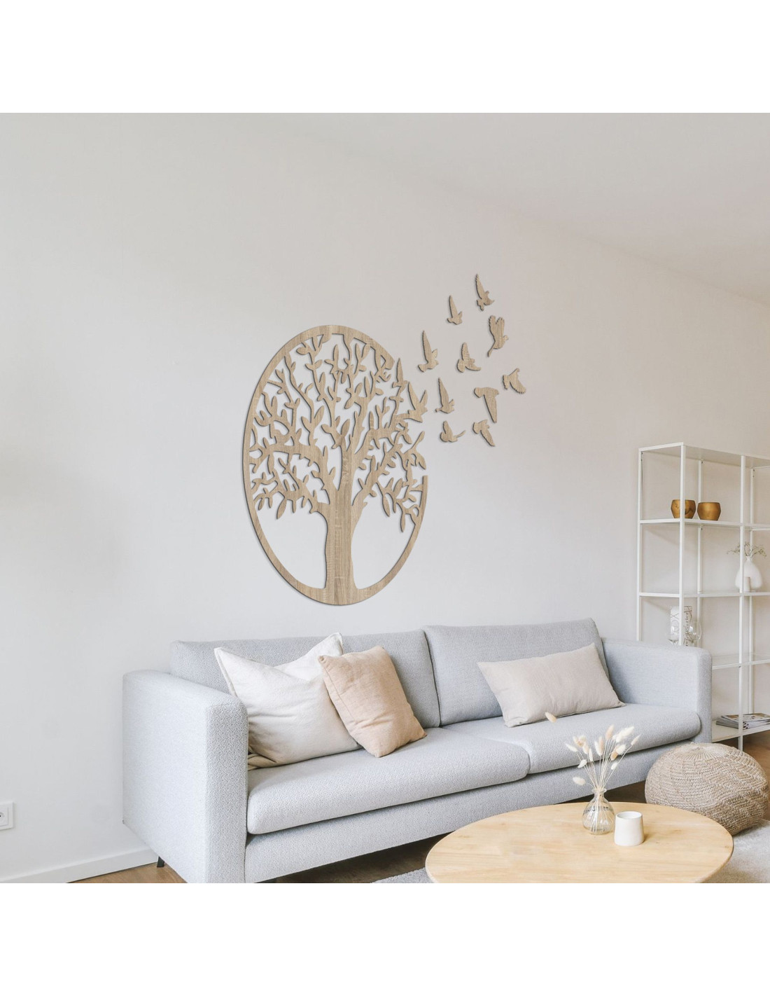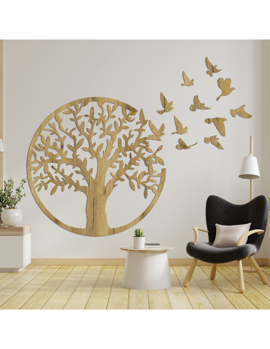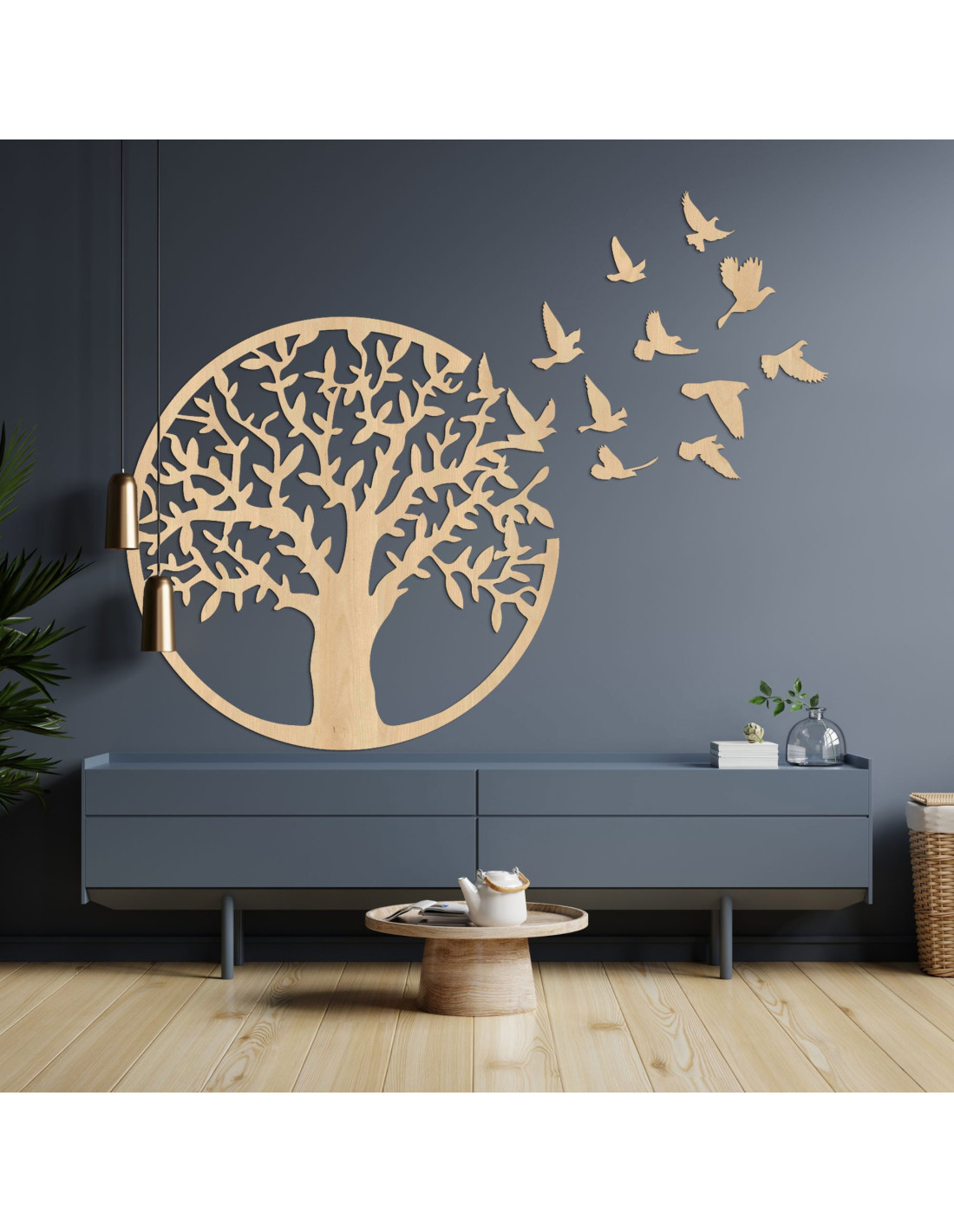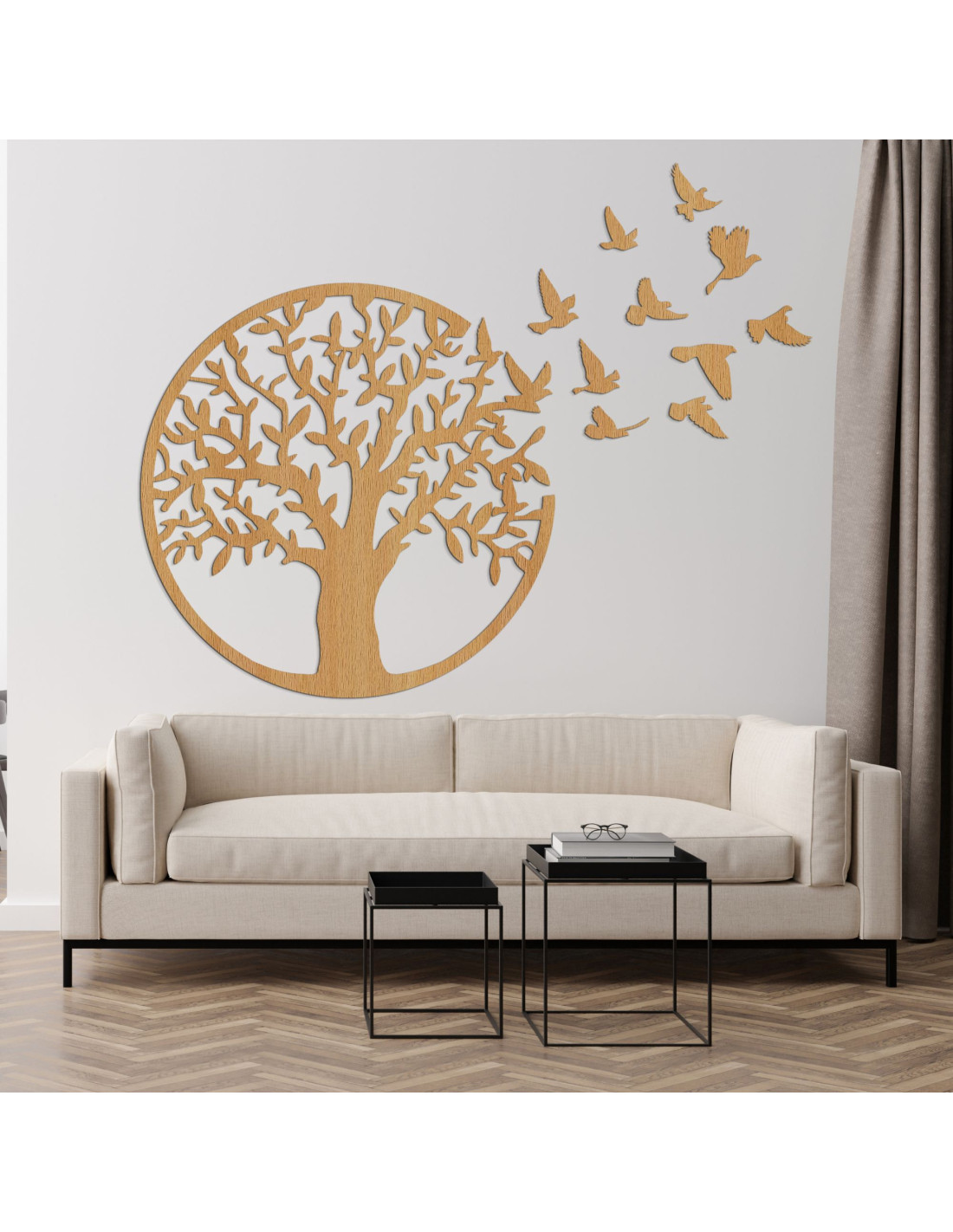 Erhellen Sie Ihr Interieur mit einer eleganten Wanddekoration aus Holz, die die Schönheit eines Baumes mit auffliegenden Vögeln einfängt. Dieses einzigartige Kunstwerk ist perfekt für diejenigen, die moderne und natürliche Akzente in ihren Räumen suchen.
