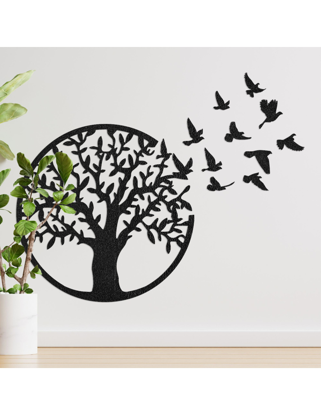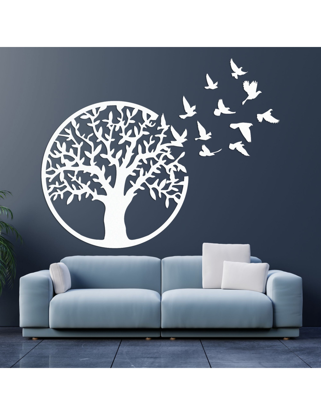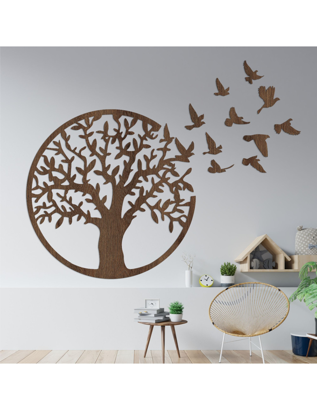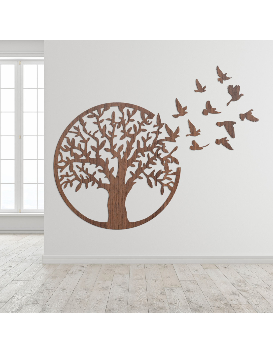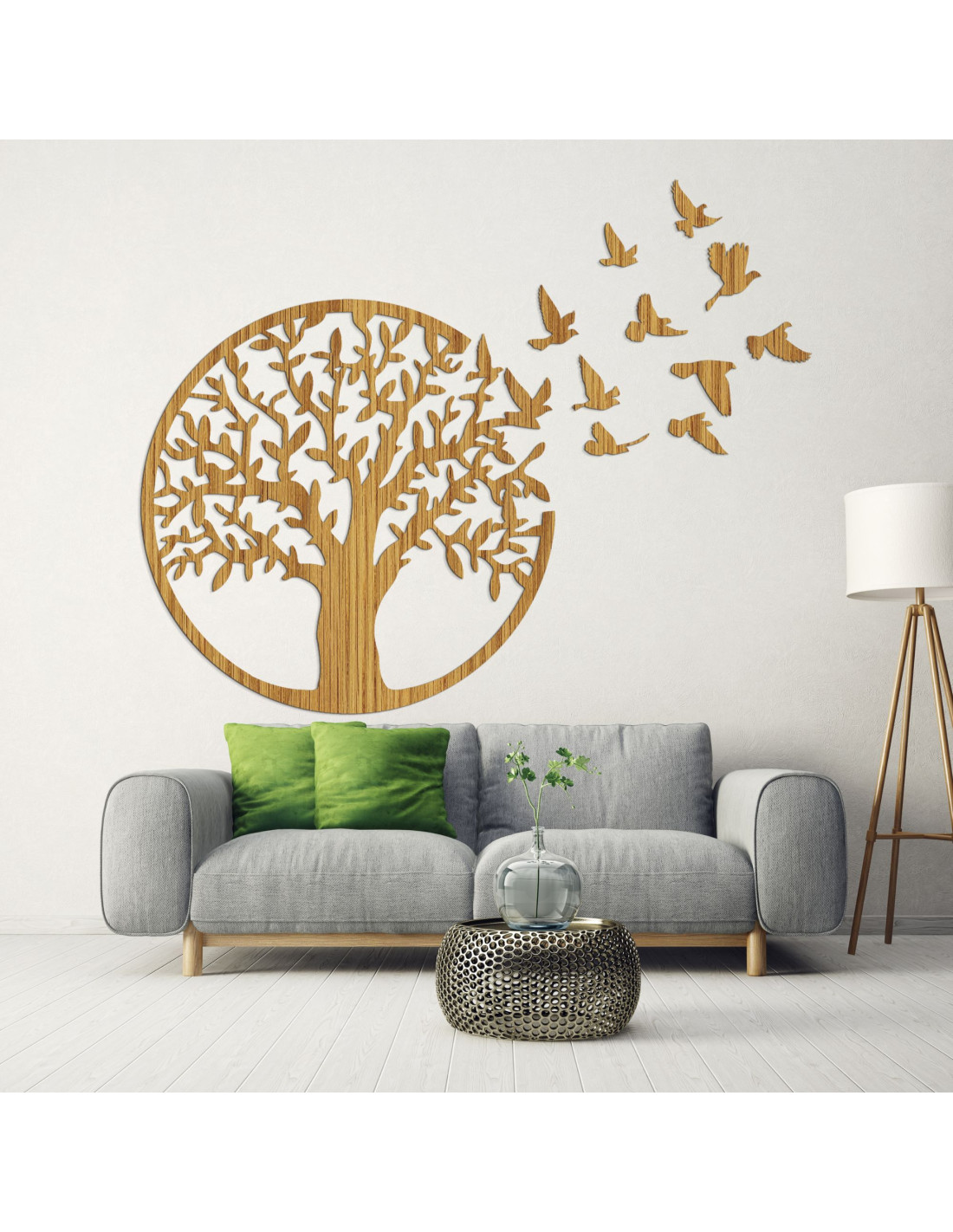 Erhellen Sie Ihr Interieur mit einer eleganten Wanddekoration aus Holz, die die Schönheit eines Baumes mit auffliegenden Vögeln einfängt. Dieses einzigartige Kunstwerk ist perfekt für diejenigen, die moderne und natürliche Akzente in ihren Räumen suchen.