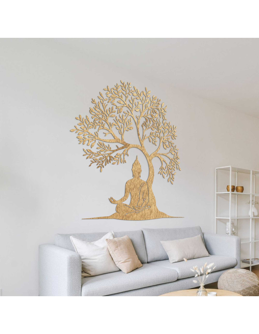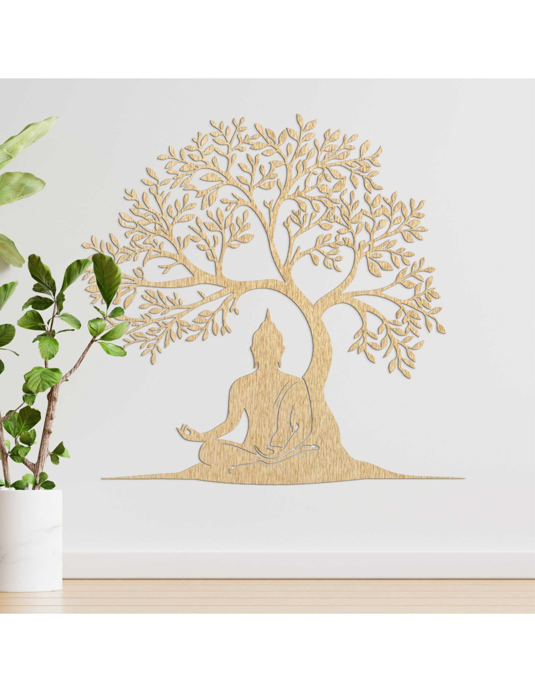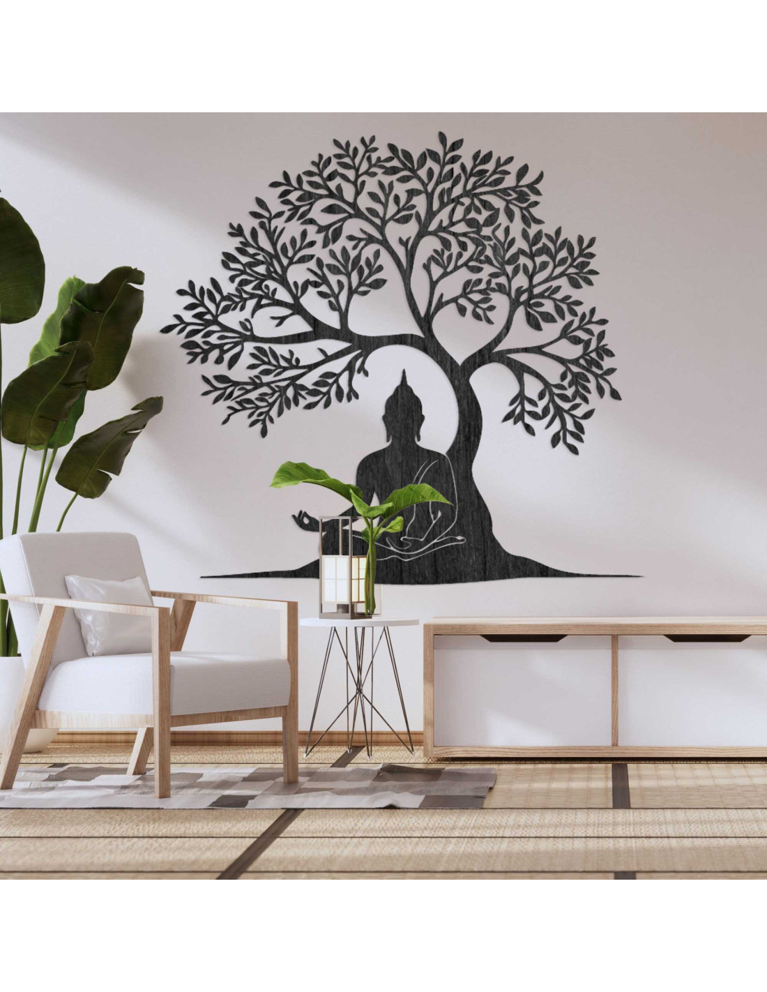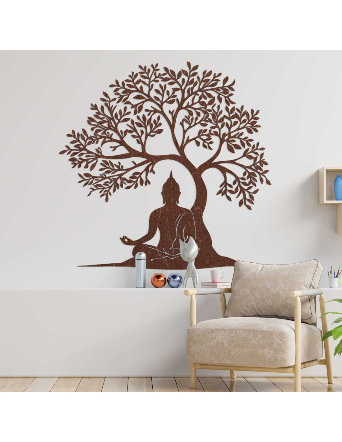 Die Holzdekoration stellt eine spirituelle Szene dar, in der Buddha in meditativer Haltung unter dem Baum der Erkenntnis sitzt. Jedes Detail ist das Ergebnis sorgfältiger Handwerkskunst, die eine Hommage an die Philosophie des Ostens darstellt. Die Silhouette des Baumes symbolisiert außerdem Wachstum, Stabilität und Schutz. Das Ganze wirkt wie ein Kunstwerk mit tiefer Bedeutung, das die Seele anspricht.