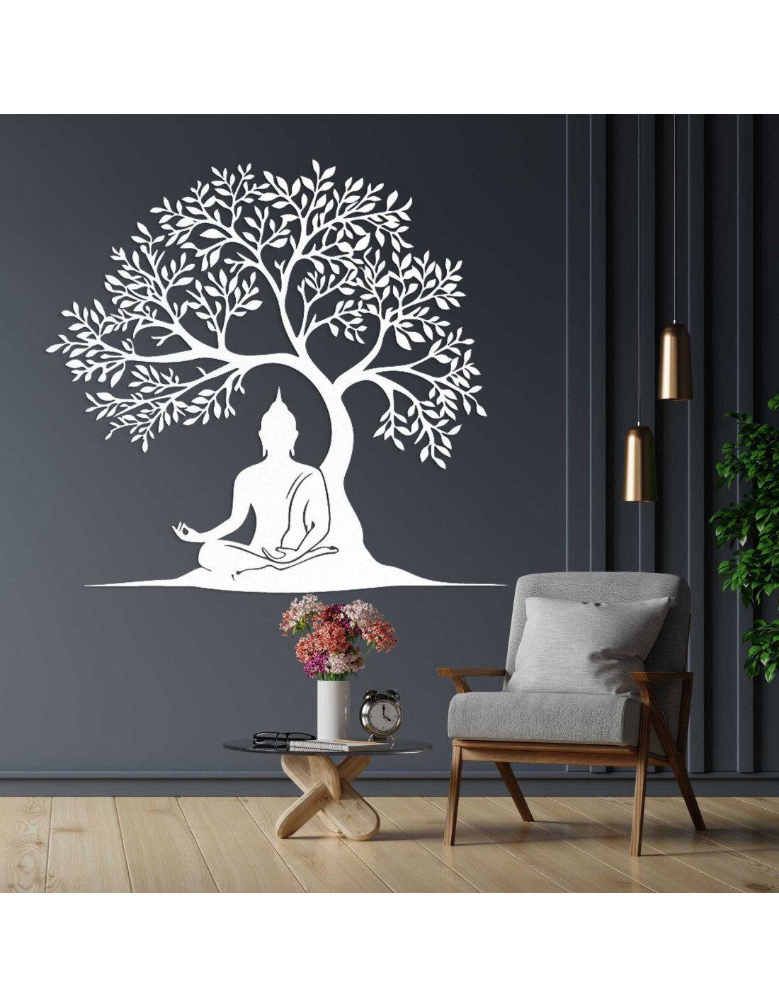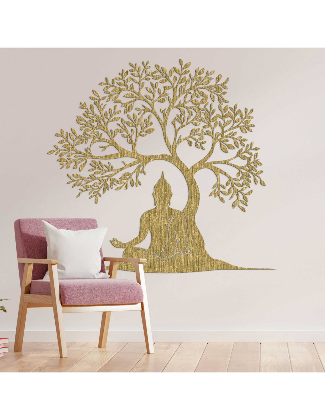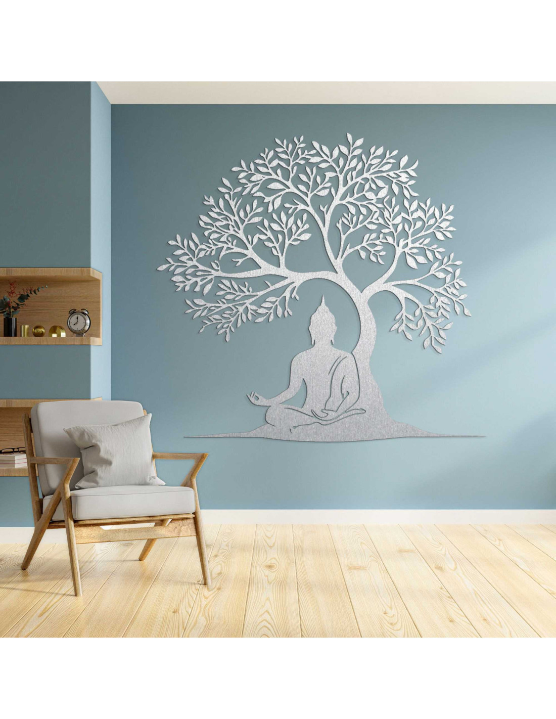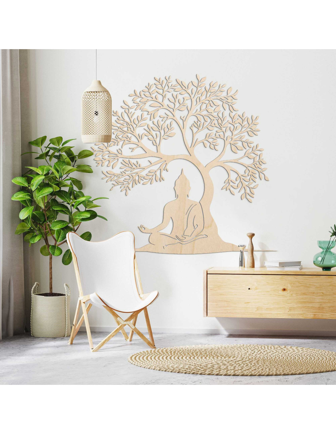 Die Holzdekoration stellt eine spirituelle Szene dar, in der Buddha in meditativer Haltung unter dem Baum der Erkenntnis sitzt. Jedes Detail ist das Ergebnis sorgfältiger Handwerkskunst, die eine Hommage an die Philosophie des Ostens darstellt. Die Silhouette des Baumes symbolisiert außerdem Wachstum, Stabilität und Schutz. Das Ganze wirkt wie ein Kunstwerk mit tiefer Bedeutung, das die Seele anspricht.