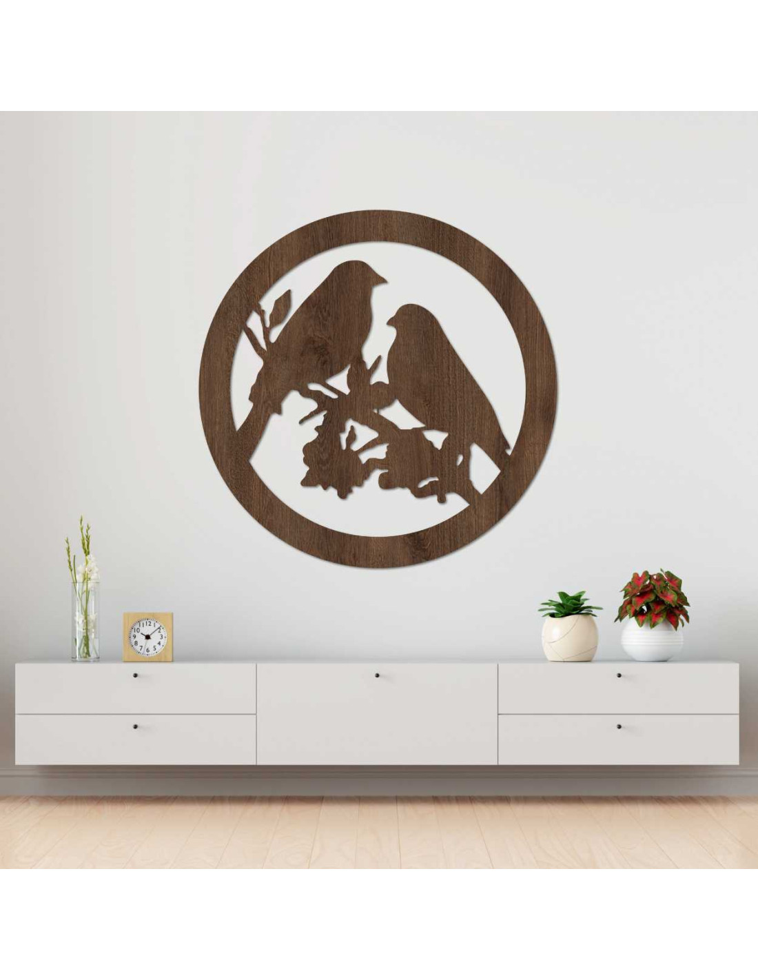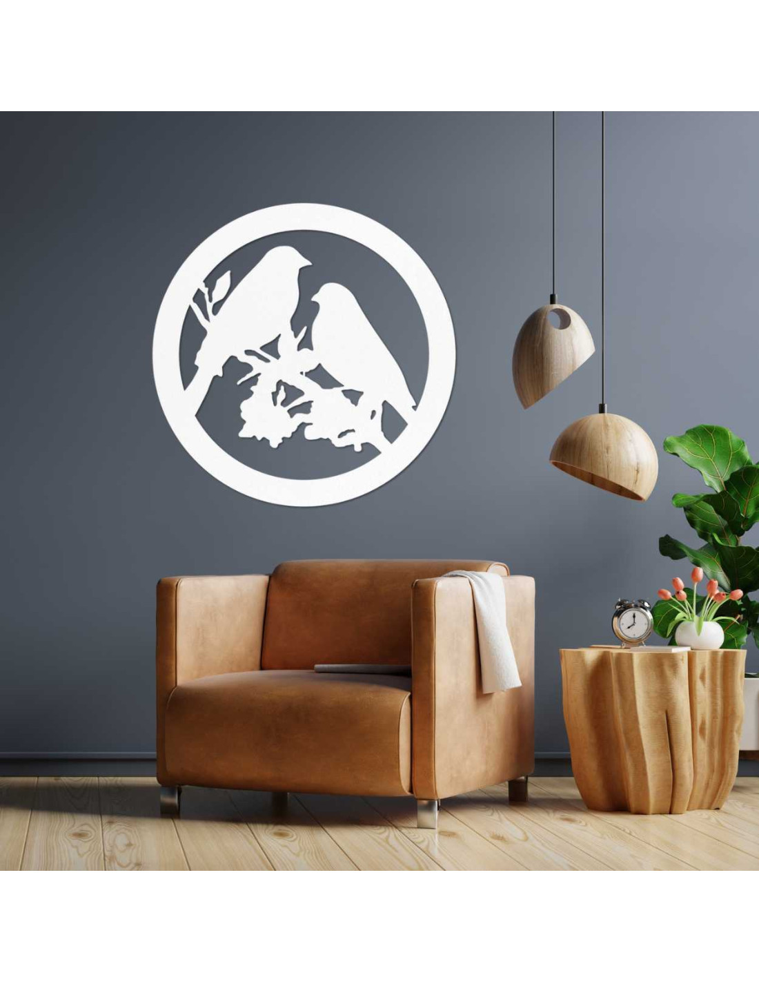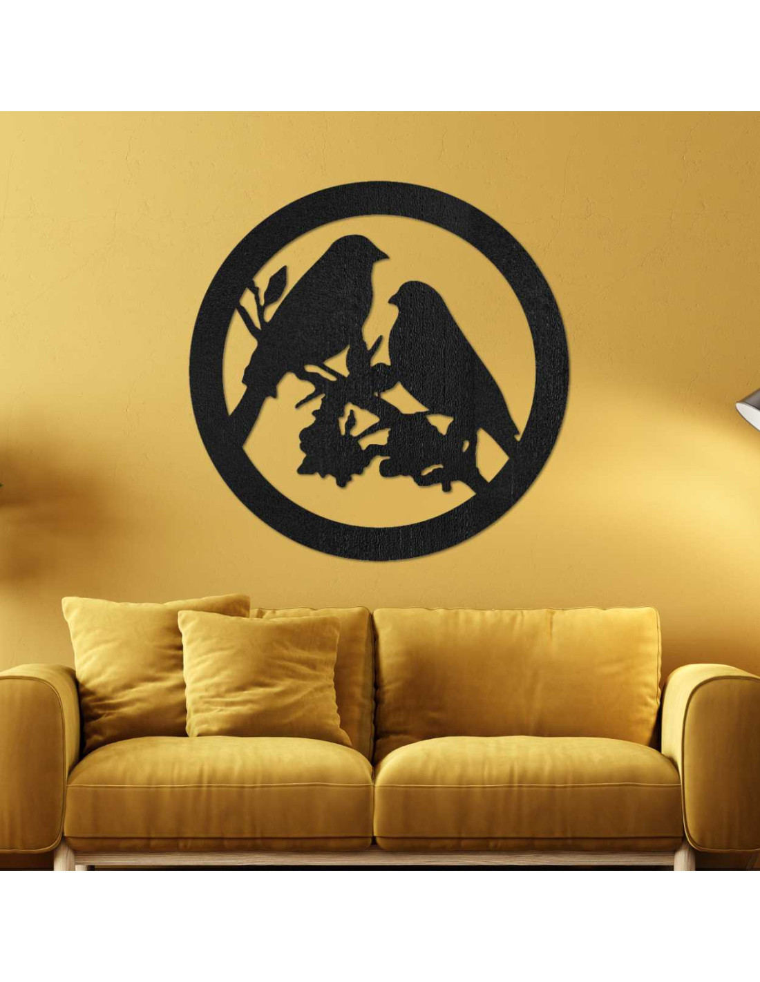 Die dekorative Malerei mit dem Motiv von zwei Vögeln auf einem Zweig in kreisförmigem Design strahlt Zartheit und natürlichen Charme aus.