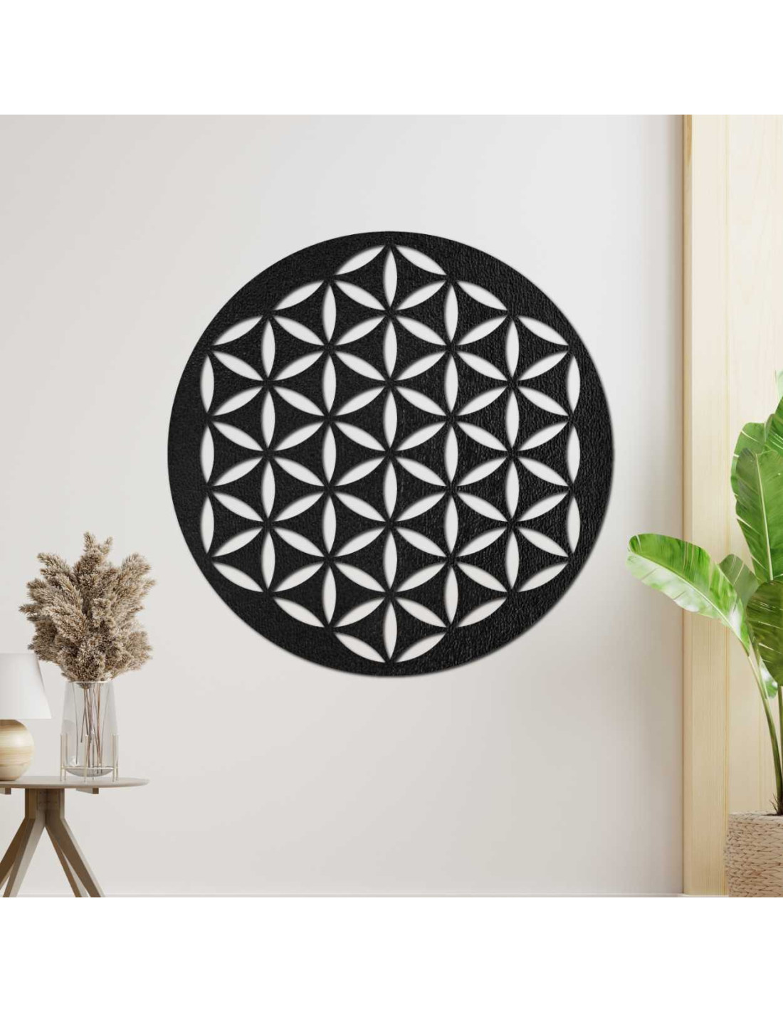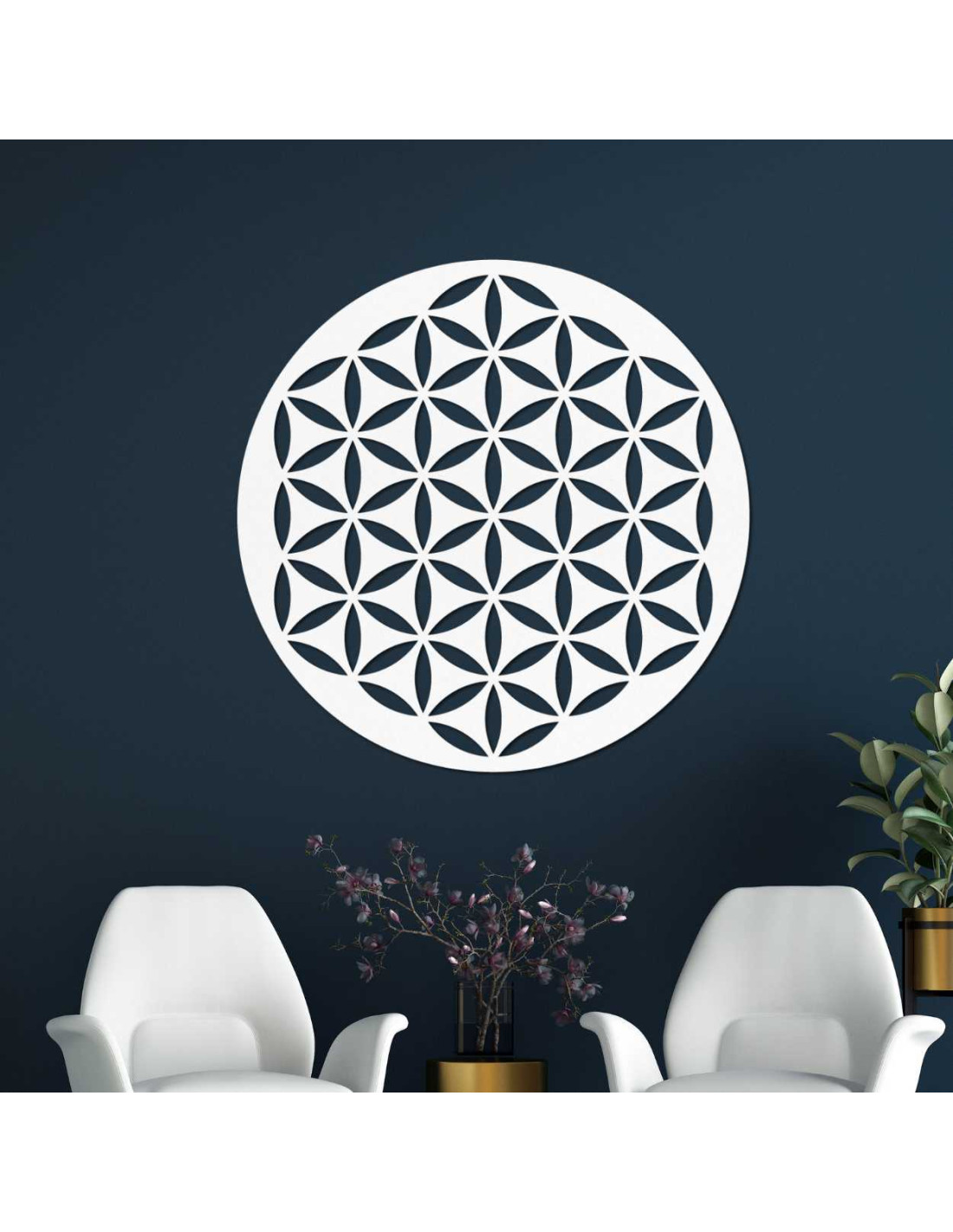 Das geometrische Motiv der Blume des Lebens symbolisiert Einheit, Ausgeglichenheit und spirituelles Wachstum und wirkt somit beruhigend auf die Raumatmosphäre.