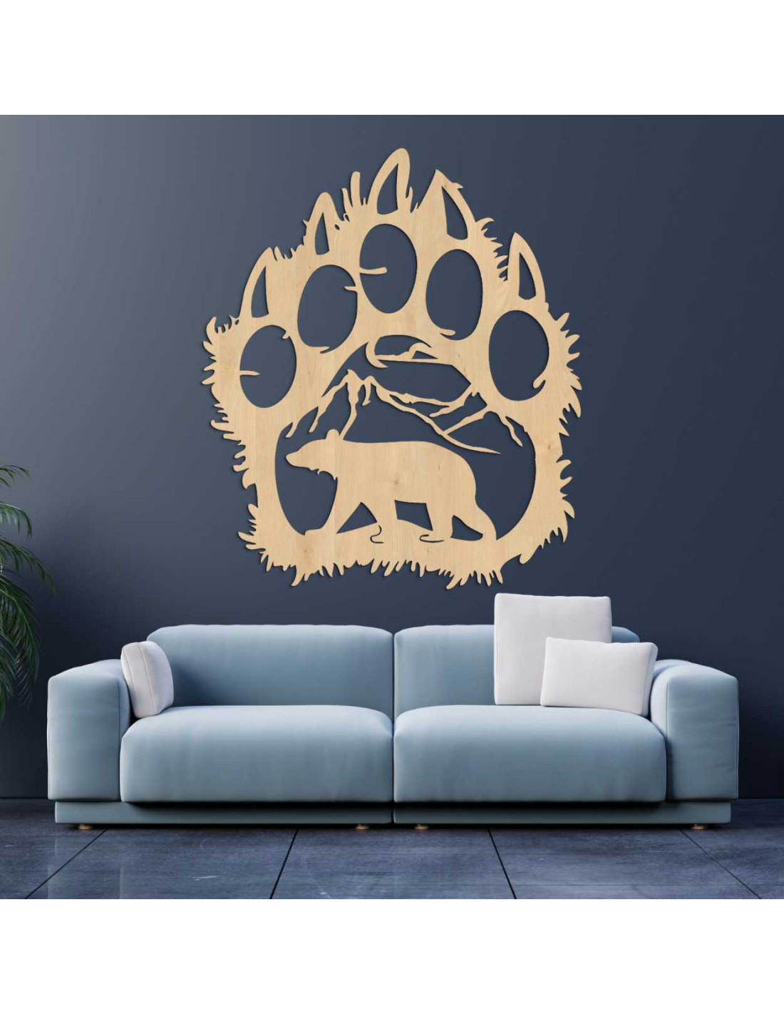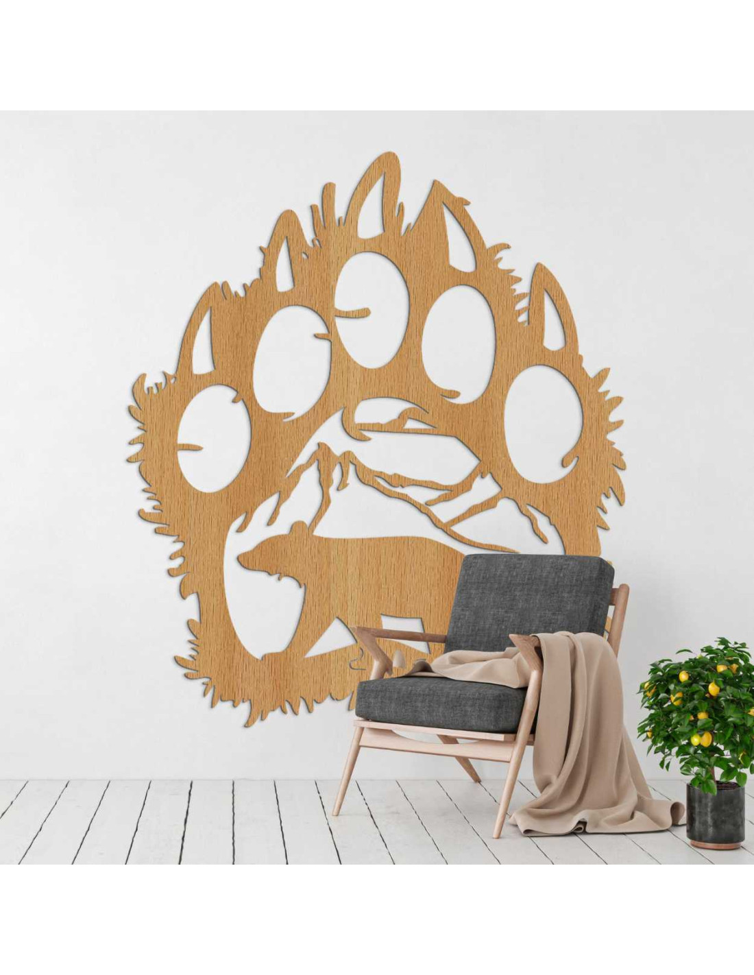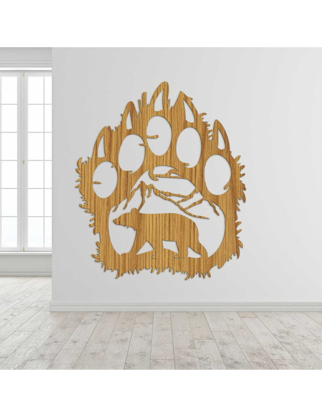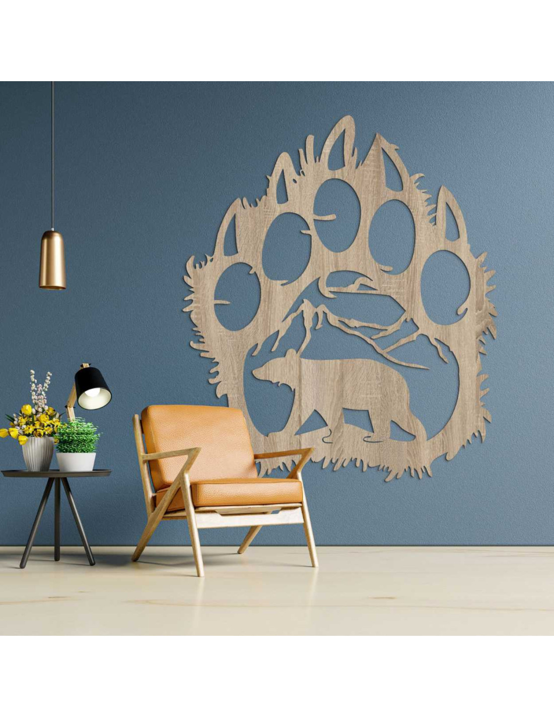 Wanddekoration aus Holz in Form eines Bärenfußabdrucks mit geschnitztem Bären und Bergen.