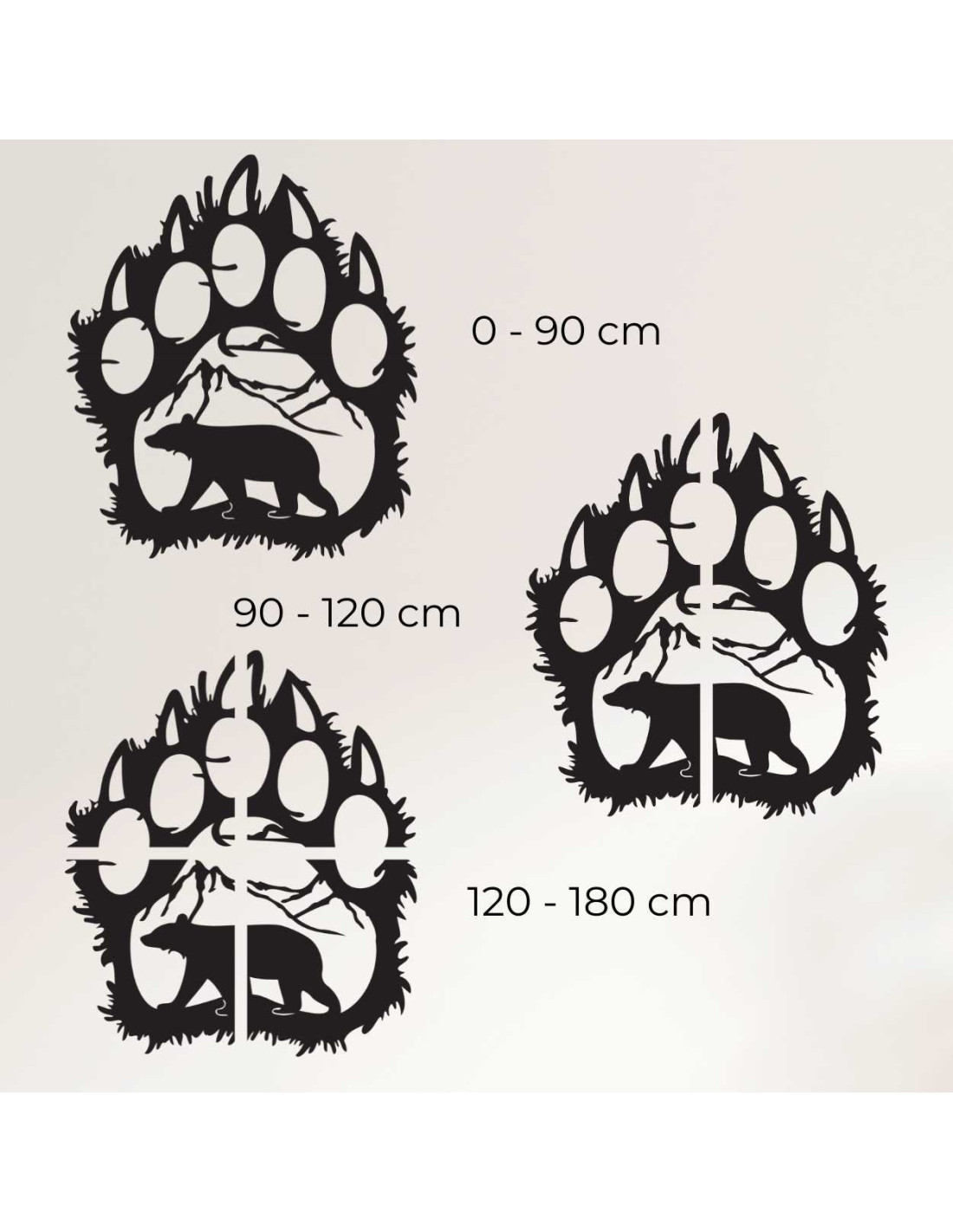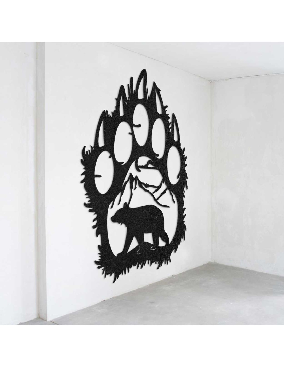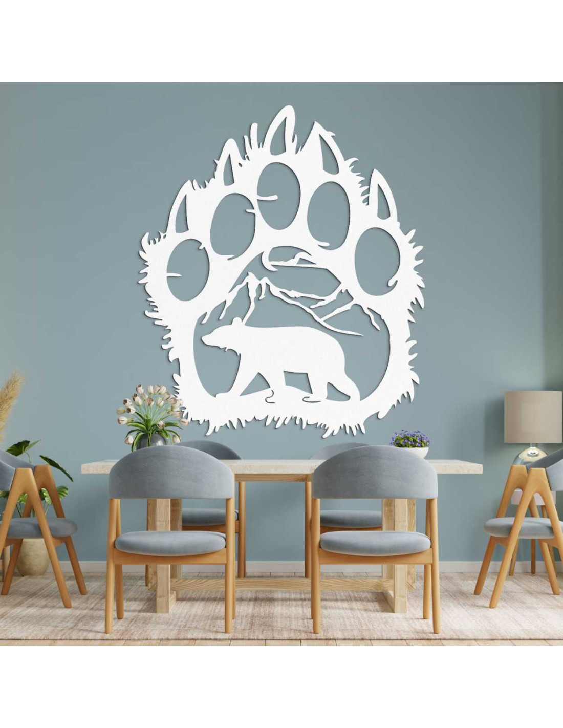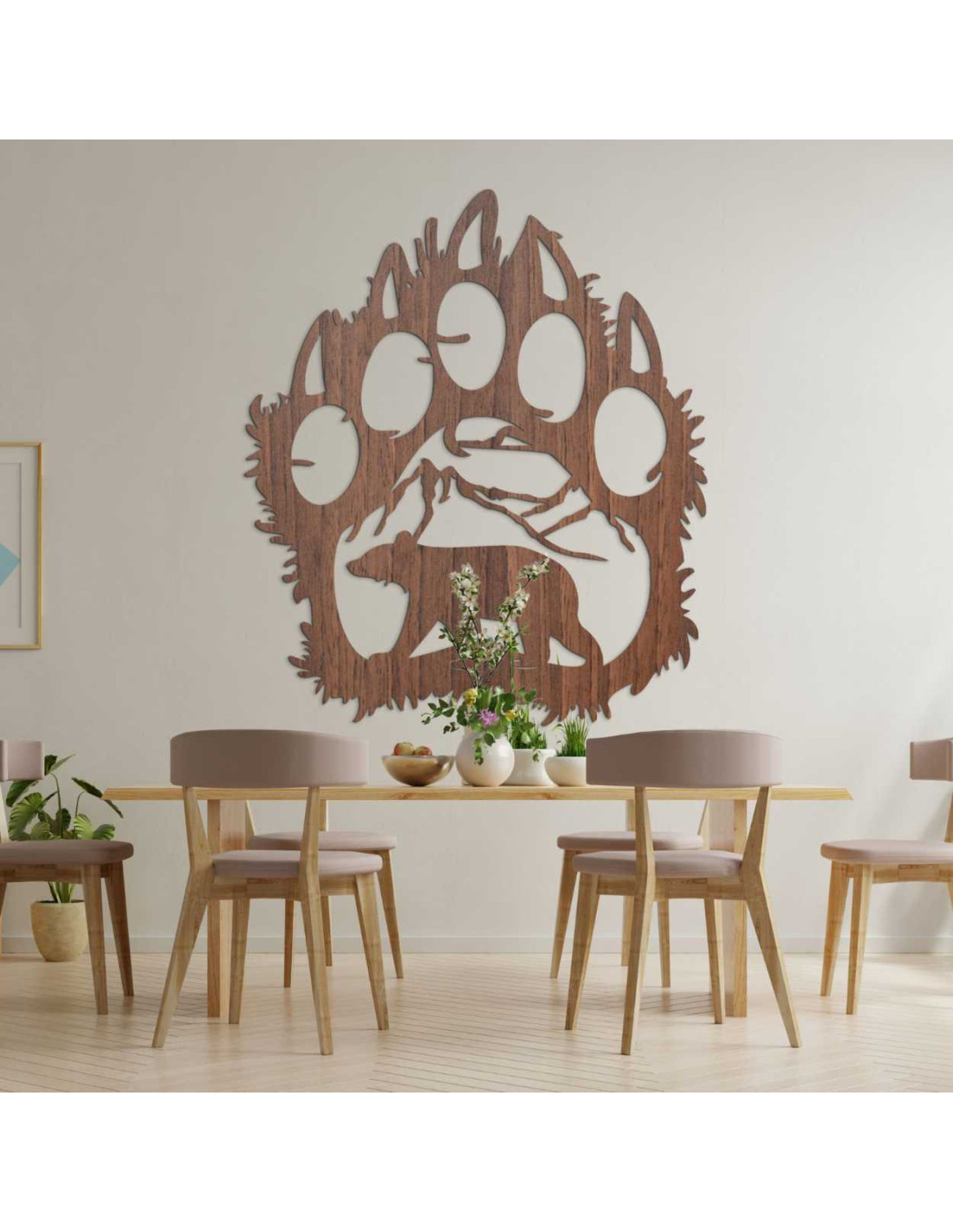 Wanddekoration aus Holz in Form eines Bärenfußabdrucks mit geschnitztem Bären und Bergen.