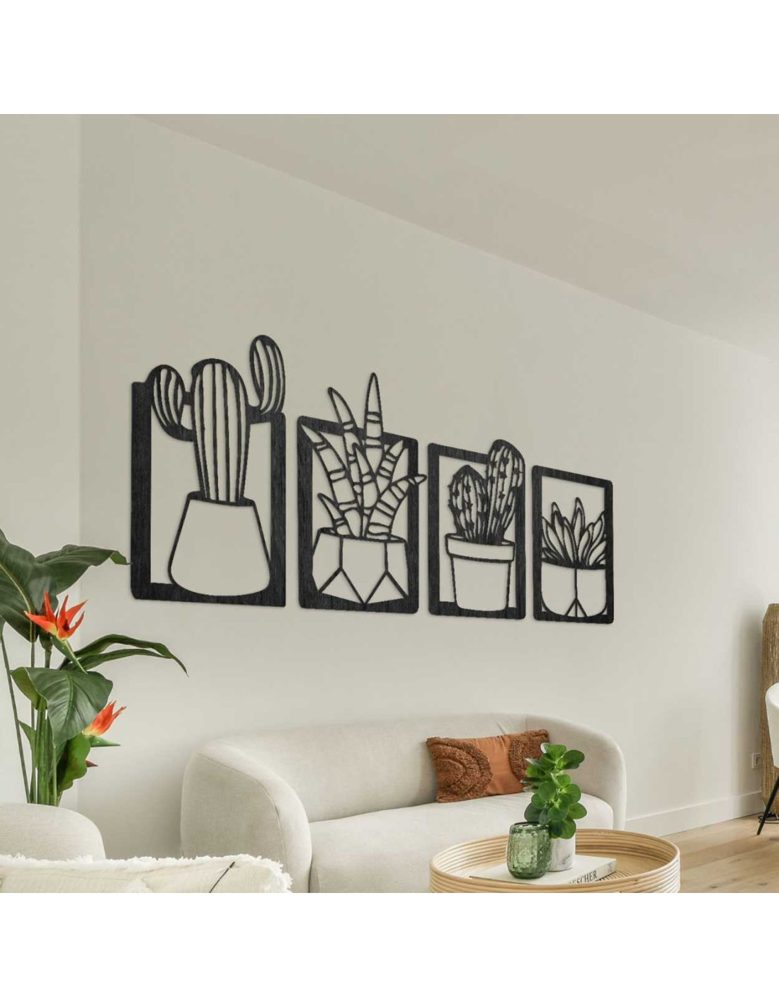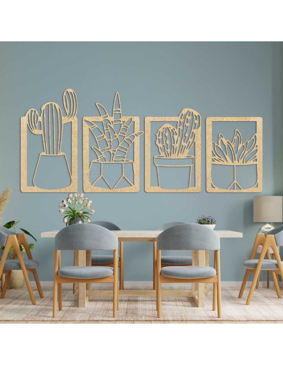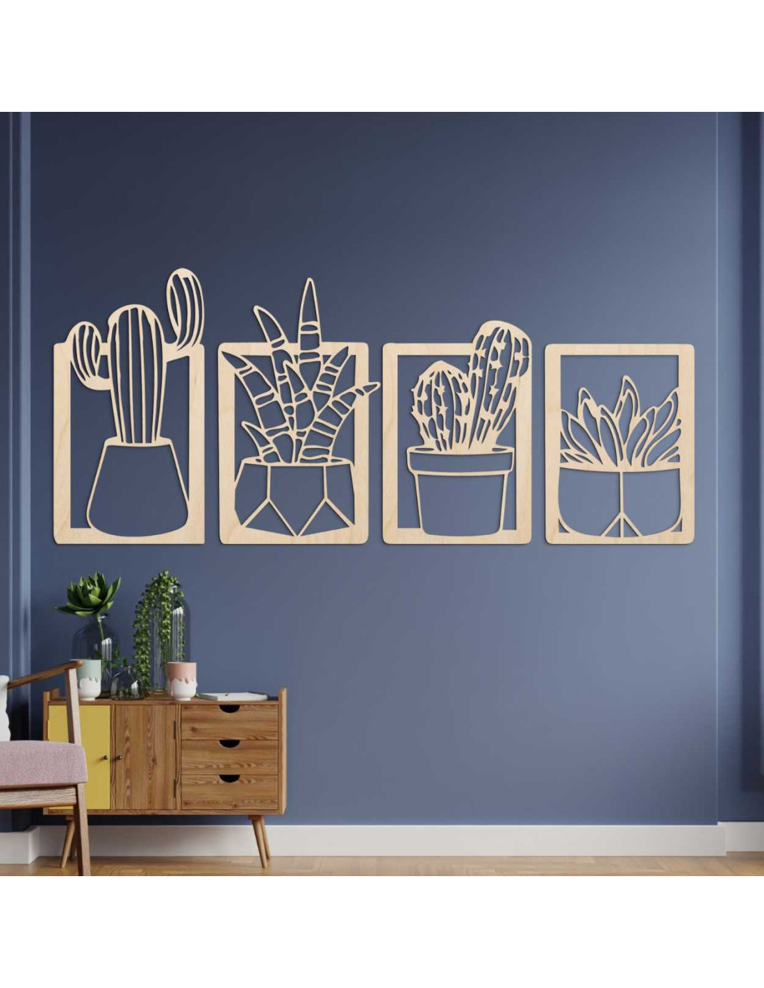 Eine Wanddekoration aus Holz mit einem Muster aus Kakteen und Sukkulenten belebt mit ihrem originellen Pflanzenmotiv jeden Raum.