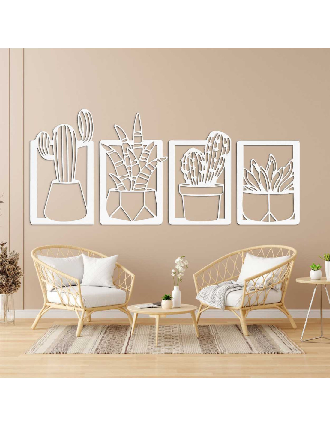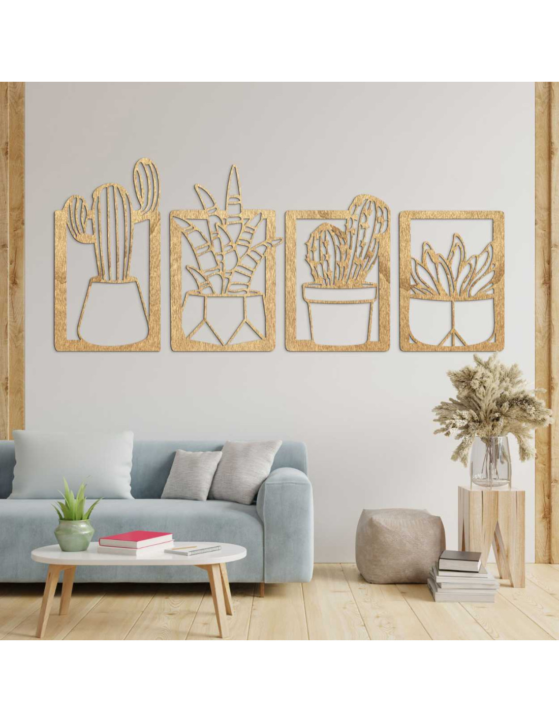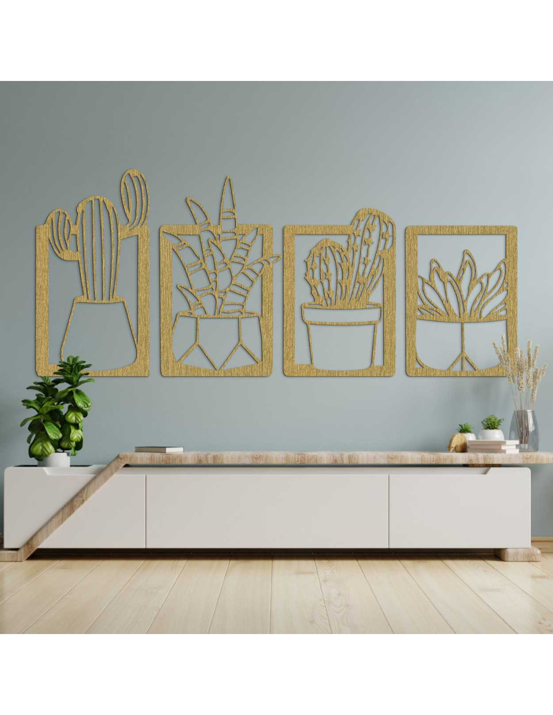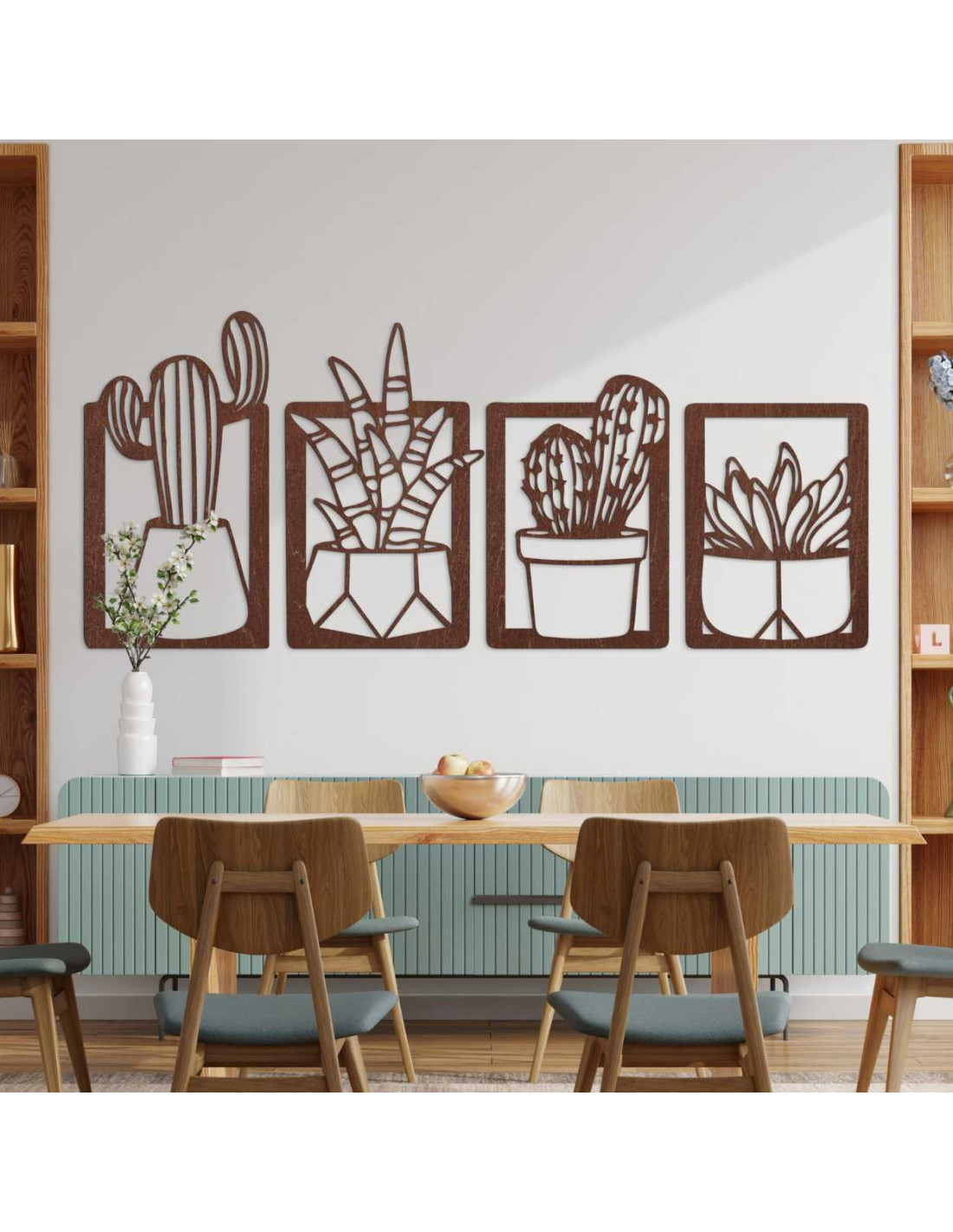 Eine Wanddekoration aus Holz mit einem Muster aus Kakteen und Sukkulenten belebt mit ihrem originellen Pflanzenmotiv jeden Raum.
