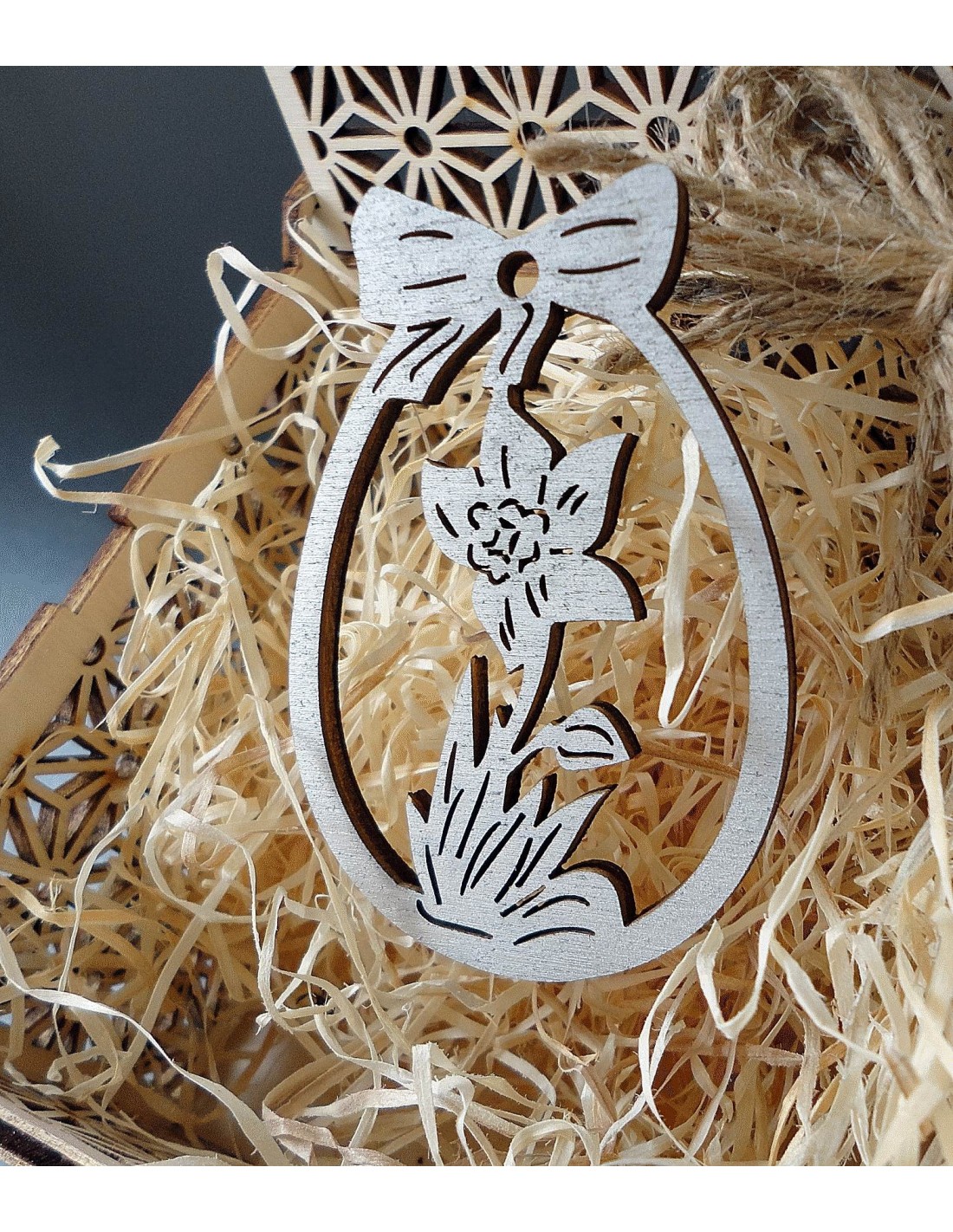 Osterdeko aus Holz mit Blumenmotiv und Schleife