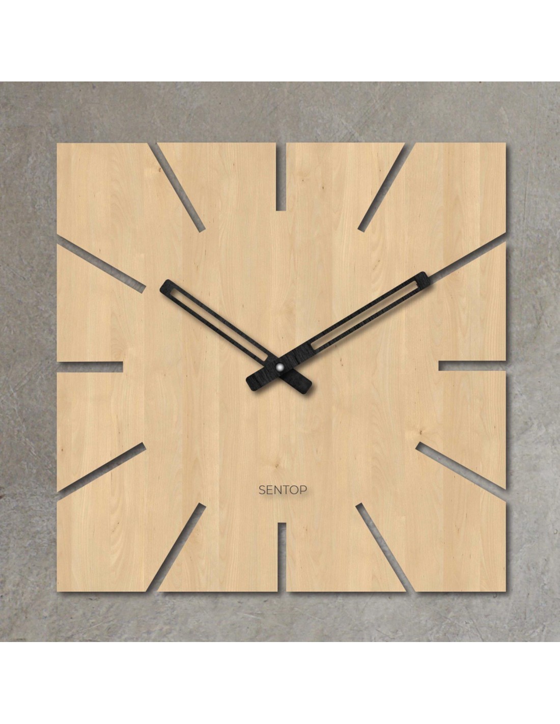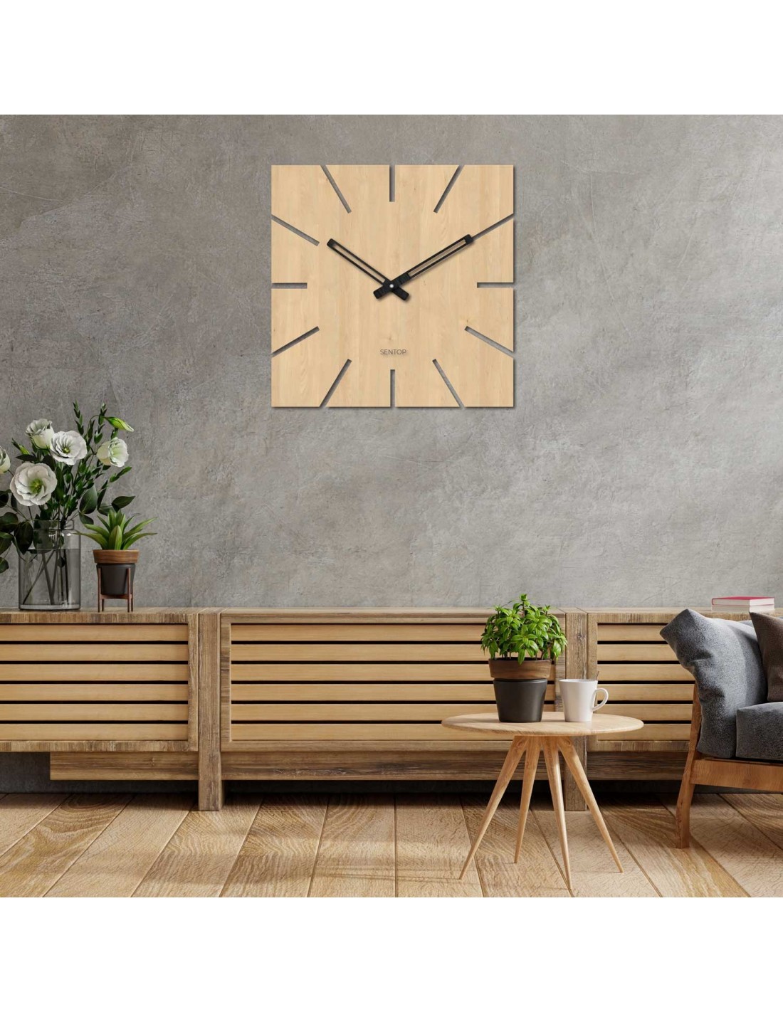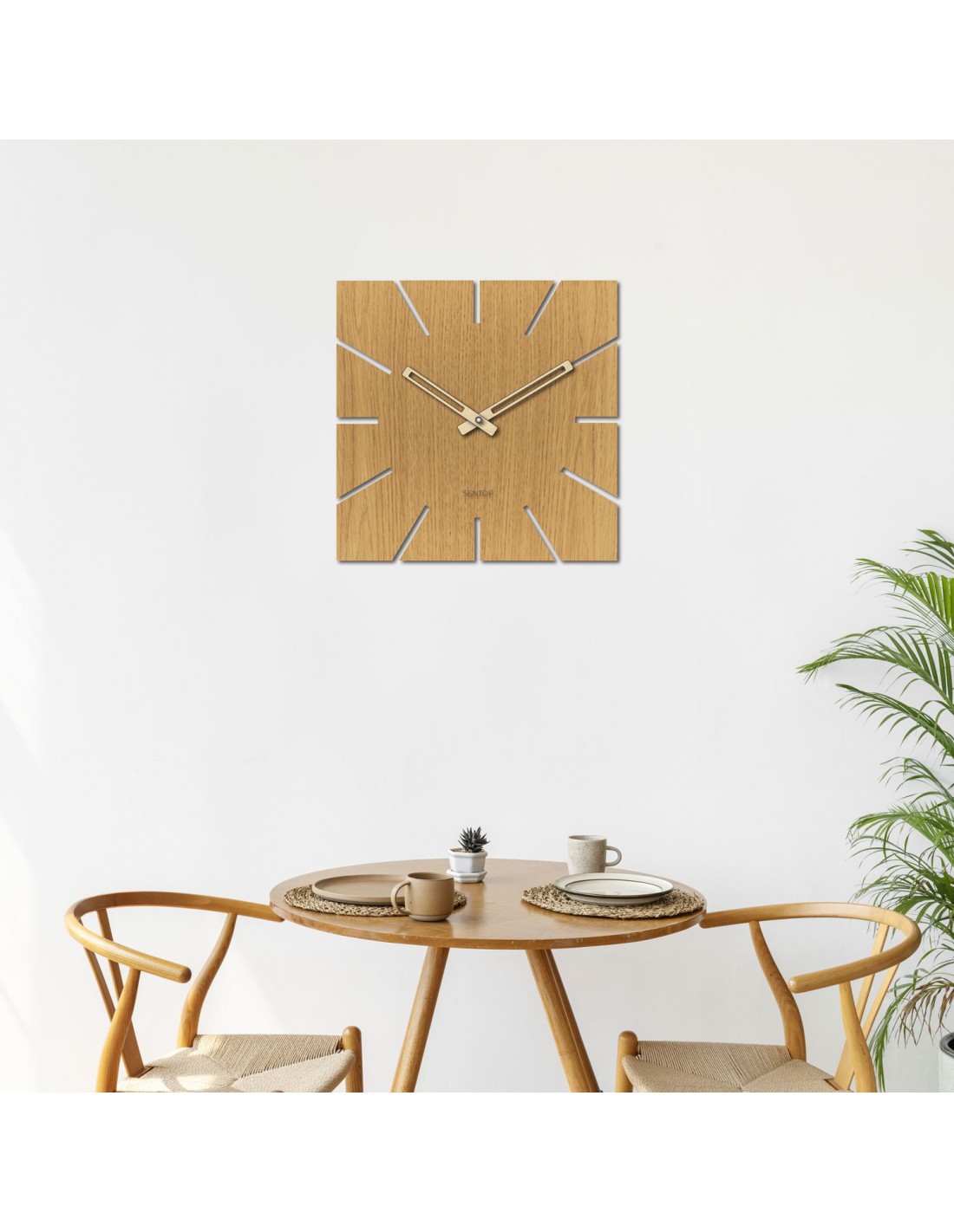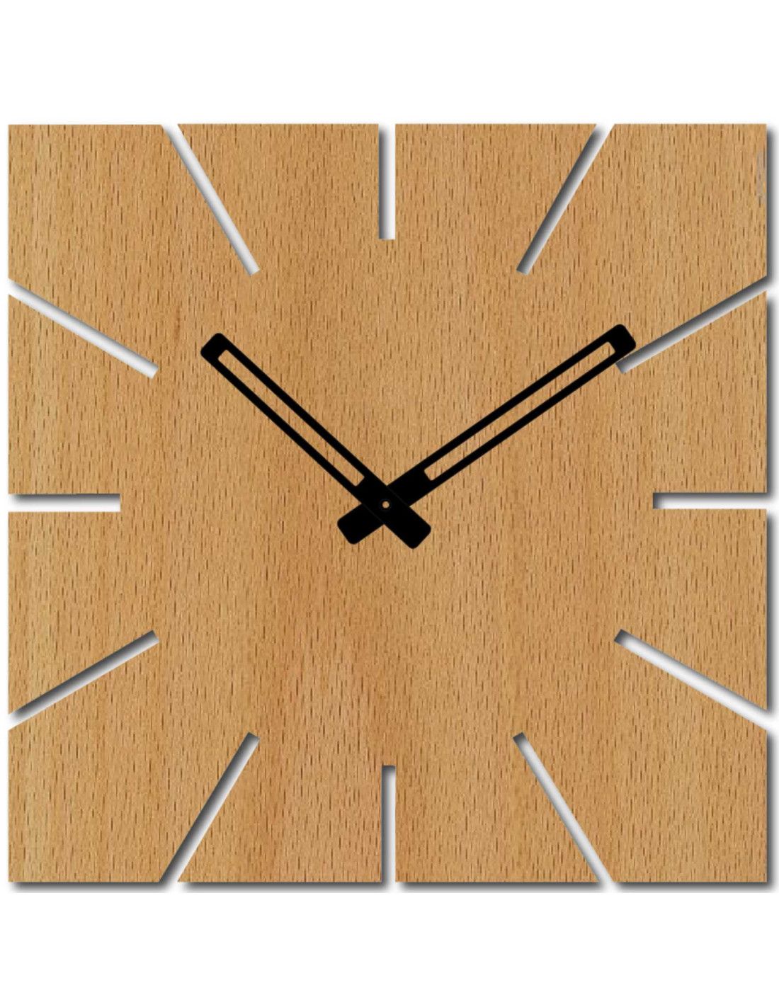 Das quadratische Format mit präzise gefrästen Aussparungen anstelle von Ziffern und markanten schwarzen Zeigern schafft einen modernen und dennoch zeitlosen Akzent, der sich harmonisch in jeden Raum einfügt.