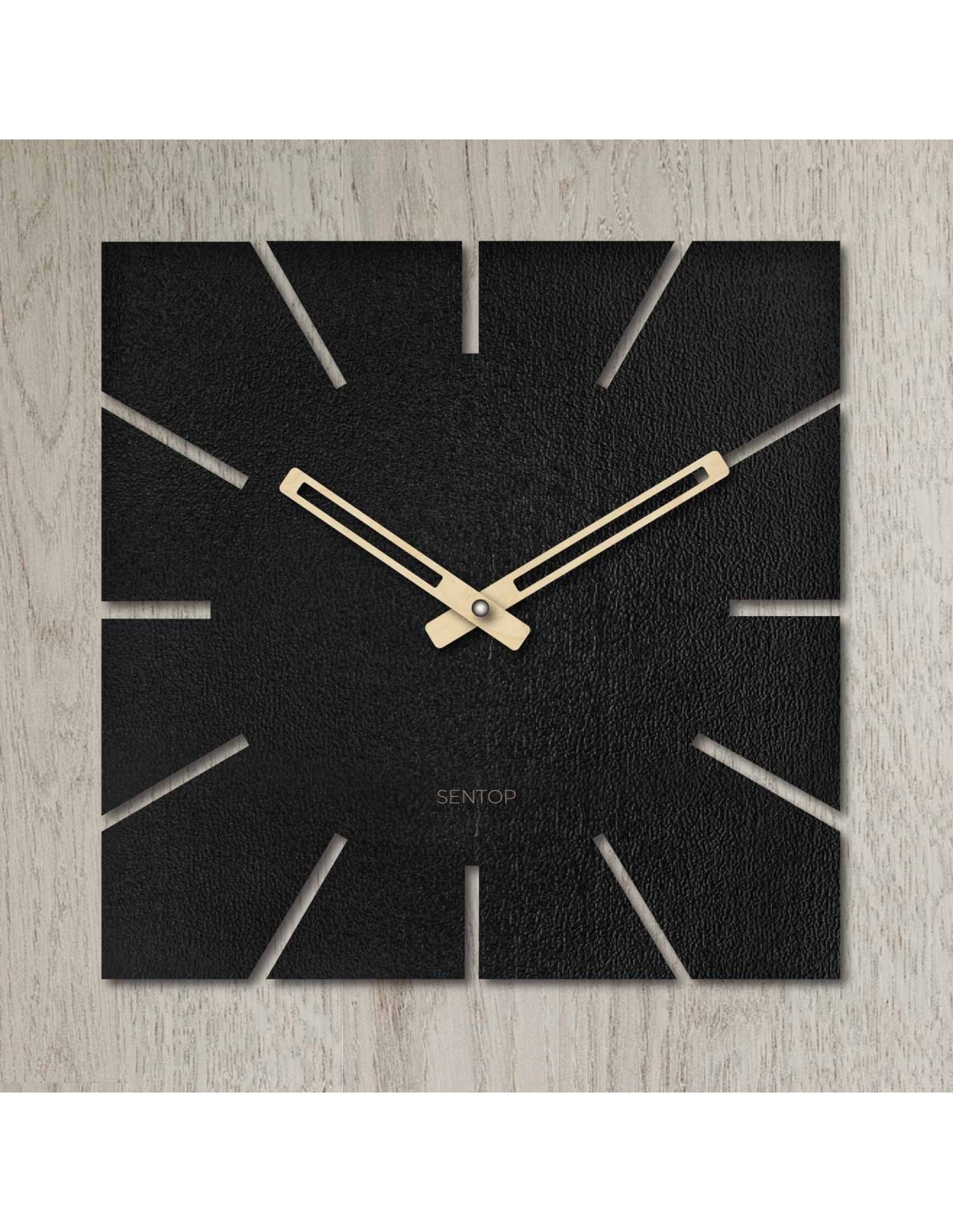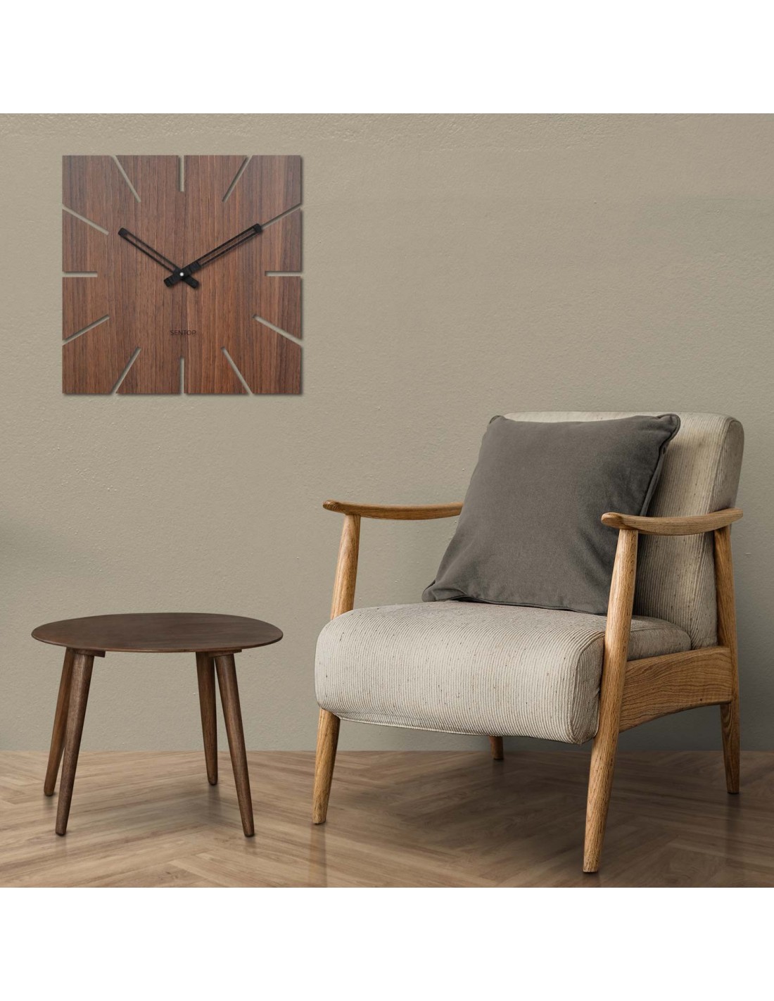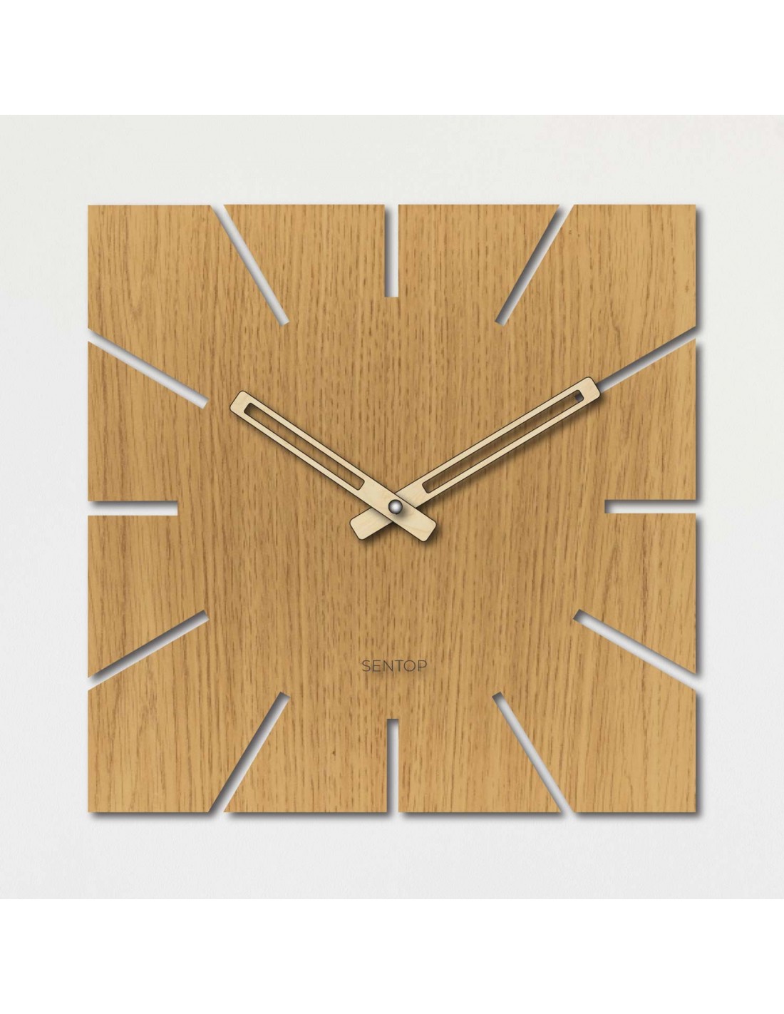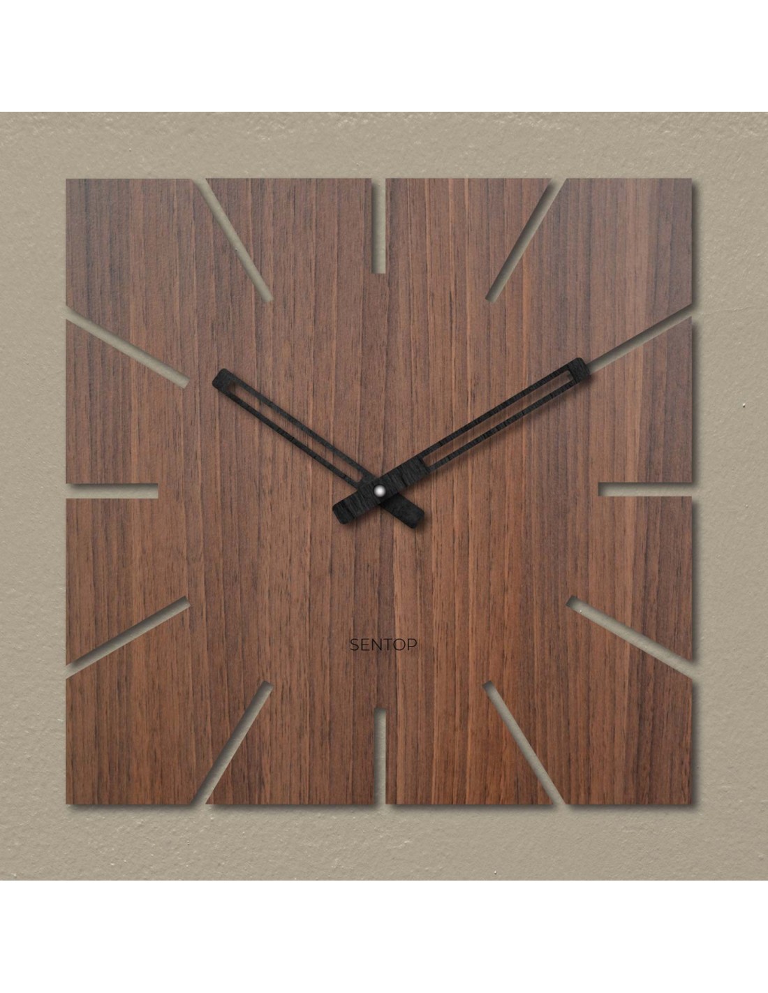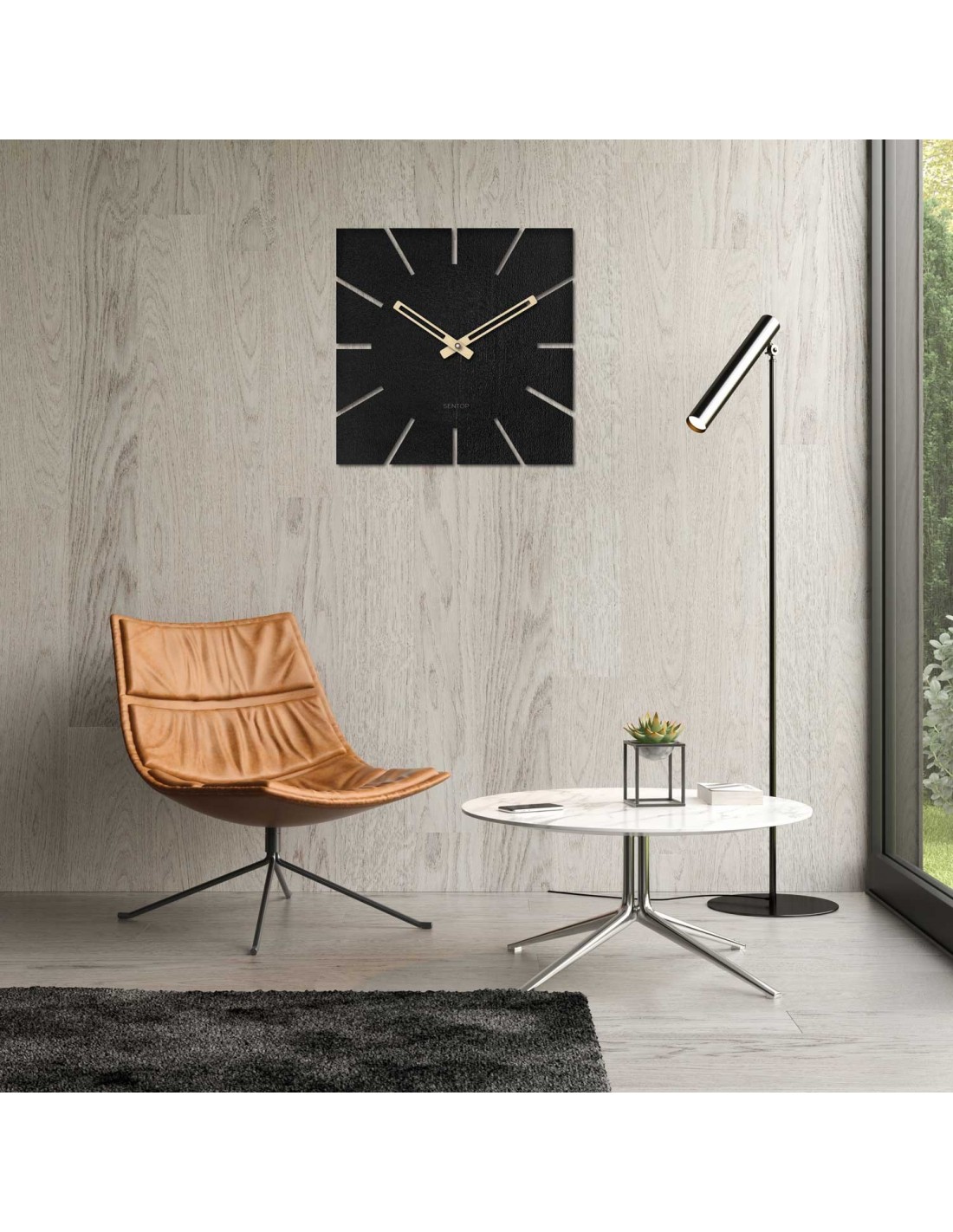 Das quadratische Format mit präzise gefrästen Aussparungen anstelle von Ziffern und markanten schwarzen Zeigern schafft einen modernen und dennoch zeitlosen Akzent, der sich harmonisch in jeden Raum einfügt.