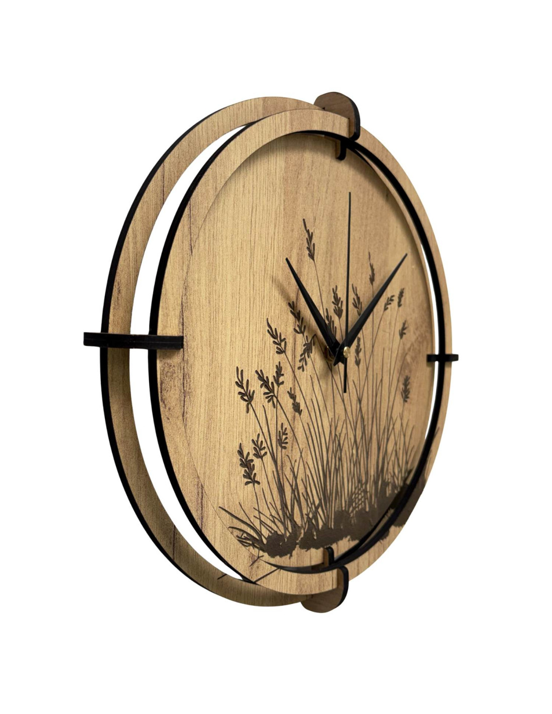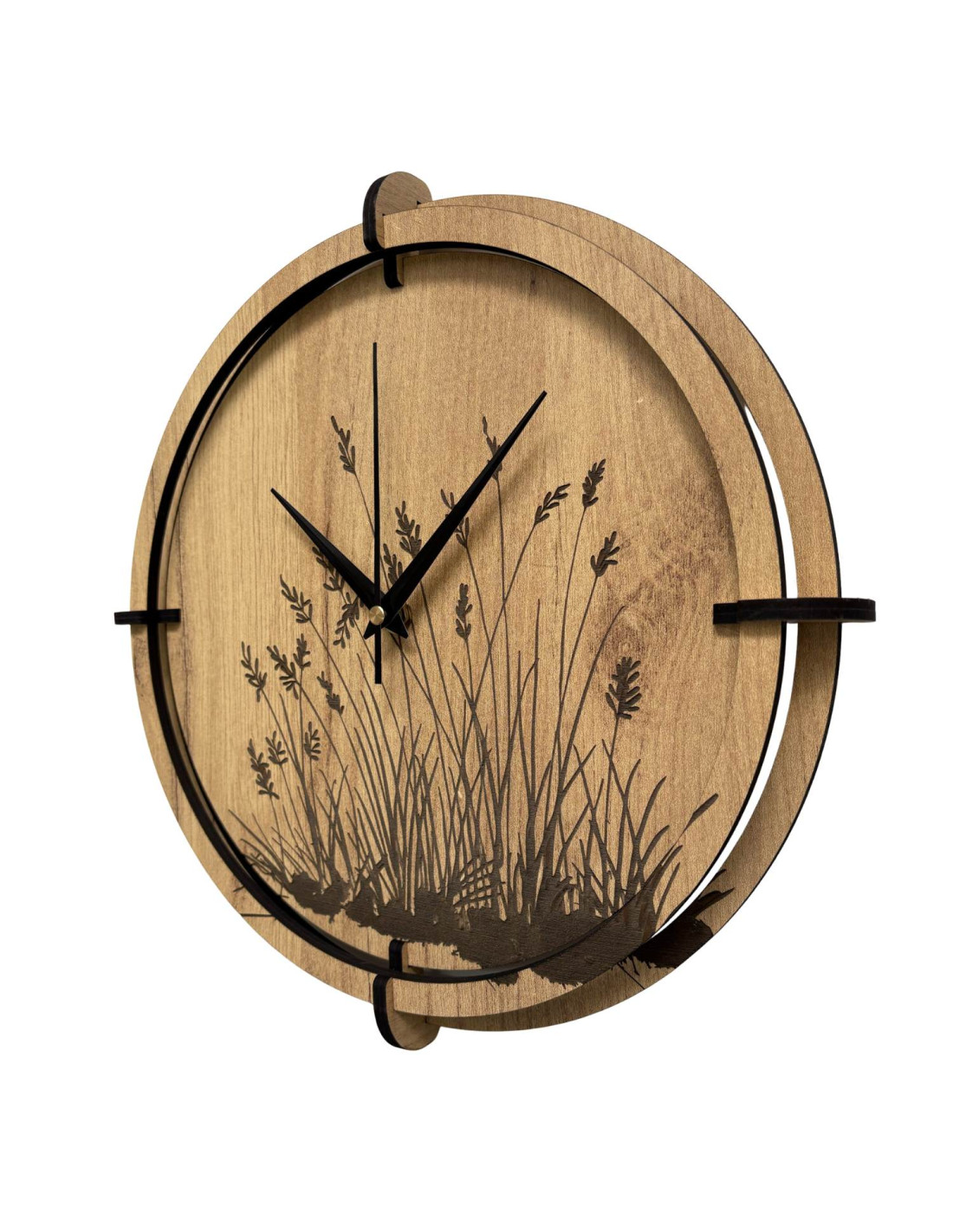 Moderne Wanduhren aus Holz mit einem filigranen, eingravierten Wiesenmotiv bringen Ruhe und Harmonie in den Innenraum.