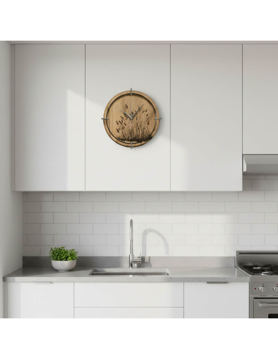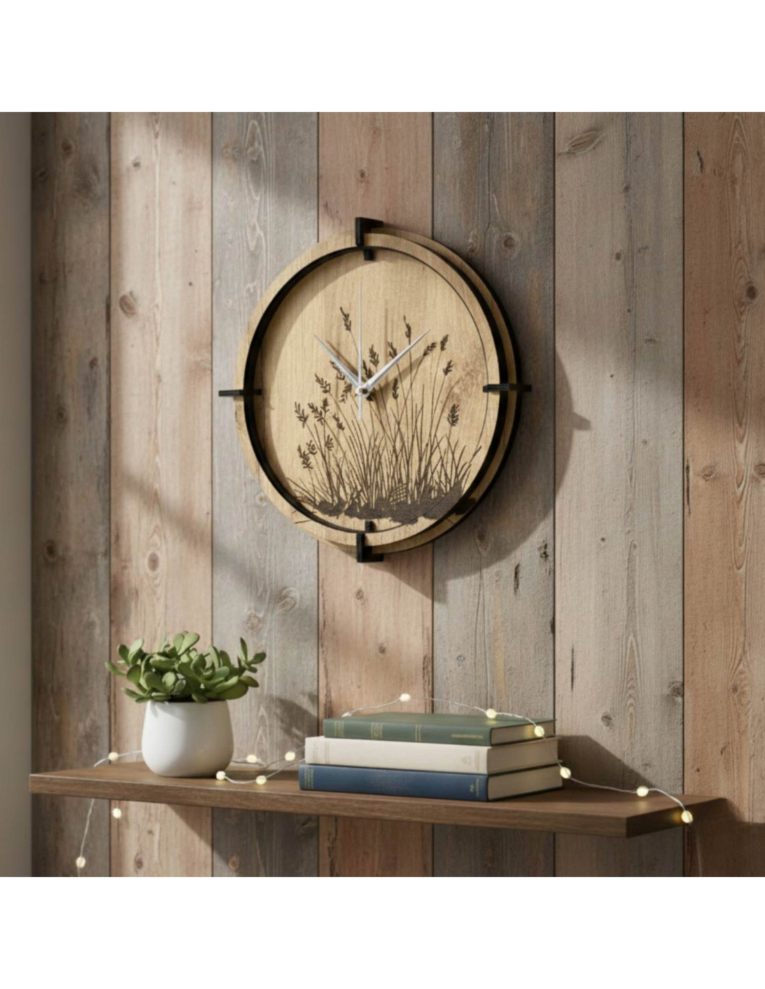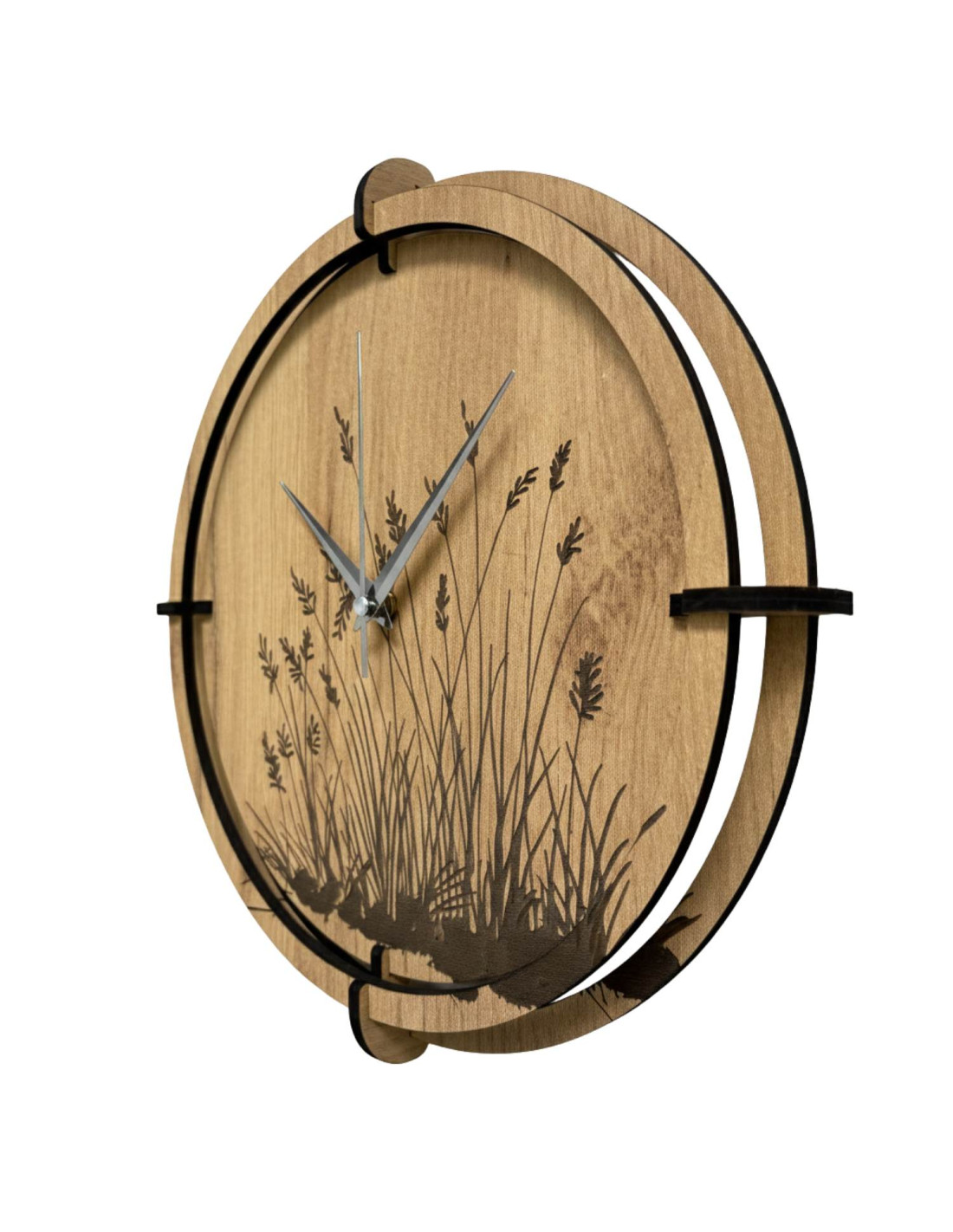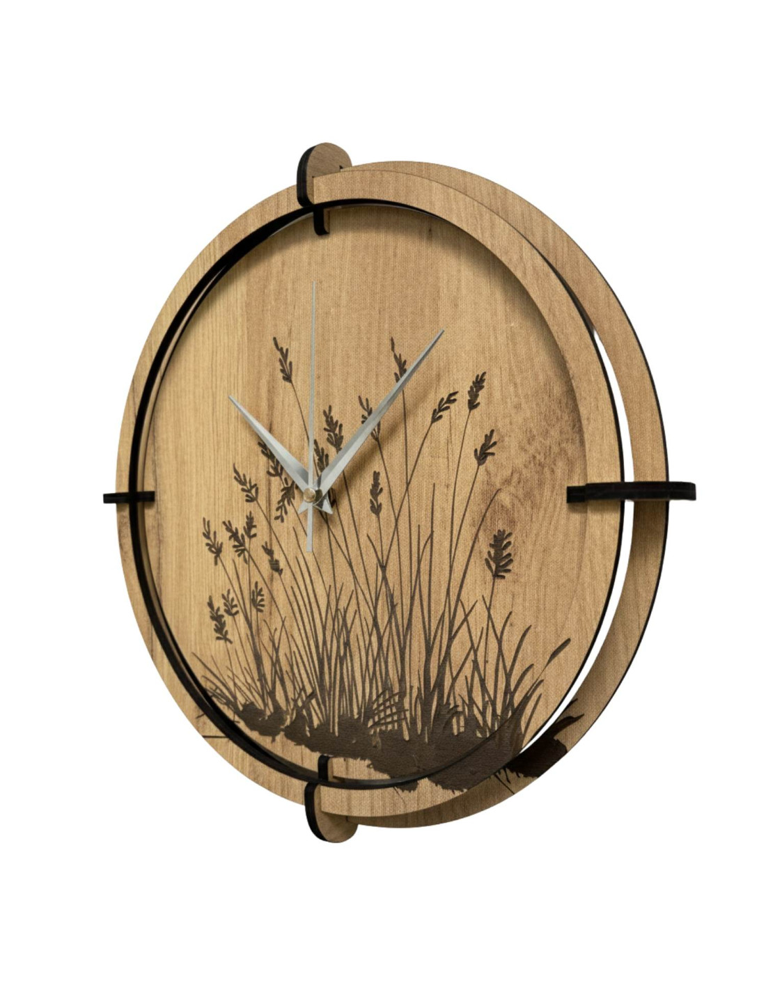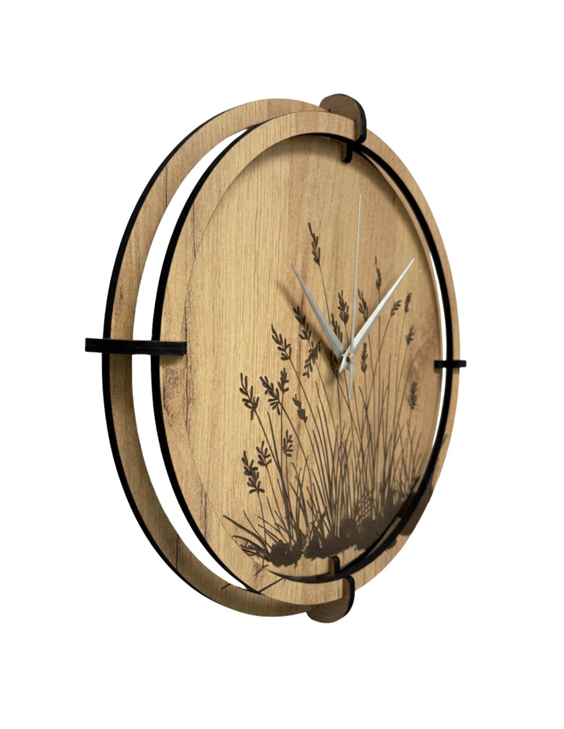 Moderne Wanduhren aus Holz mit einem filigranen, eingravierten Wiesenmotiv bringen Ruhe und Harmonie in den Innenraum.