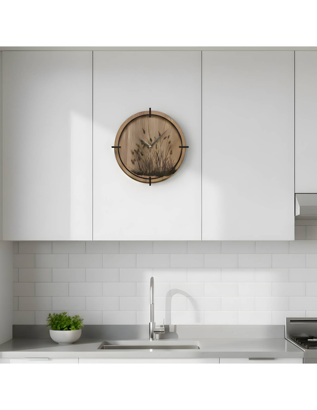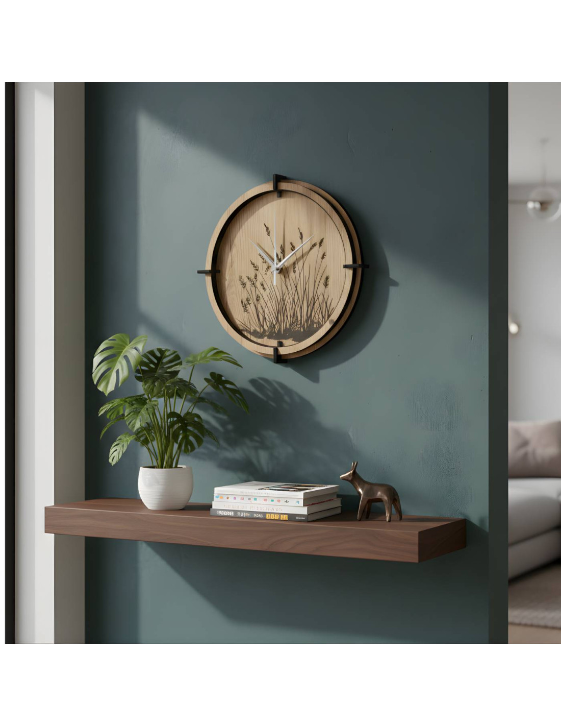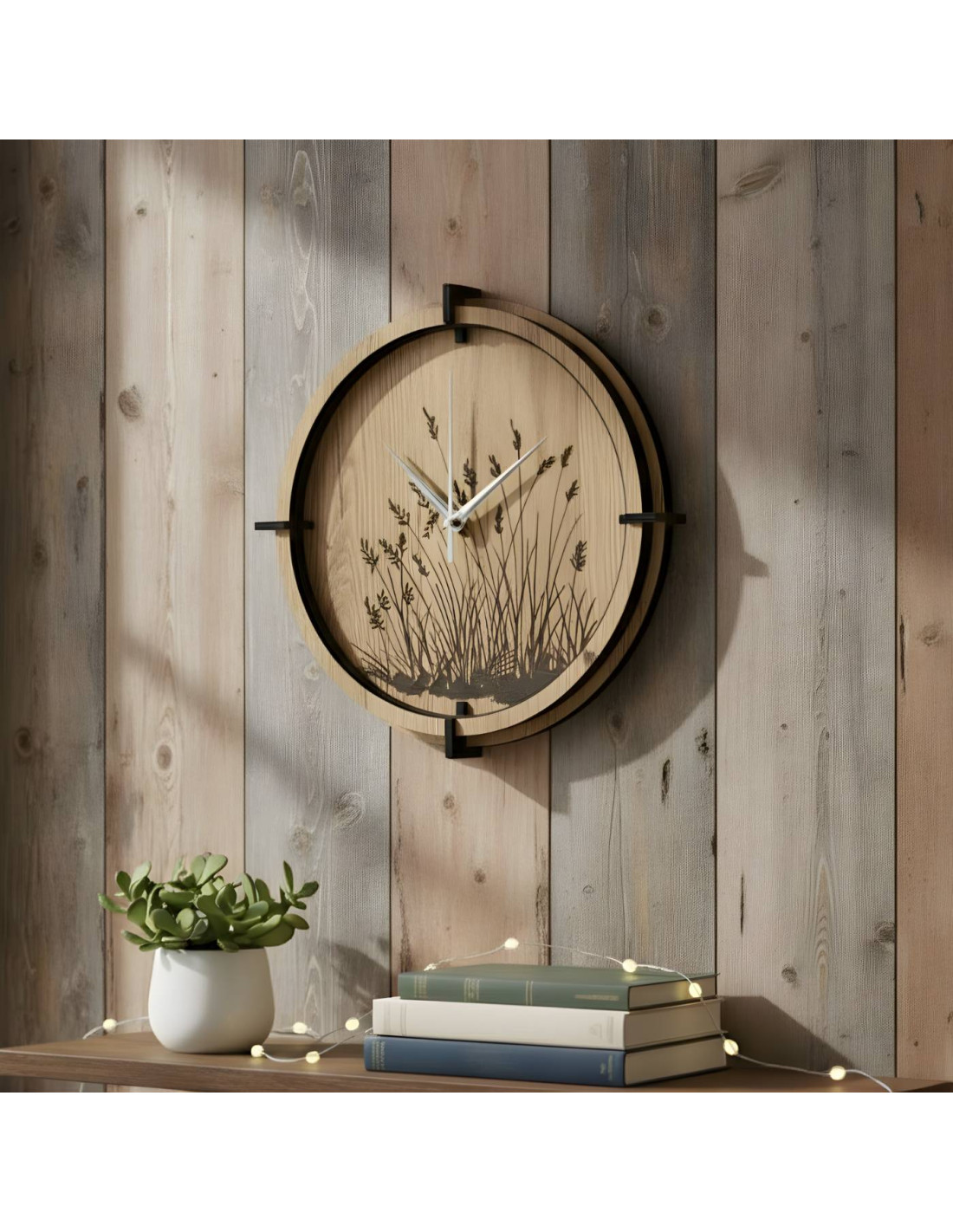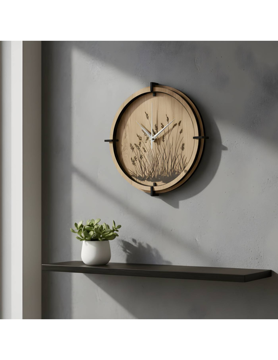 Wanduhr aus Holz mit elegantem Wiesengrasmotiv