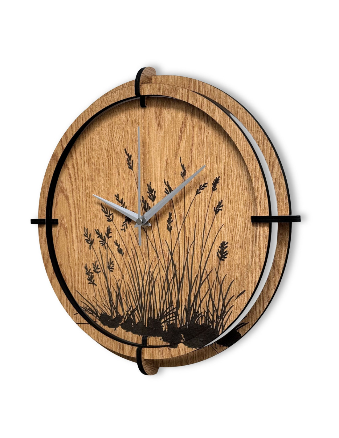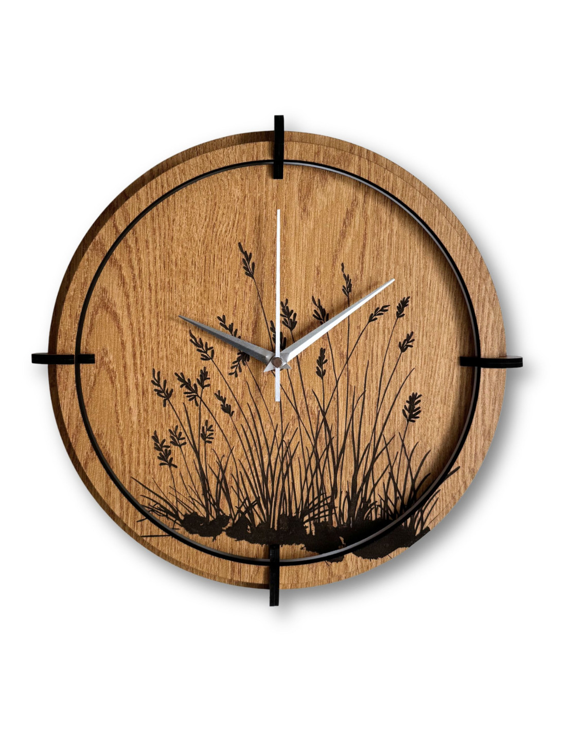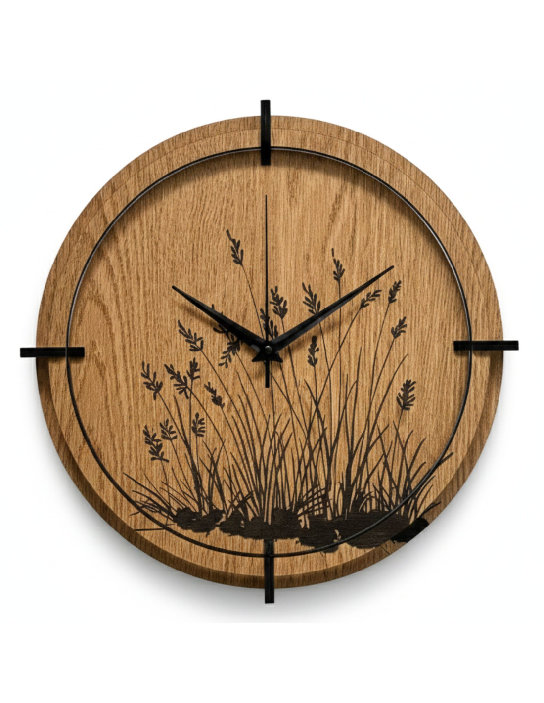 Moderne Wanduhren aus Holz mit einem filigranen, eingravierten Motiv von Wiesengräsern bringen natürliche Harmonie und zeitloses Design in den Innenraum.