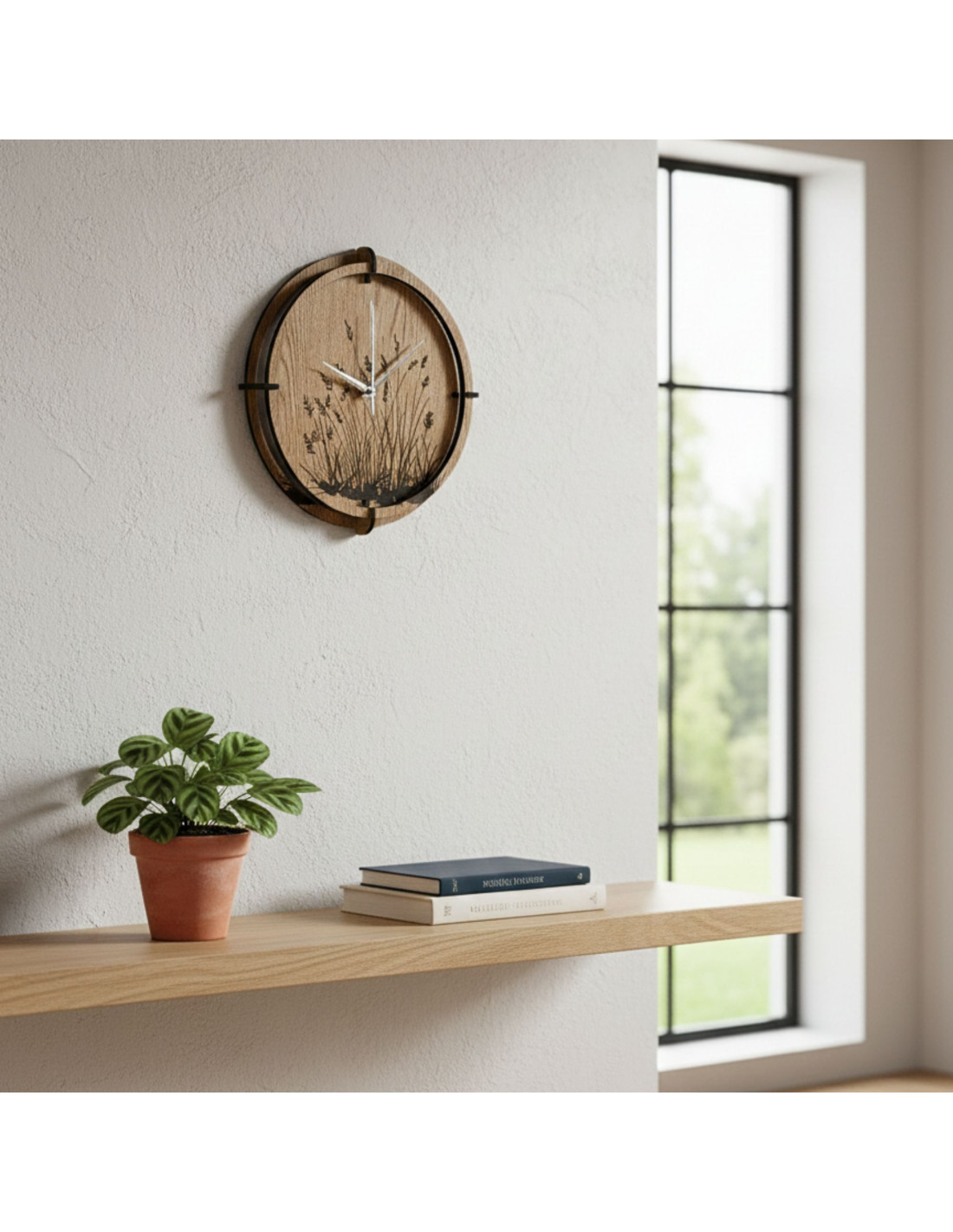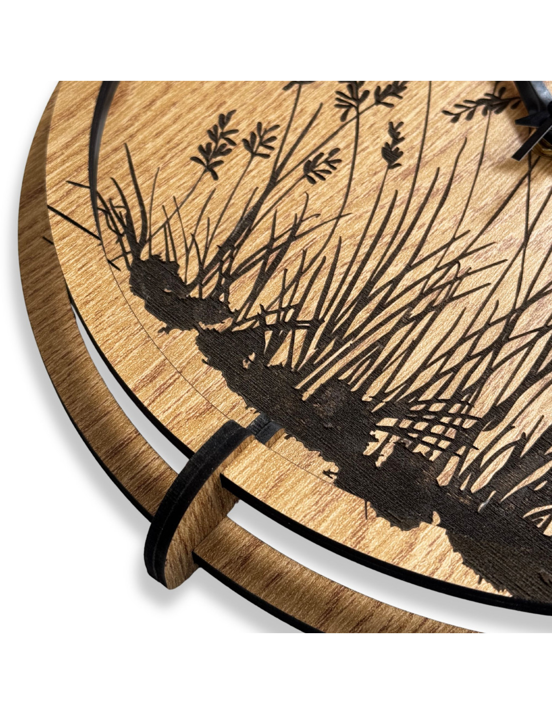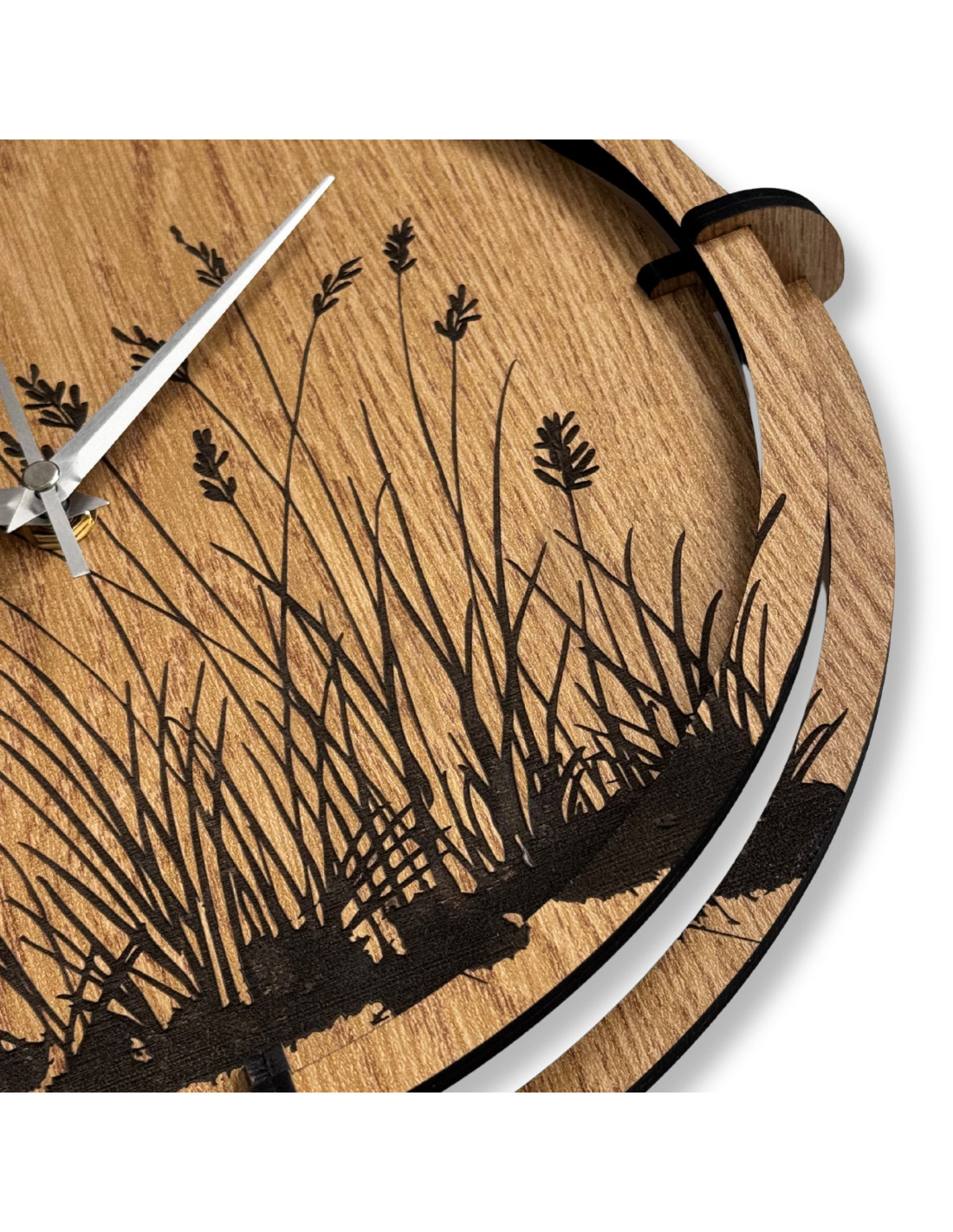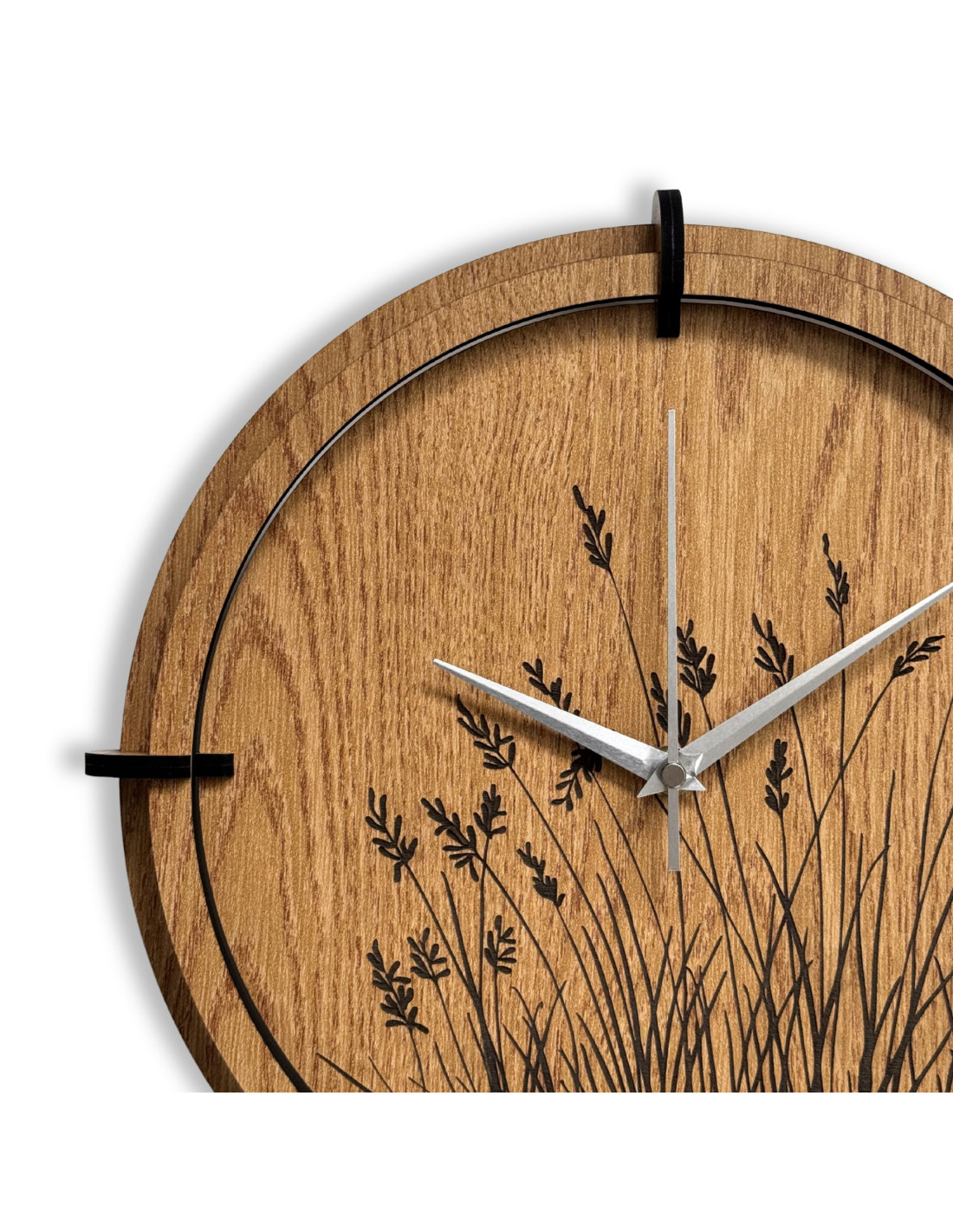 Moderne Wanduhren aus Holz mit einem filigranen, eingravierten Motiv von Wiesengräsern bringen natürliche Harmonie und zeitloses Design in den Innenraum.