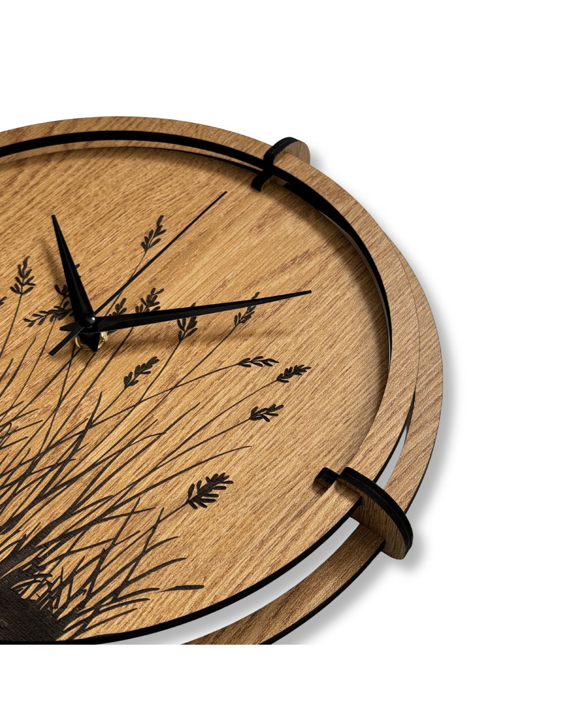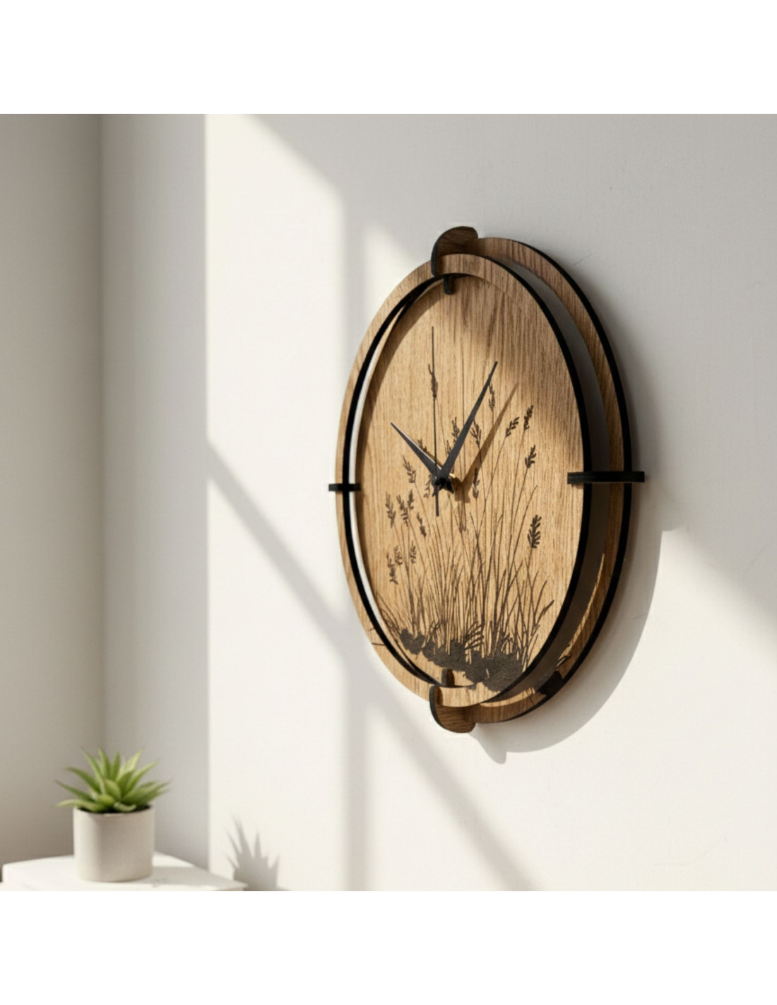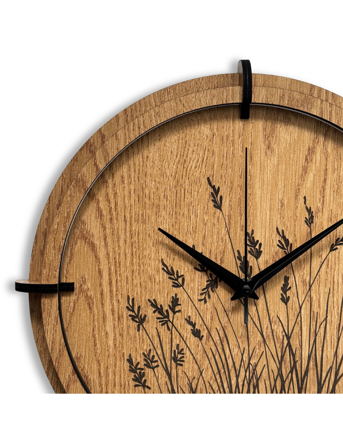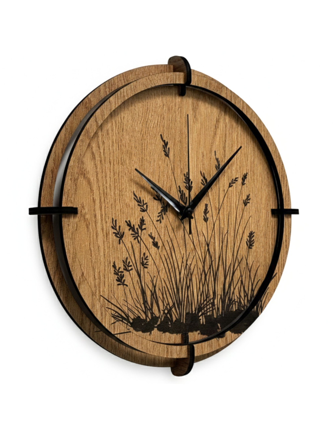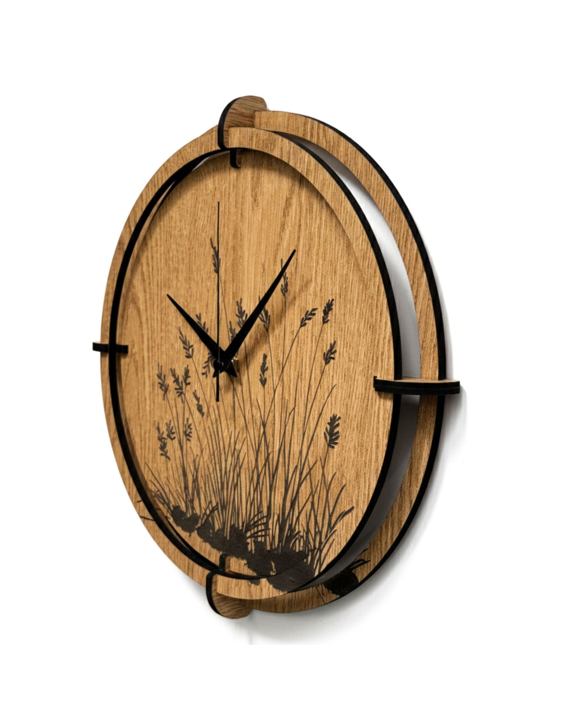 Moderne Wanduhren aus Holz mit einem filigranen, eingravierten Motiv von Wiesengräsern bringen natürliche Harmonie und zeitloses Design in den Innenraum.
