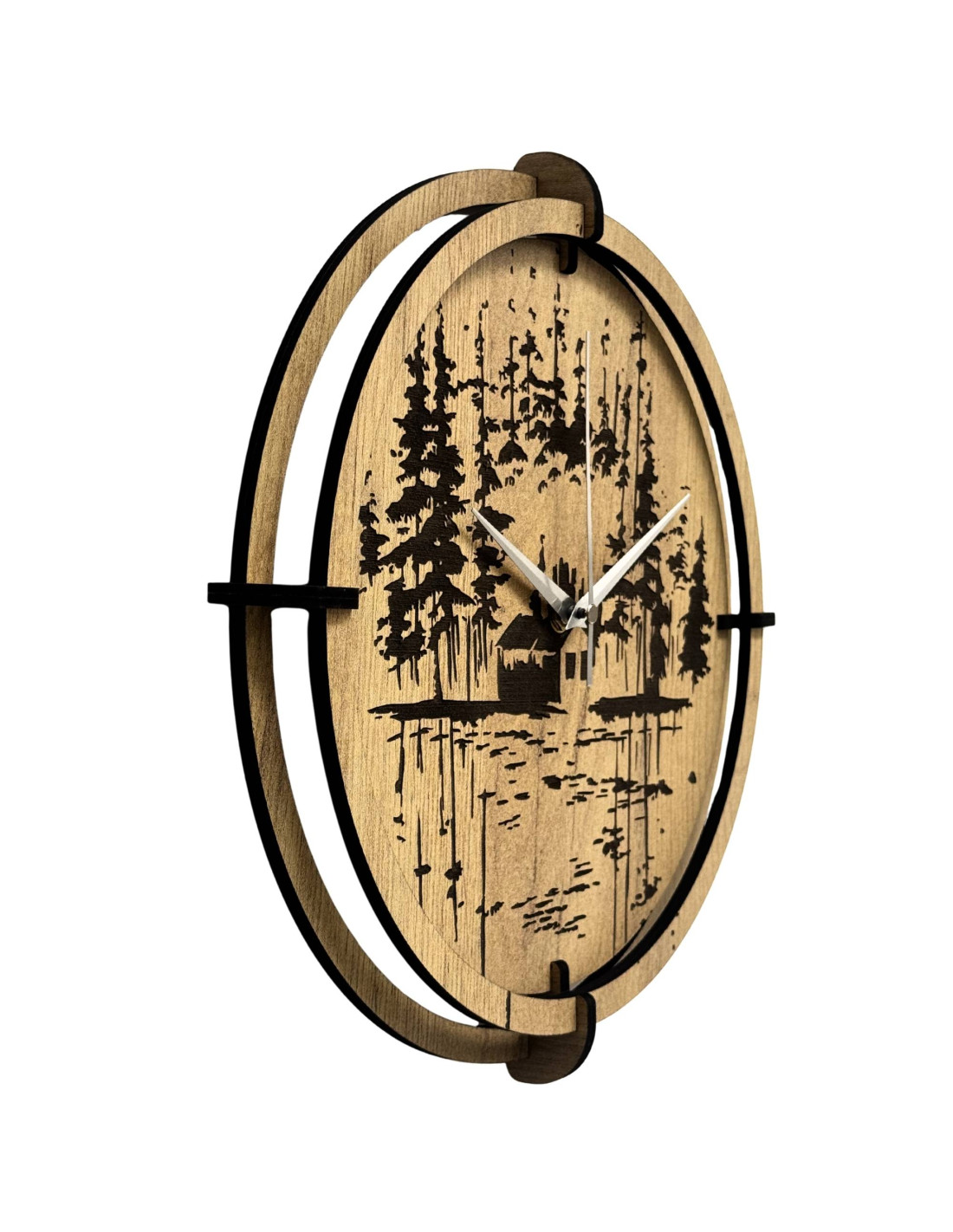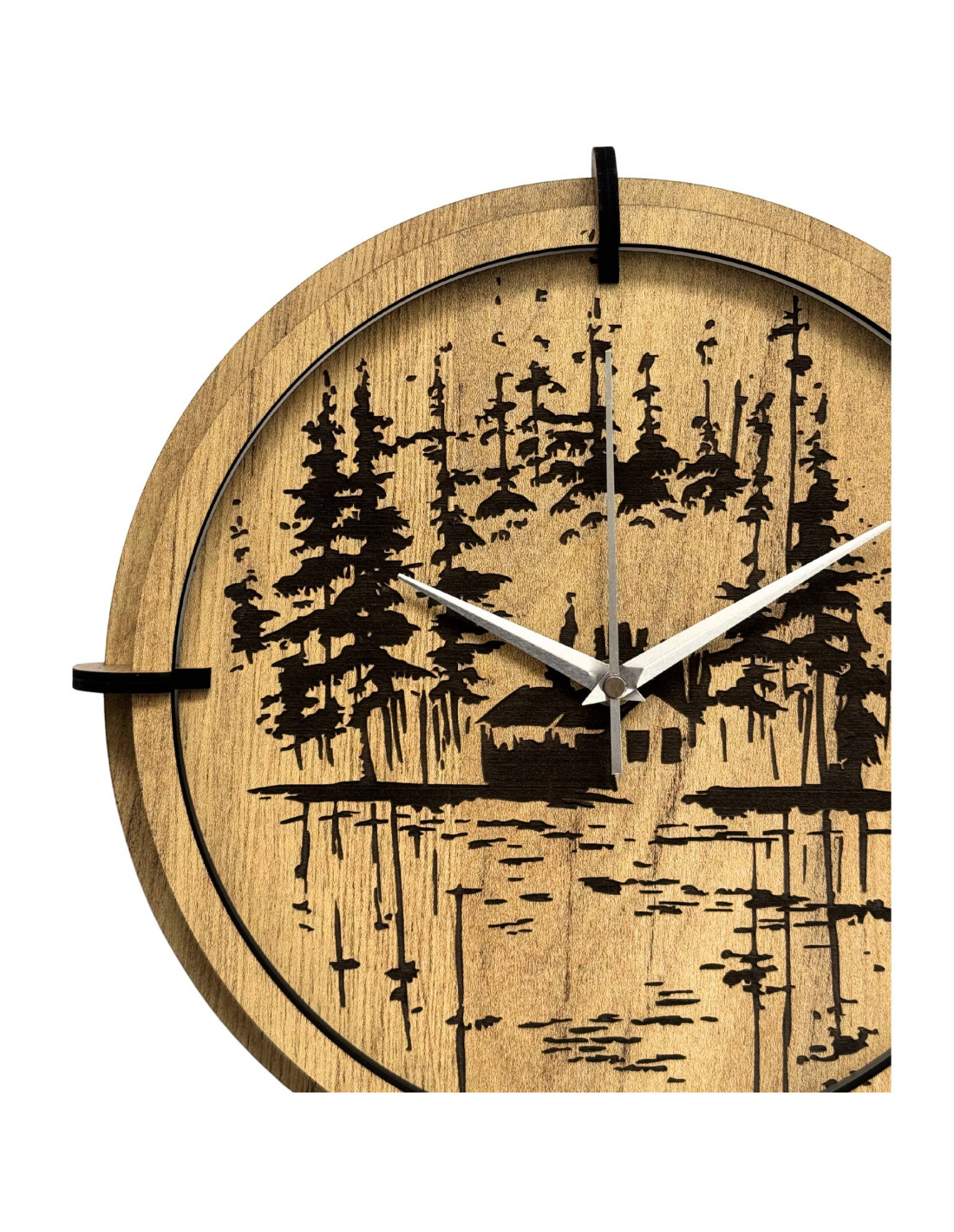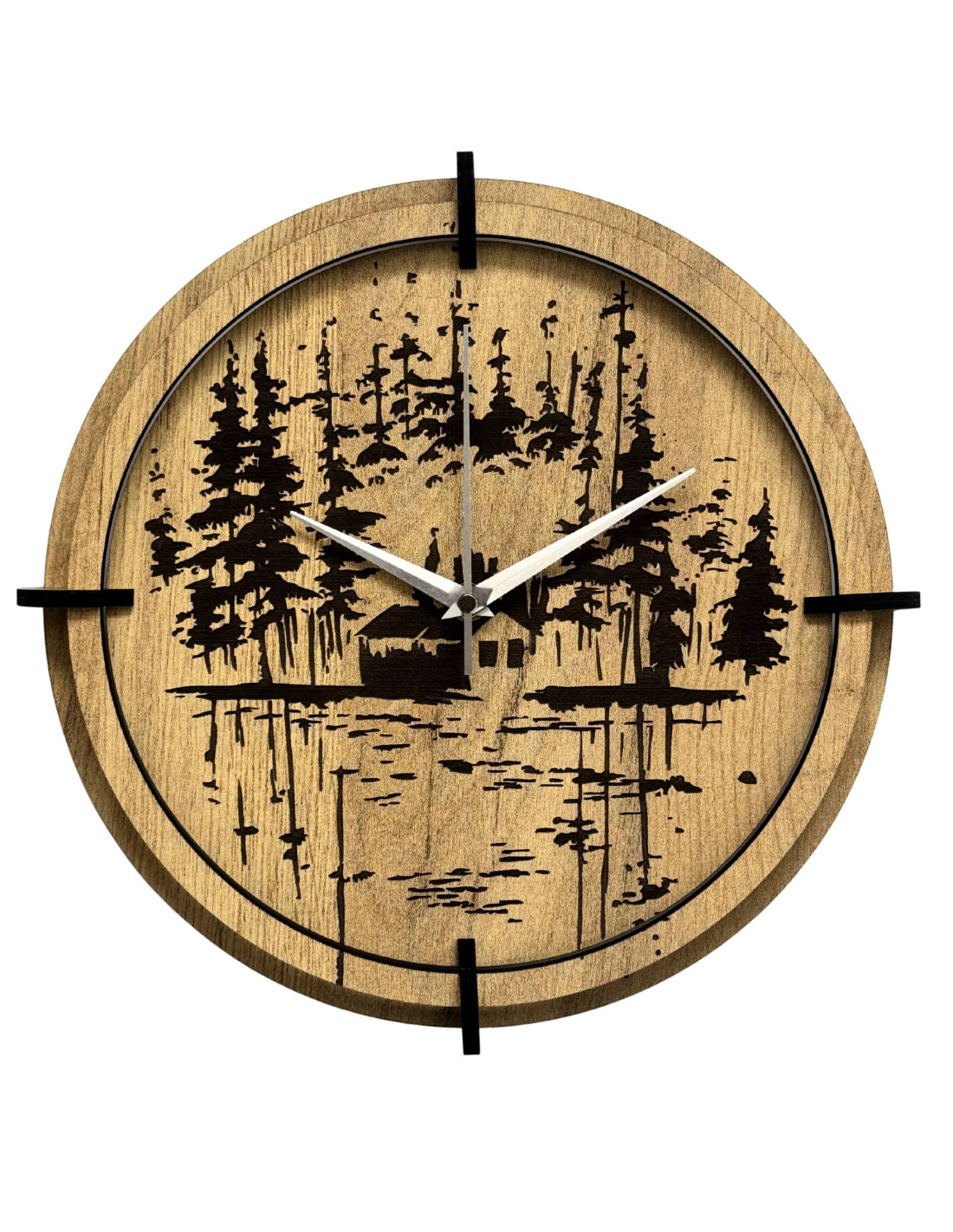 Moderne Wanduhren aus Holz mit einem präzise eingravierten Motiv einer Waldhütte am See bringen die Ruhe der Natur und die einzigartige Atmosphäre des Waldes in den Innenraum.