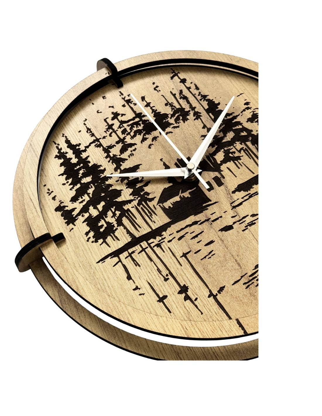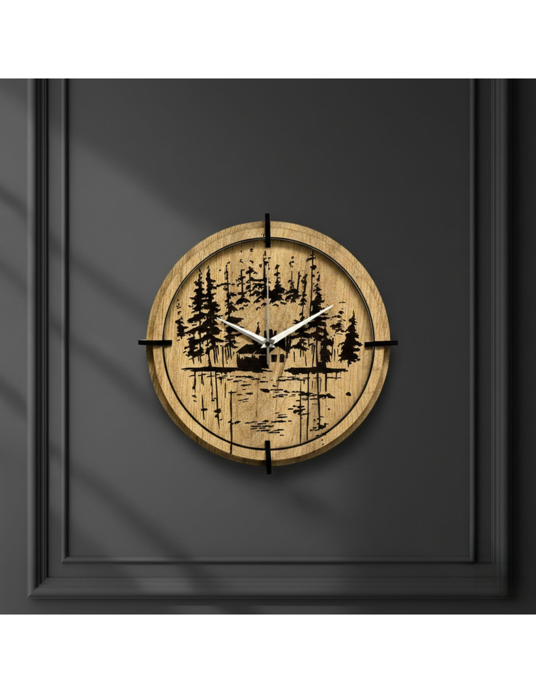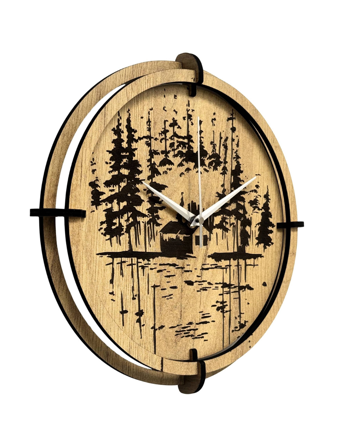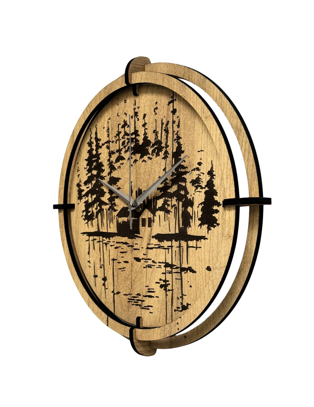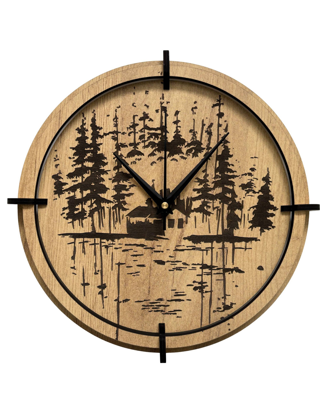 Moderne Wanduhren aus Holz mit einem präzise eingravierten Motiv einer Waldhütte am See bringen die Ruhe der Natur und die einzigartige Atmosphäre des Waldes in den Innenraum.