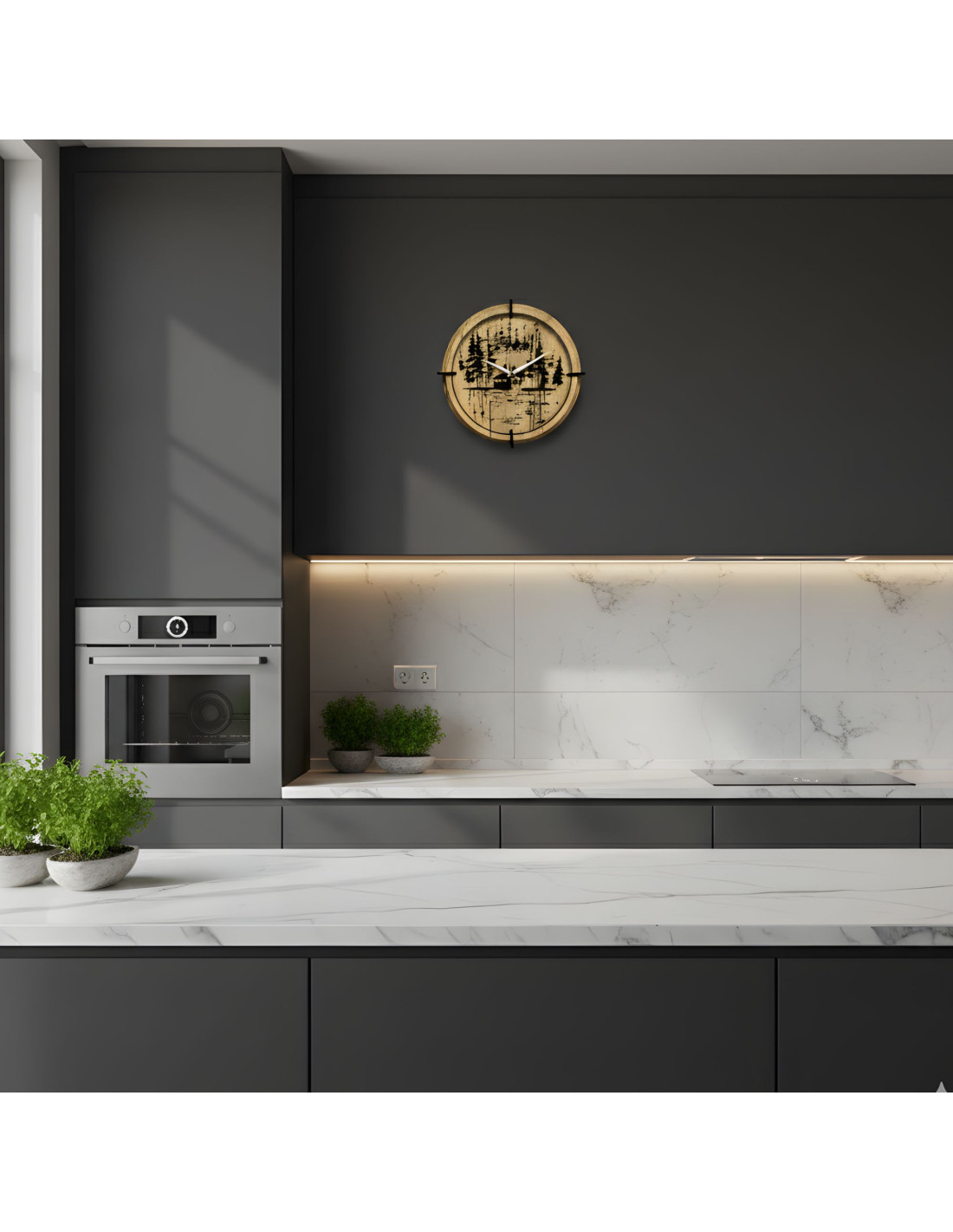 Die Uhr besteht aus einer hochwertigen HDF-Platte mit natürlicher Holzmaserung und detaillierter Laserbearbeitung des Motivs.