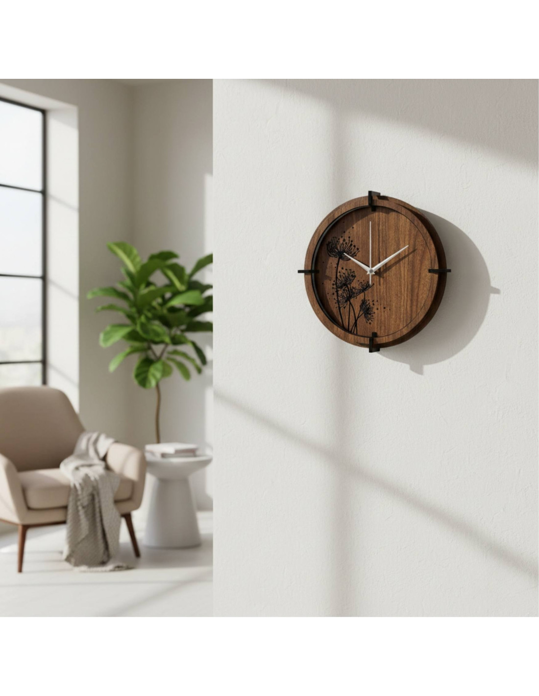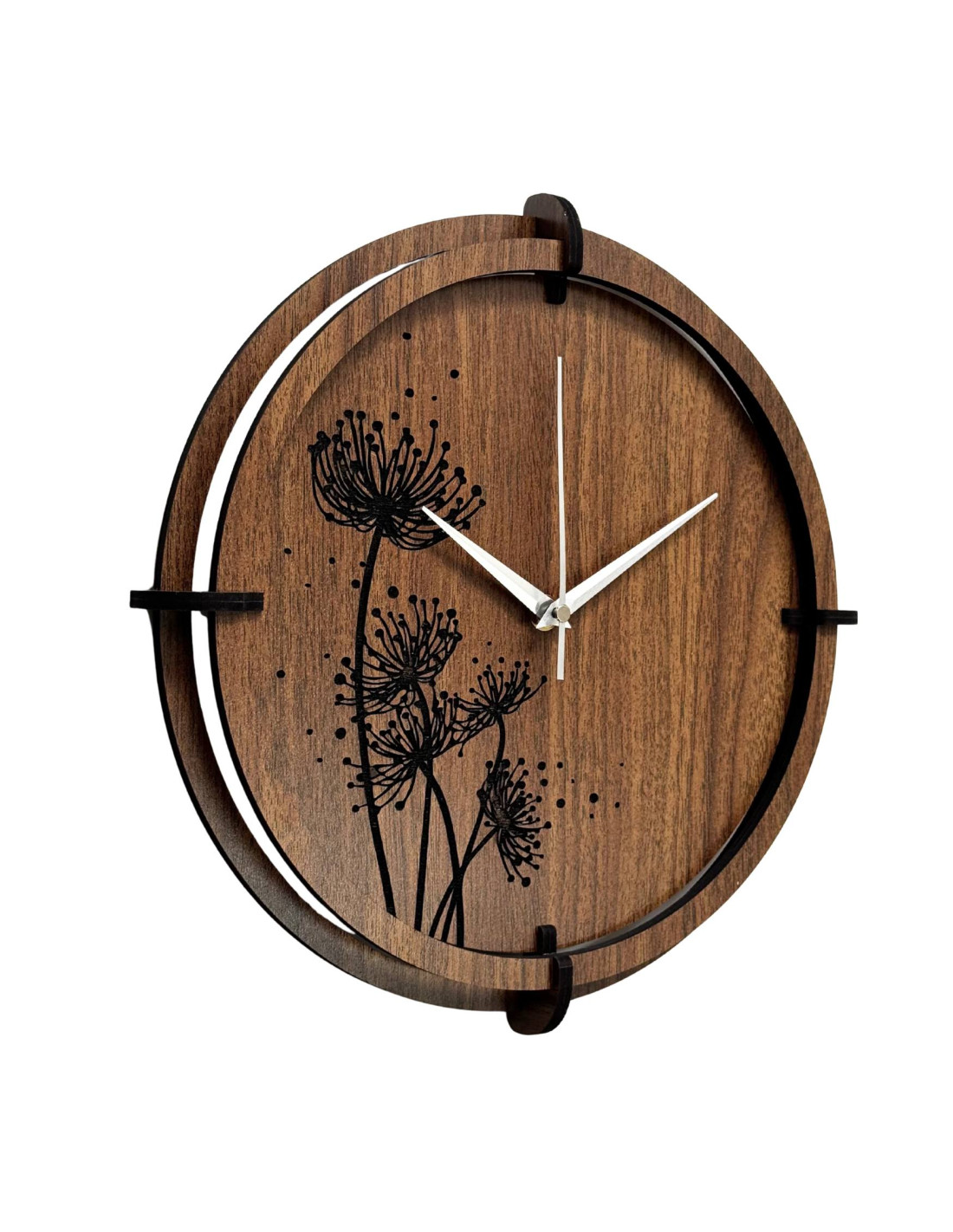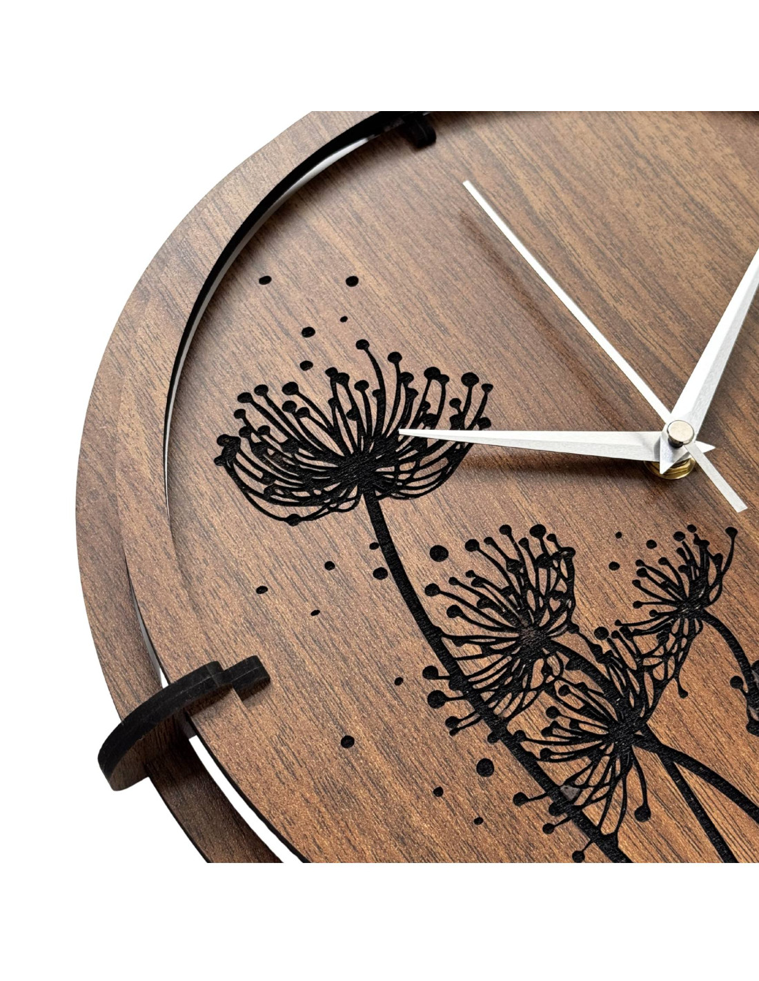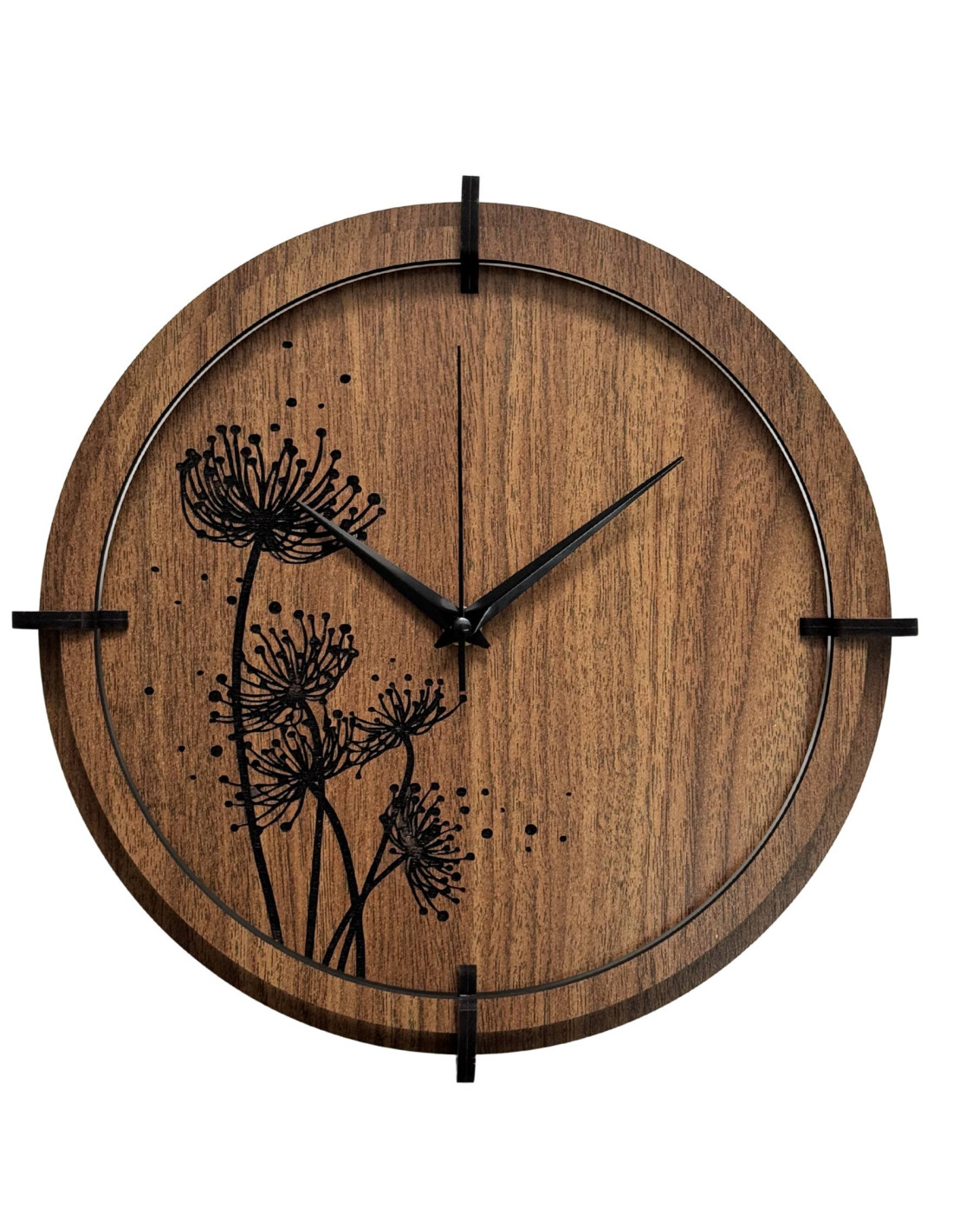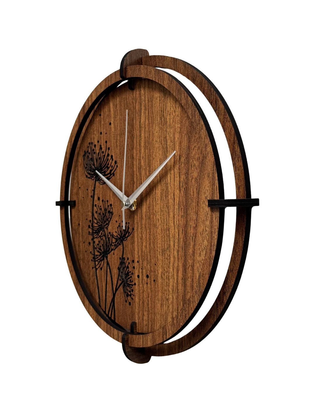 Das eingravierte Blumenmotiv mit seinen feinen Details wirkt modern und harmonisch, während die schwarzen, silberfarbenen Zeiger und der Holzkreis den Designer-Look unterstreichen.