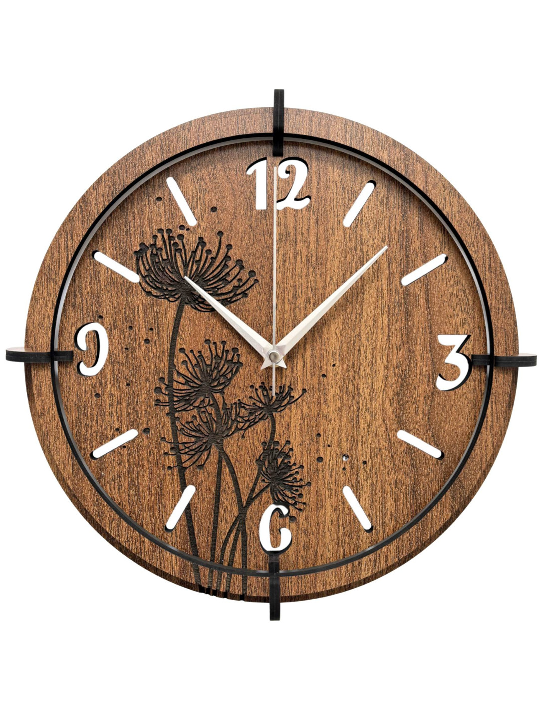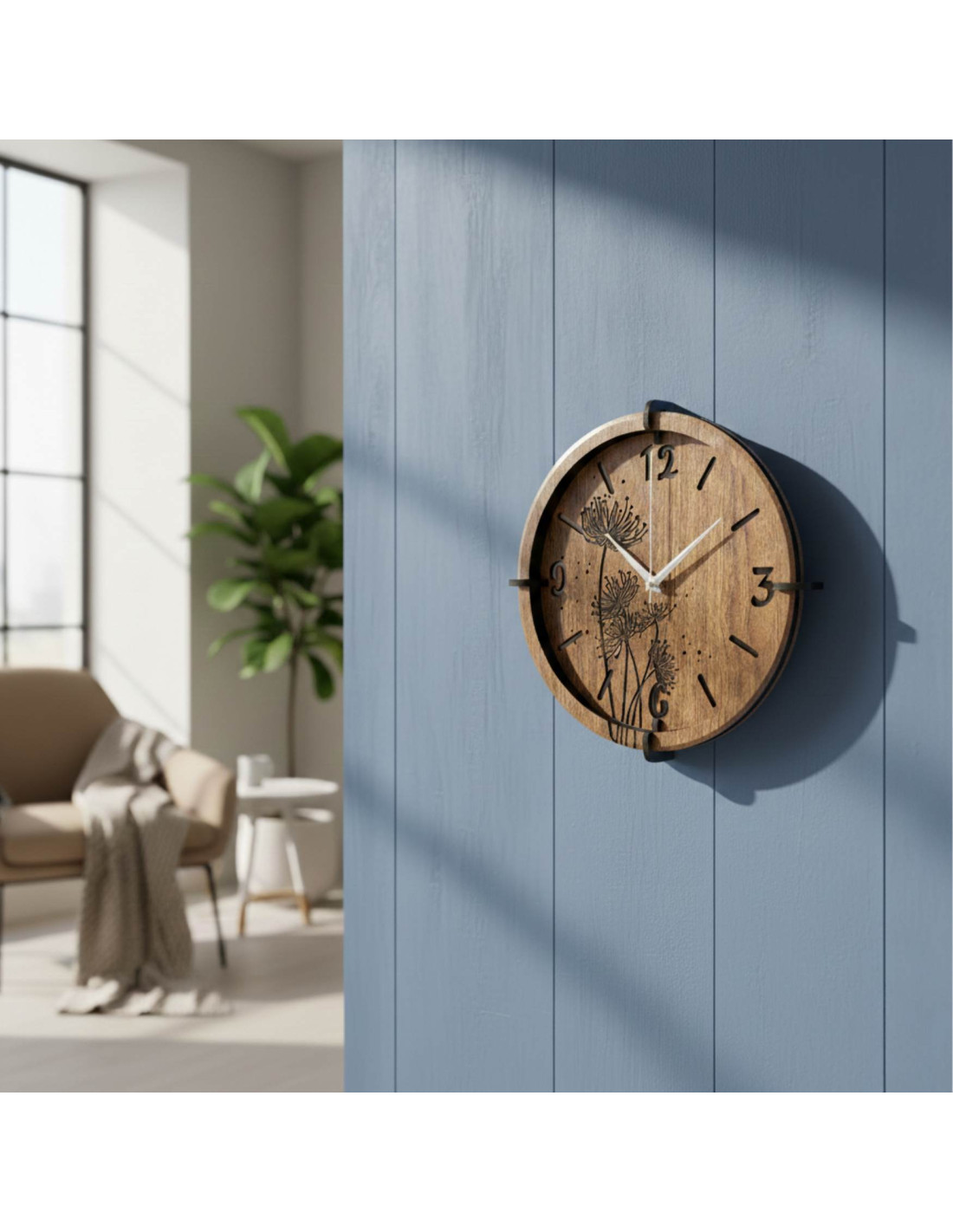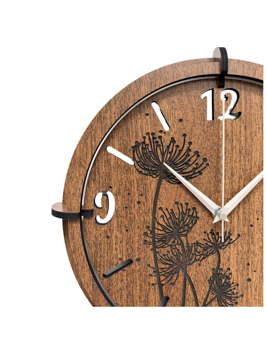 Moderne Wanduhren aus Holz mit einem Motiv aus Löwenzahn und Wiesengräsern bringen Ruhe und Harmonie in den Innenraum.