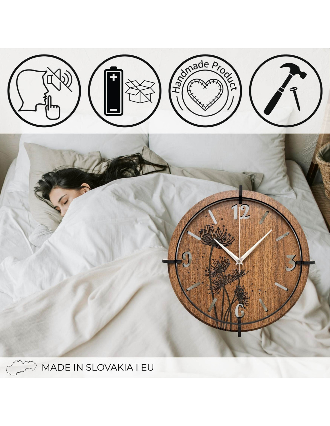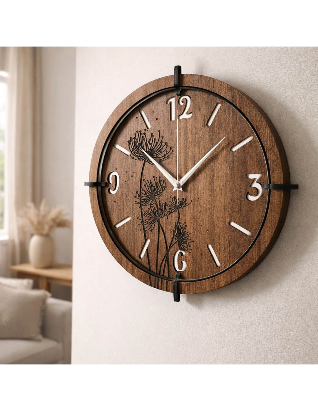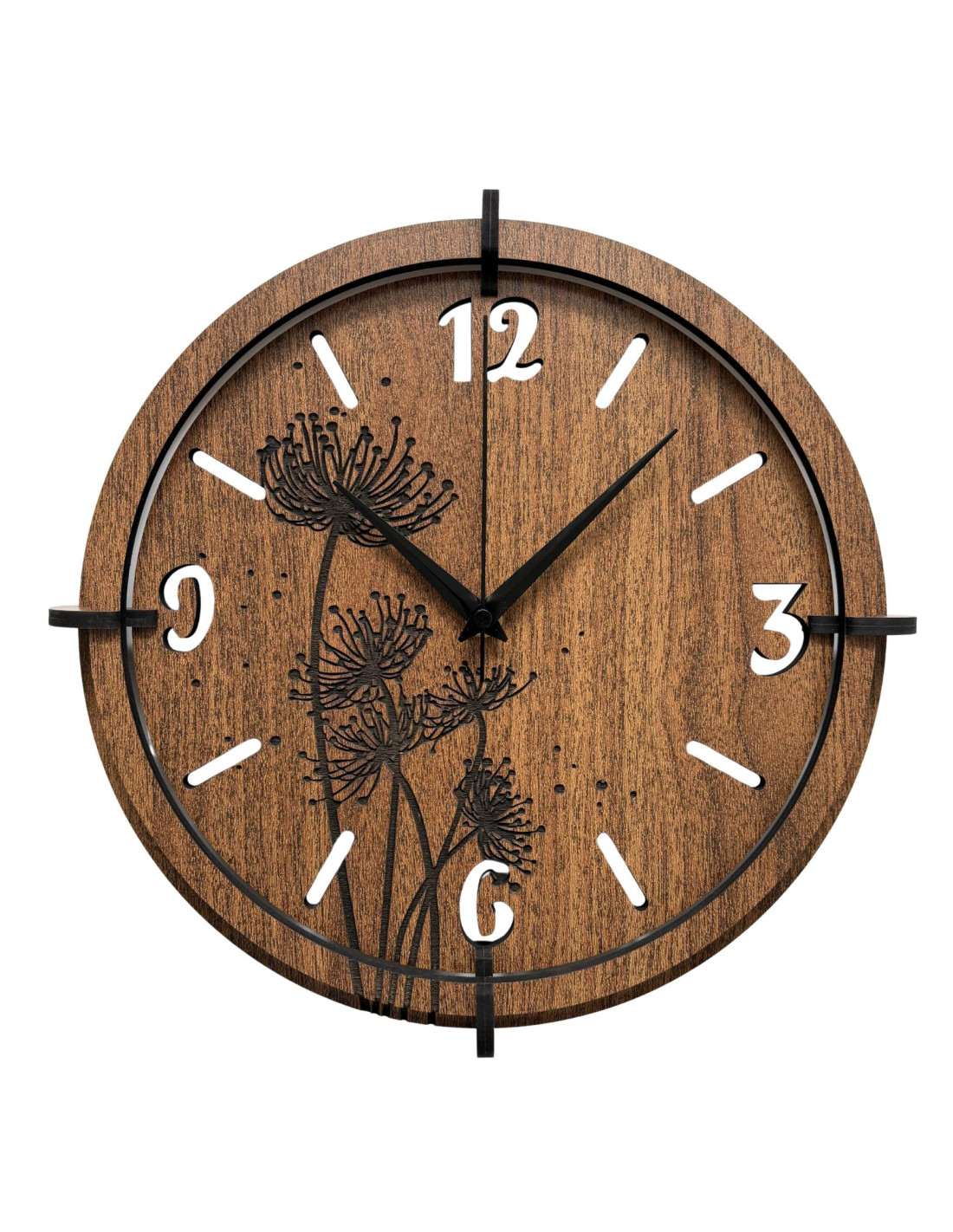 Moderne Wanduhren aus Holz mit einem Motiv aus Löwenzahn und Wiesengräsern bringen Ruhe und Harmonie in den Innenraum.