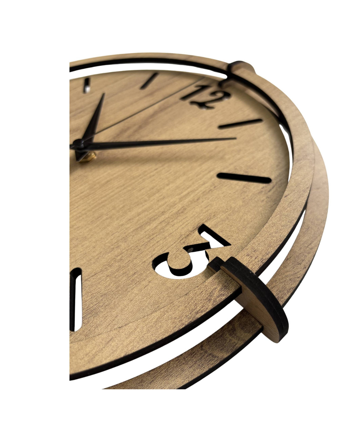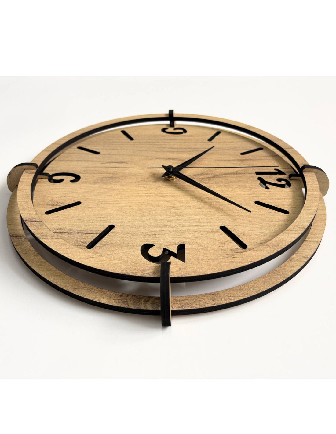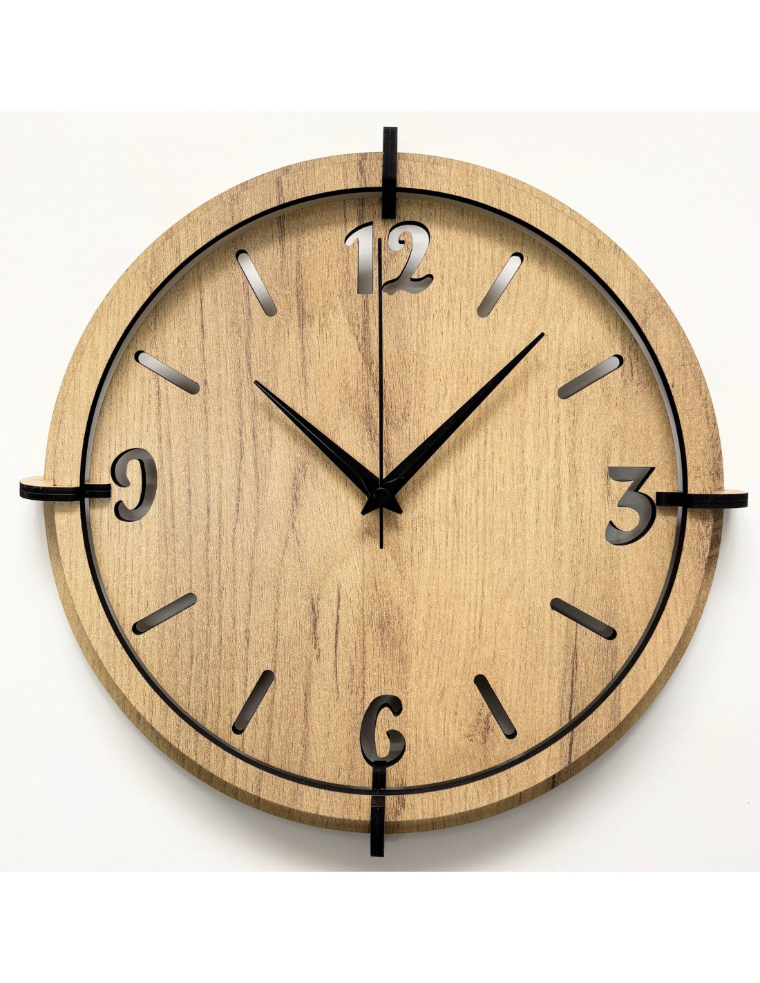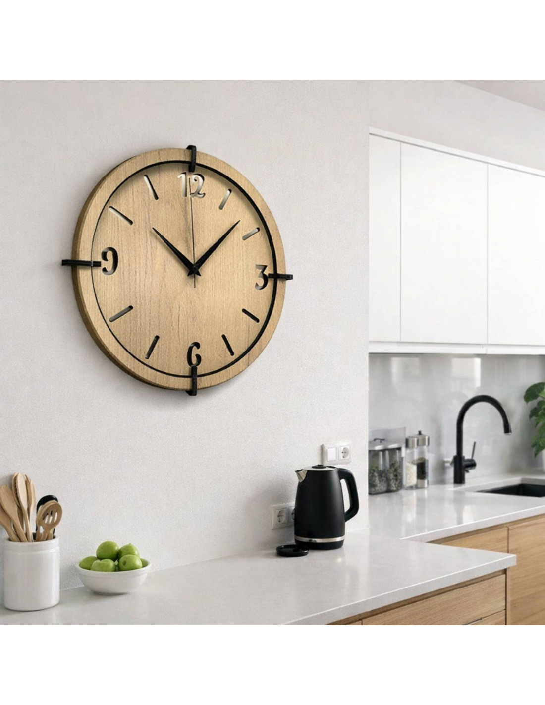 Moderne Wanduhren aus Holz in stilvollem Eichenholz-Design mit markanten schwarzen Elementen verleihen dem Interieur einen eleganten und zeitlosen Charakter.