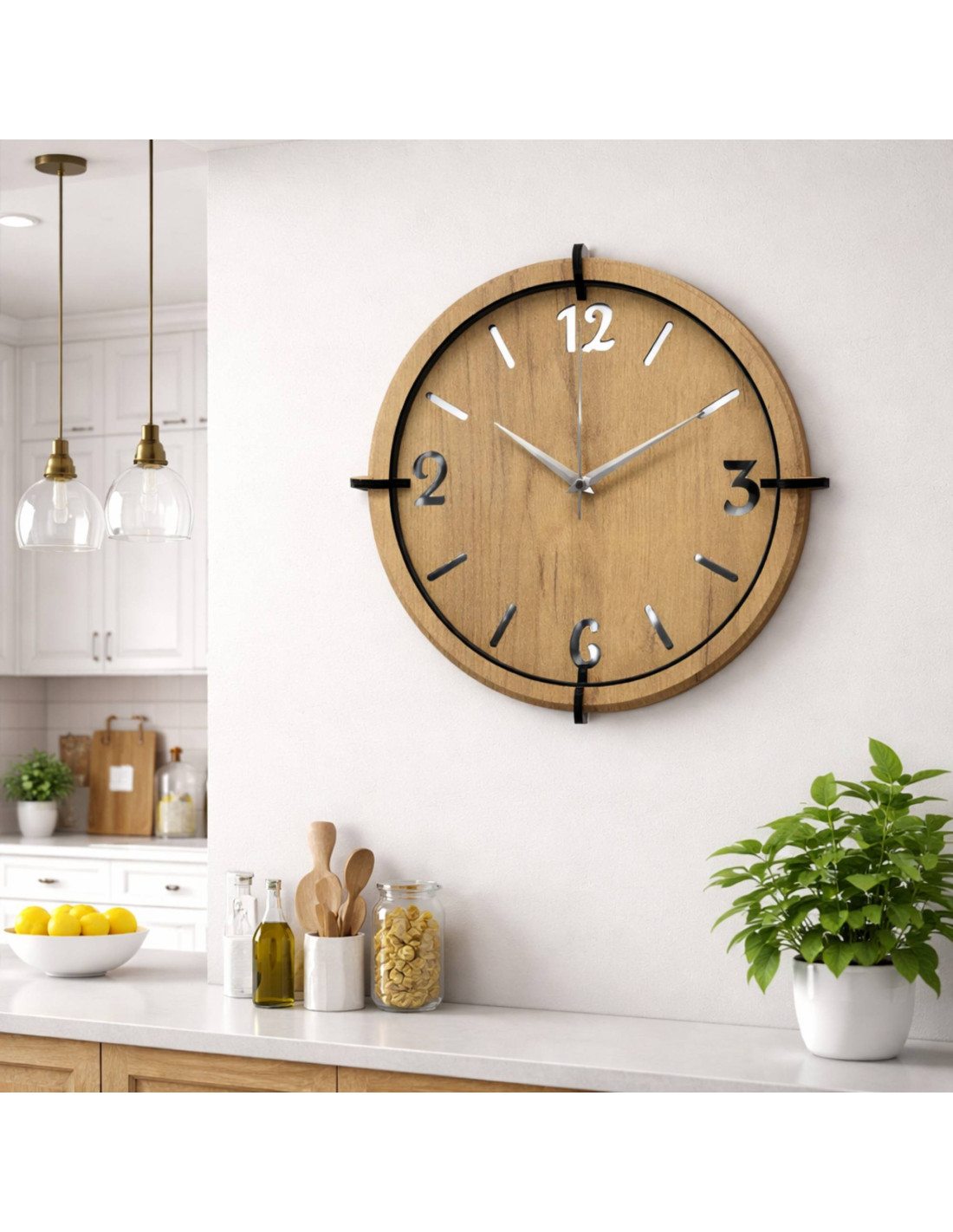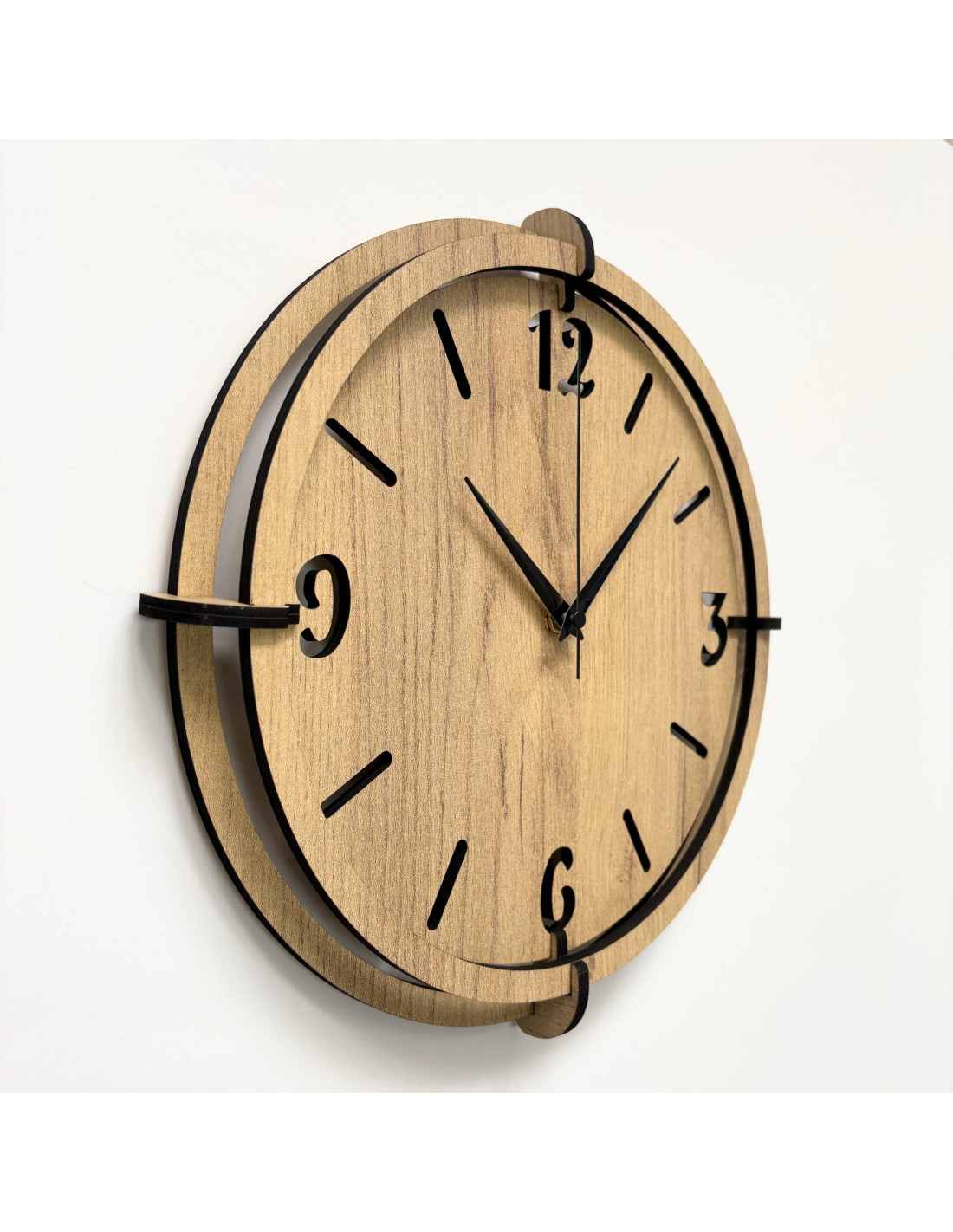 Moderne Wanduhren aus Holz in stilvollem Eichenholz-Design mit markanten schwarzen Elementen verleihen dem Interieur einen eleganten und zeitlosen Charakter.