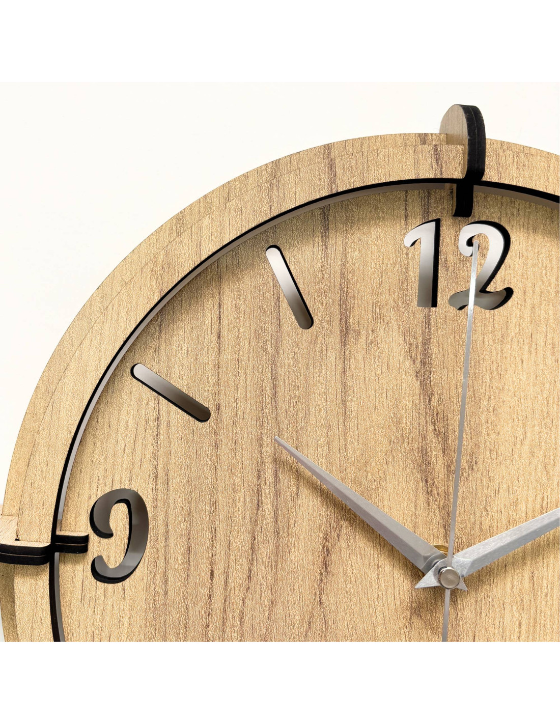 Moderne Wanduhr aus Holz in Eichenoptik mit schwarzen Ziffern.