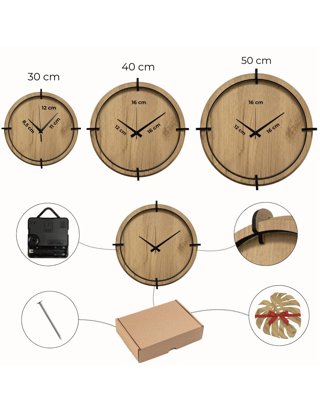 - Uhrendurchmesser: Wählen Sie zwischen 30 cm, 40 cm oder 50 cm