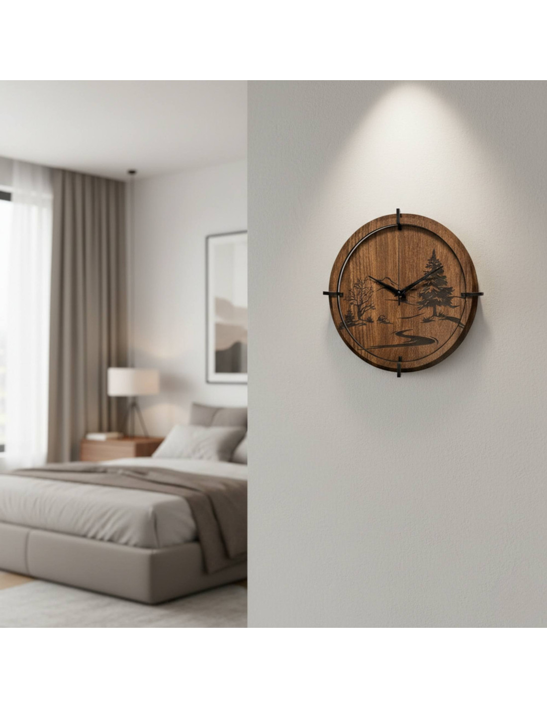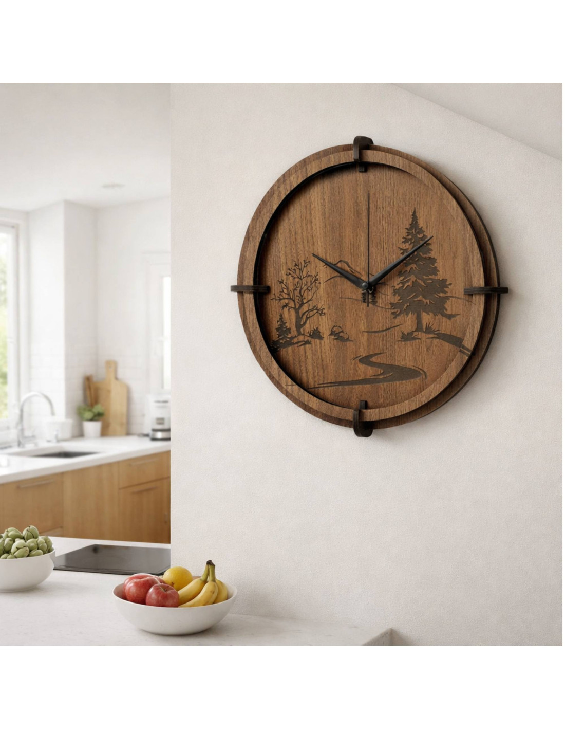 Moderne Wanduhren aus Holz mit einem detailreichen, eingravierten Motiv einer Waldlandschaft und von Bäumen bringen die Ruhe der Natur und zeitlose Eleganz in den Innenraum.