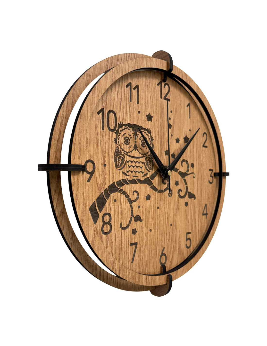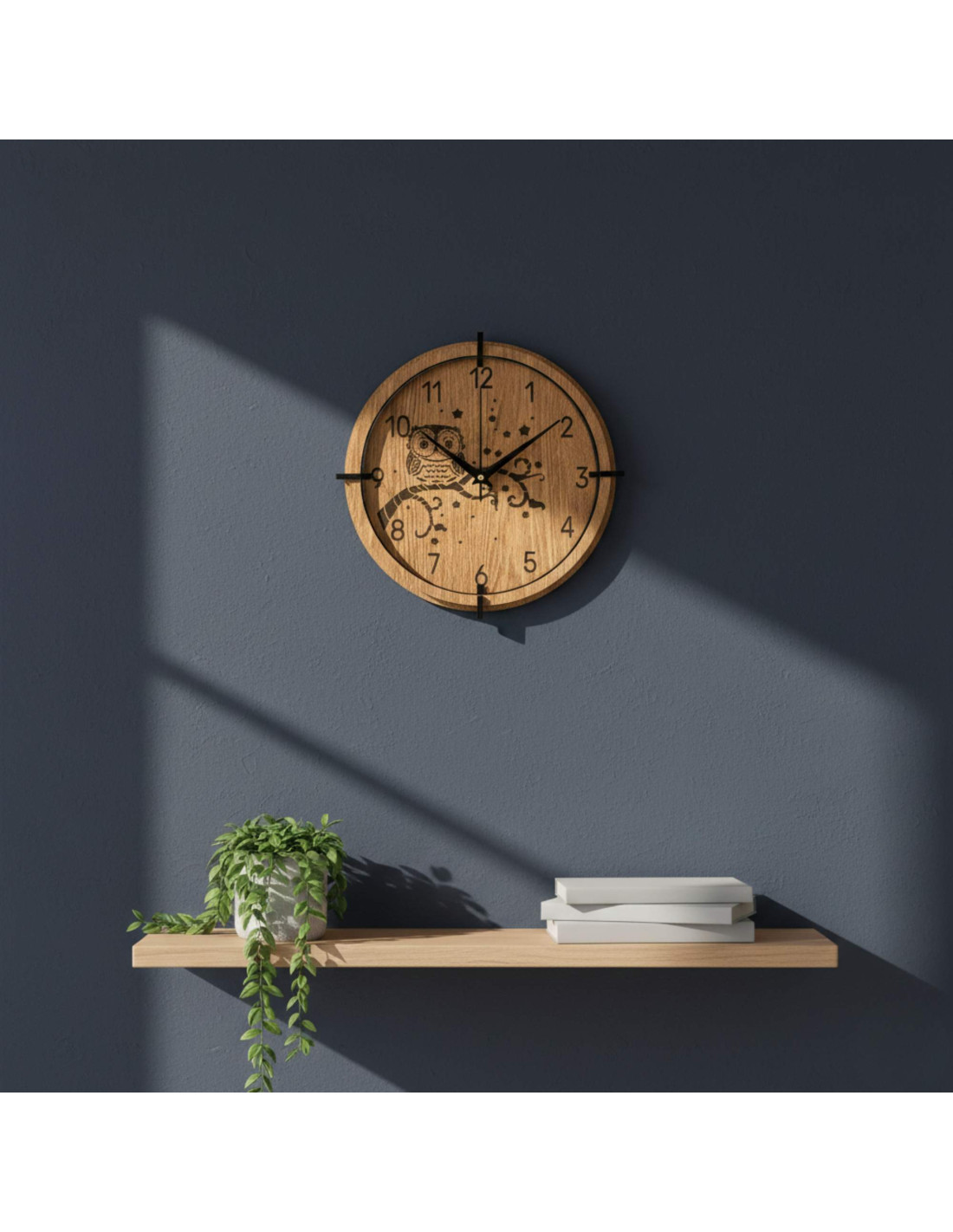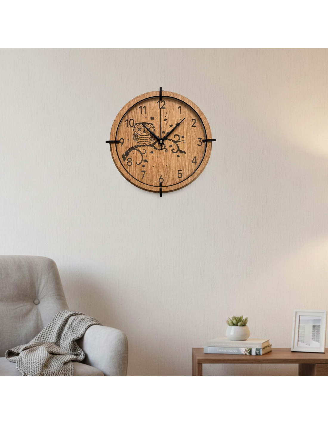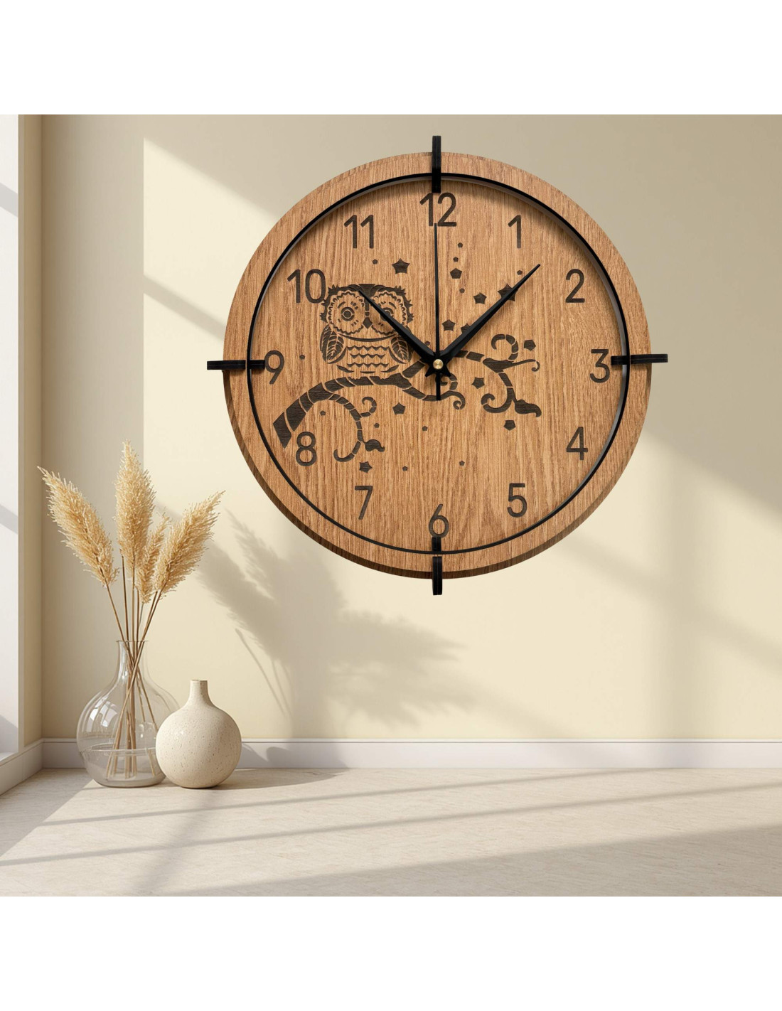 Eine moderne Wanduhr aus Holz mit einem detailreichen, eingravierten Motiv einer Eule auf einem Ast und dem Nachthimmel bringt Ruhe, Gemütlichkeit und eine subtile natürliche Note in den Innenraum.