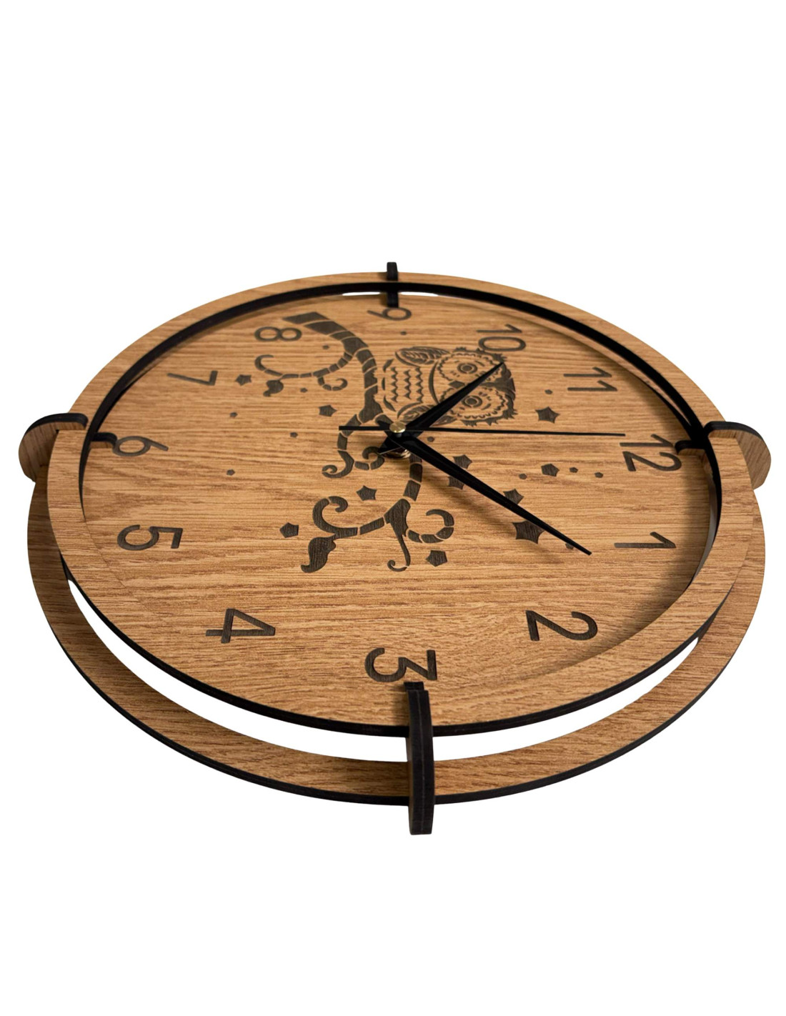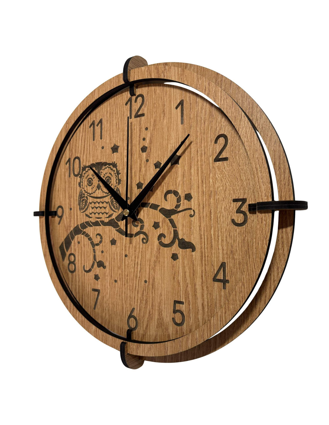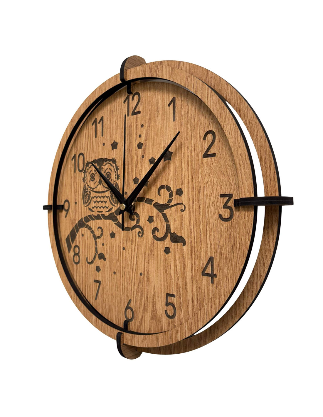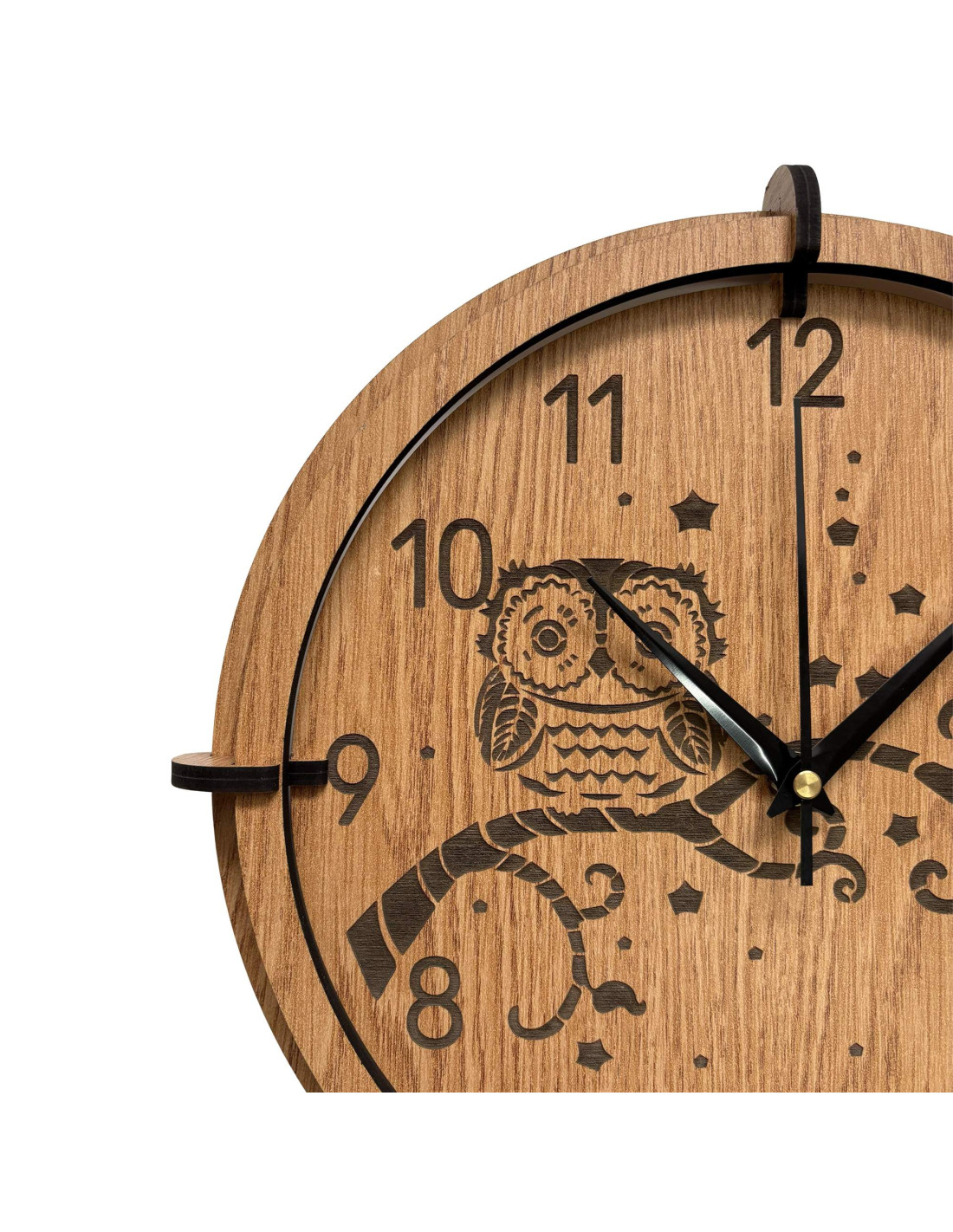 Eine moderne Wanduhr aus Holz mit einem detailreichen, eingravierten Motiv einer Eule auf einem Ast und dem Nachthimmel bringt Ruhe, Gemütlichkeit und eine subtile natürliche Note in den Innenraum.