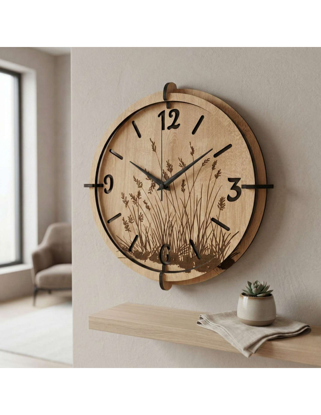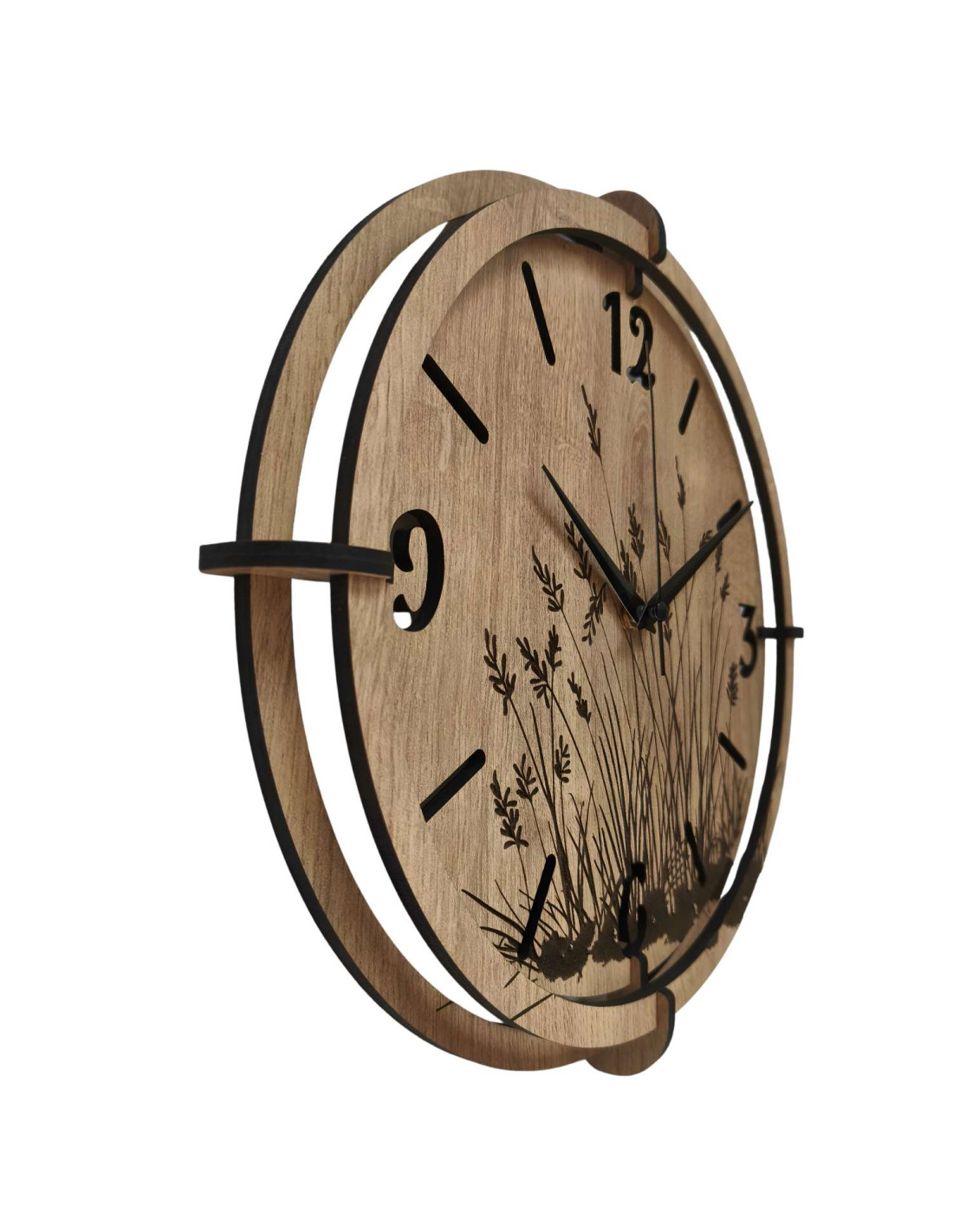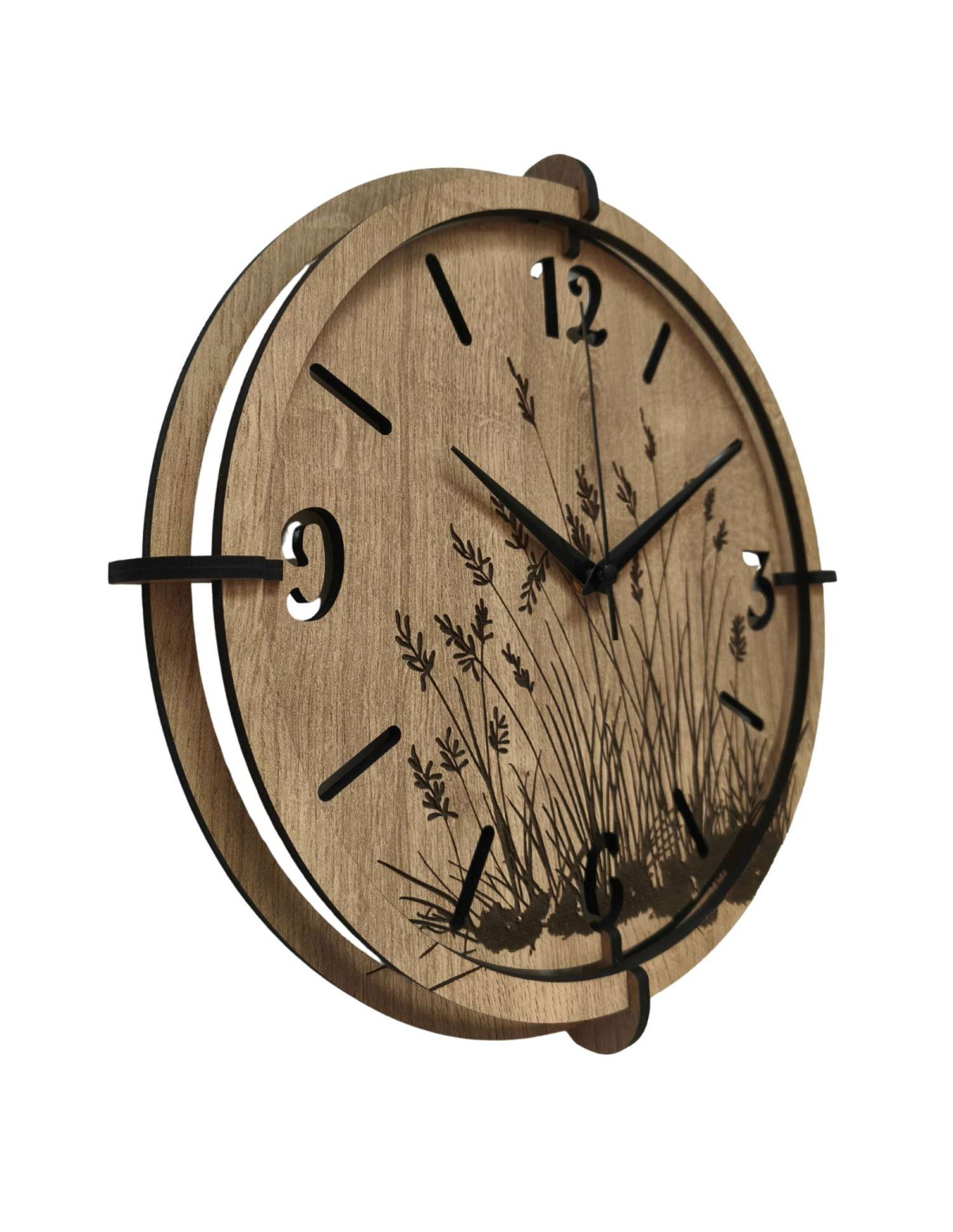 Moderne Wanduhren aus Holz mit einem filigranen, eingravierten Wiesenmotiv bringen Ruhe und Harmonie in den Innenraum.