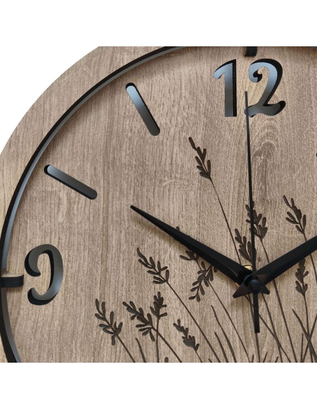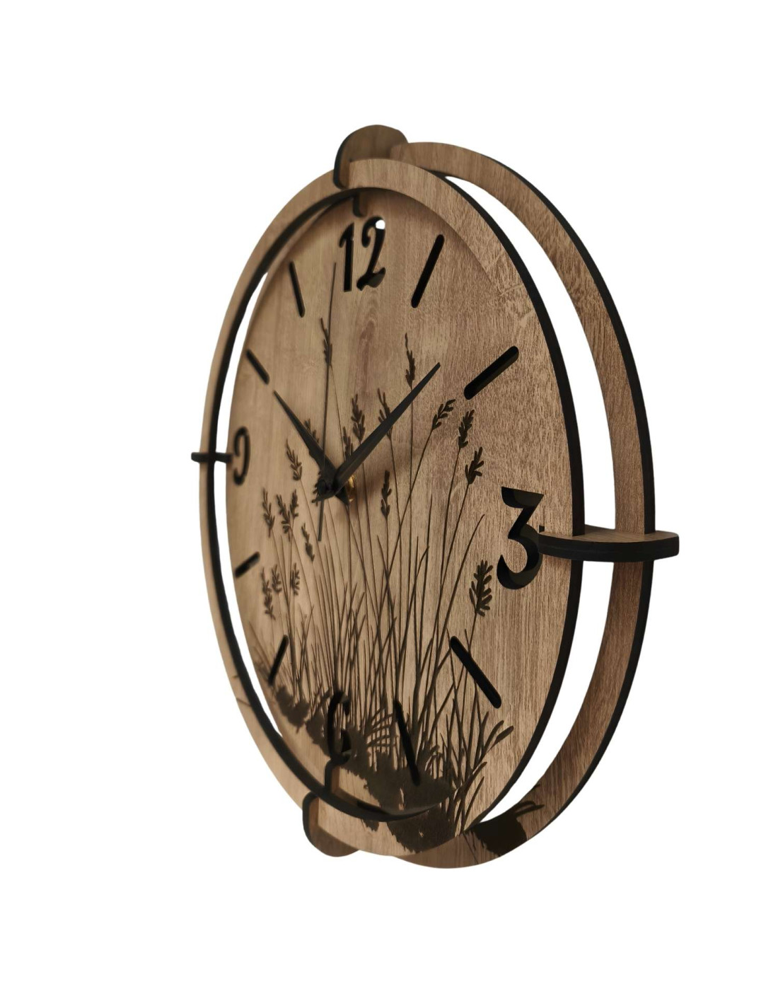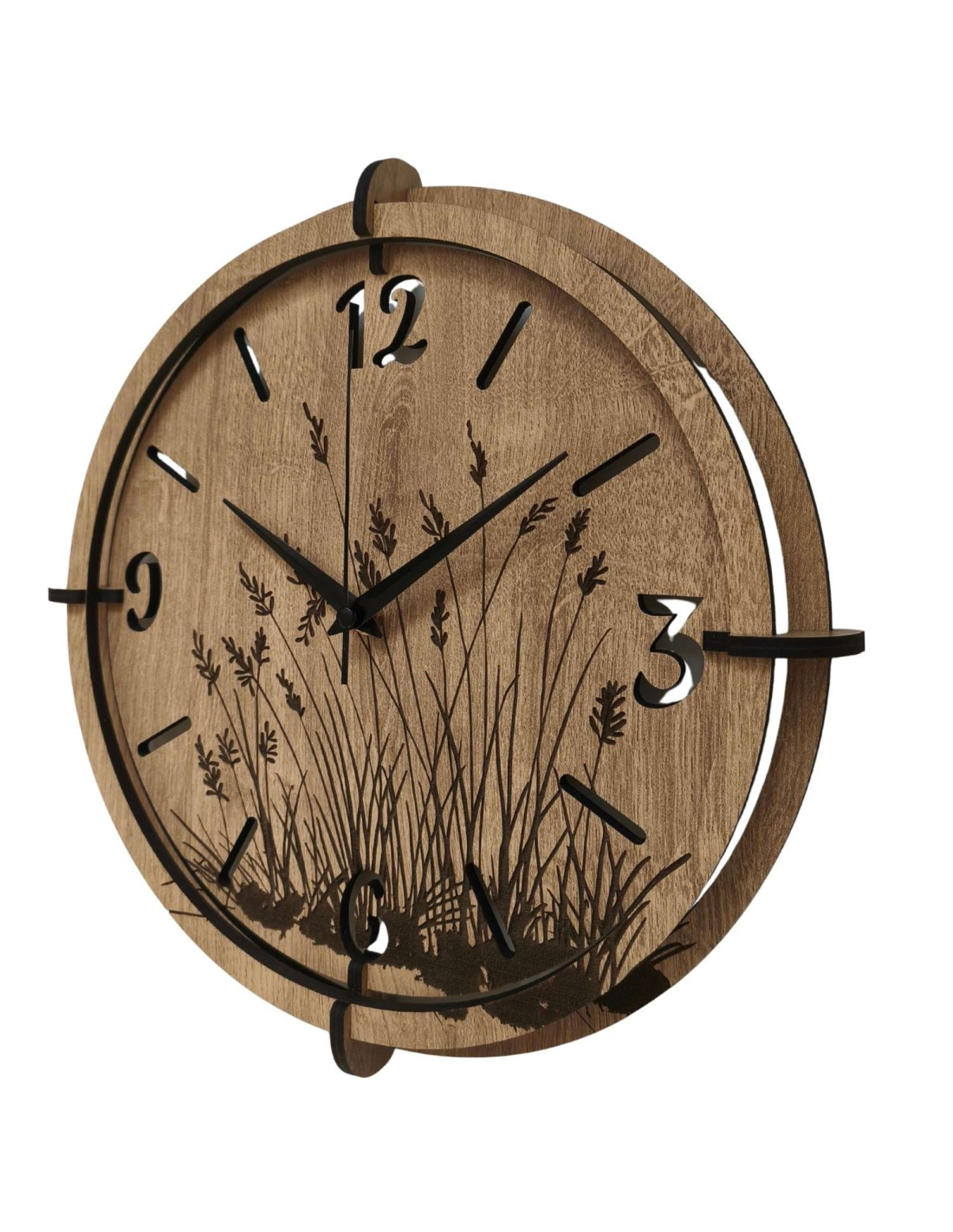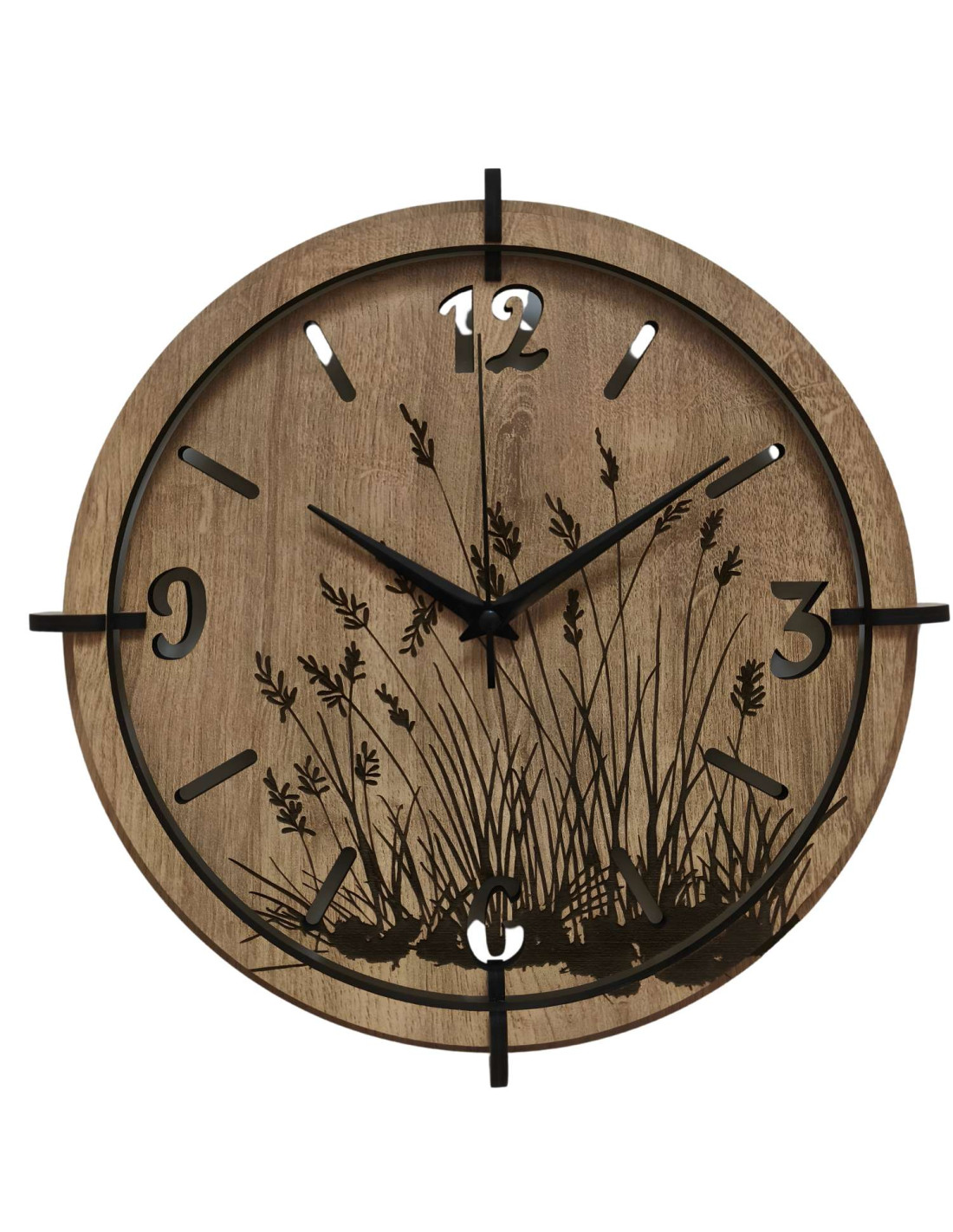 Moderne Wanduhren aus Holz mit einem filigranen, eingravierten Wiesenmotiv bringen Ruhe und Harmonie in den Innenraum.